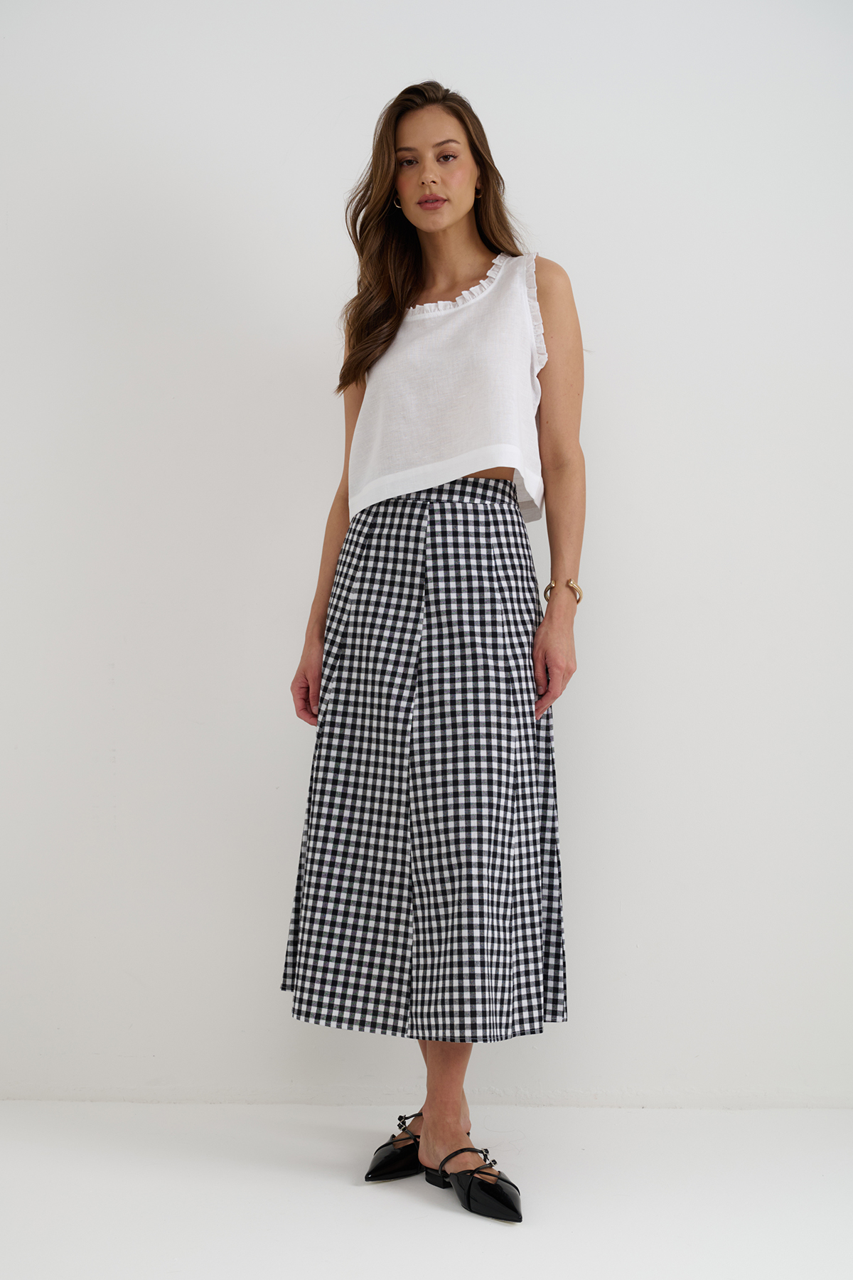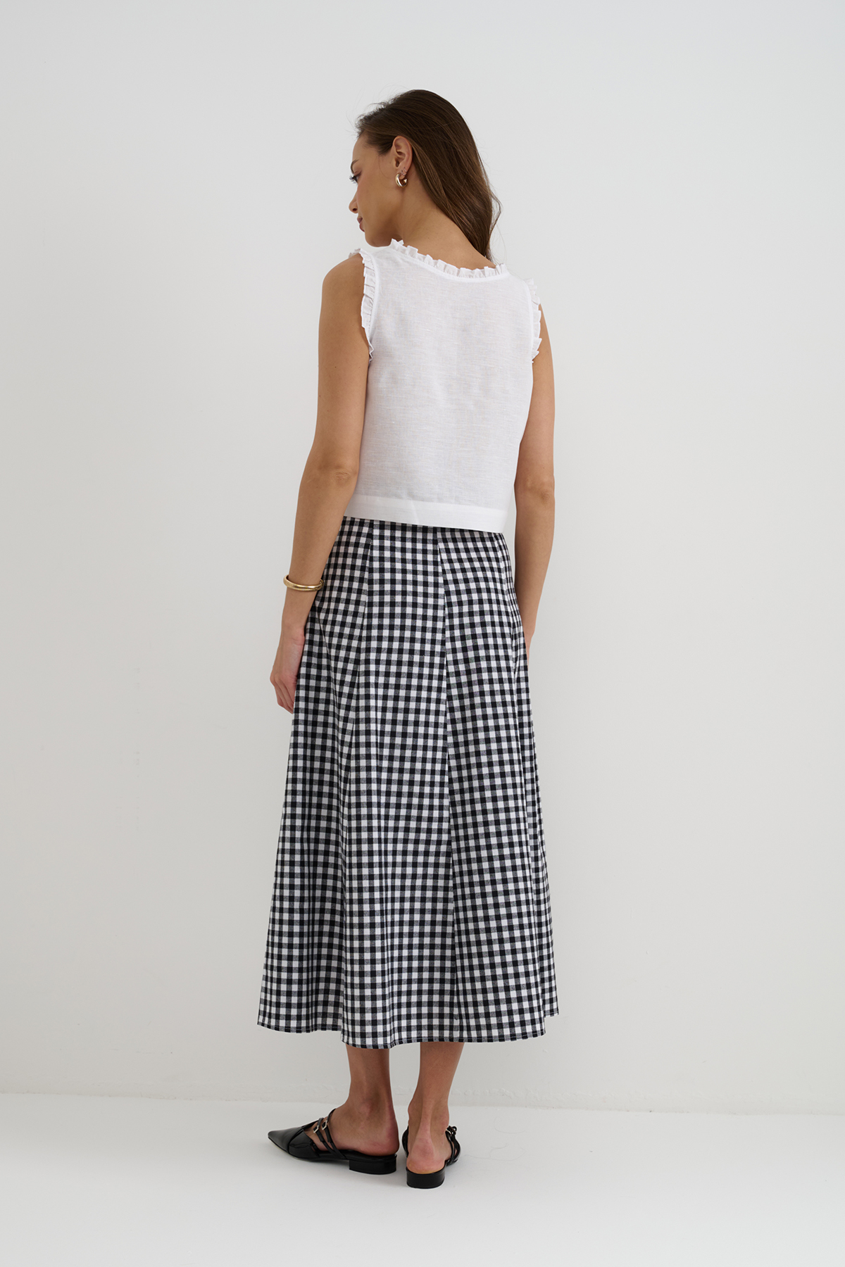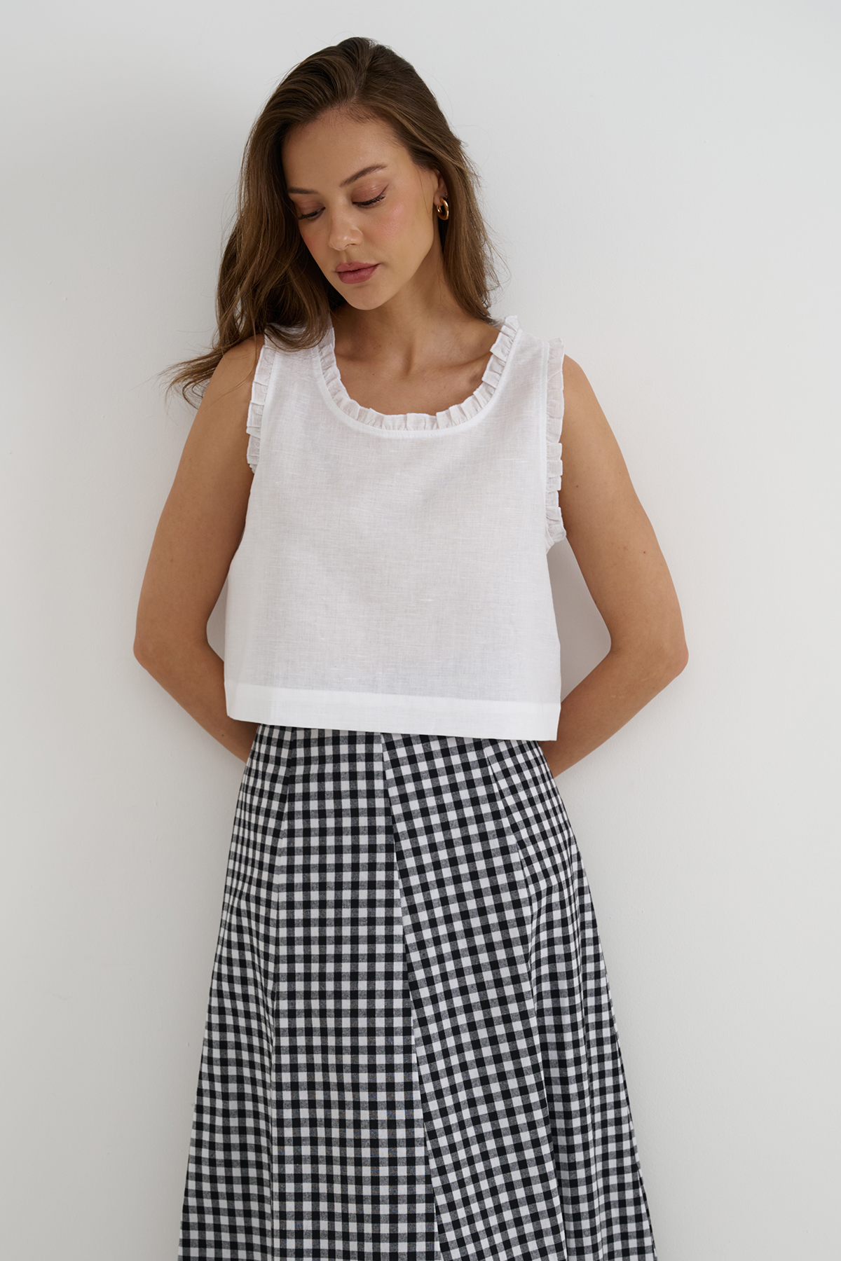 Льняной топ классического кроя на тонких бретелях, белого цвета. Топ немного расклешен расклешен к низу, по бокам разрезы, посадка свободная. Модель выполнена из 100% льна высокого качества. онкий длинноволокнистый лен особенно прочный, отлично пропускает воздух и впитывает влагу, что делает его идеальным выбором для гардероба. Сделано в России на собственном производстве.