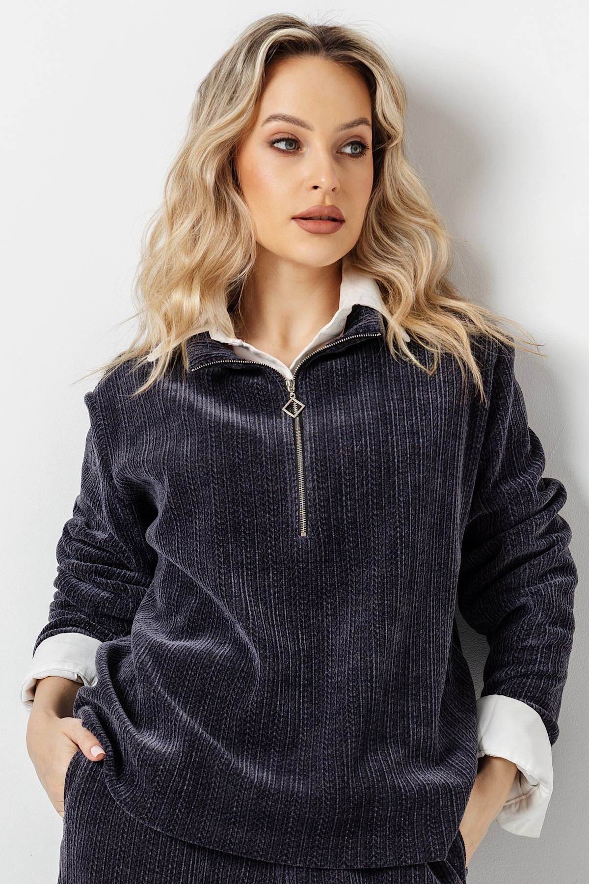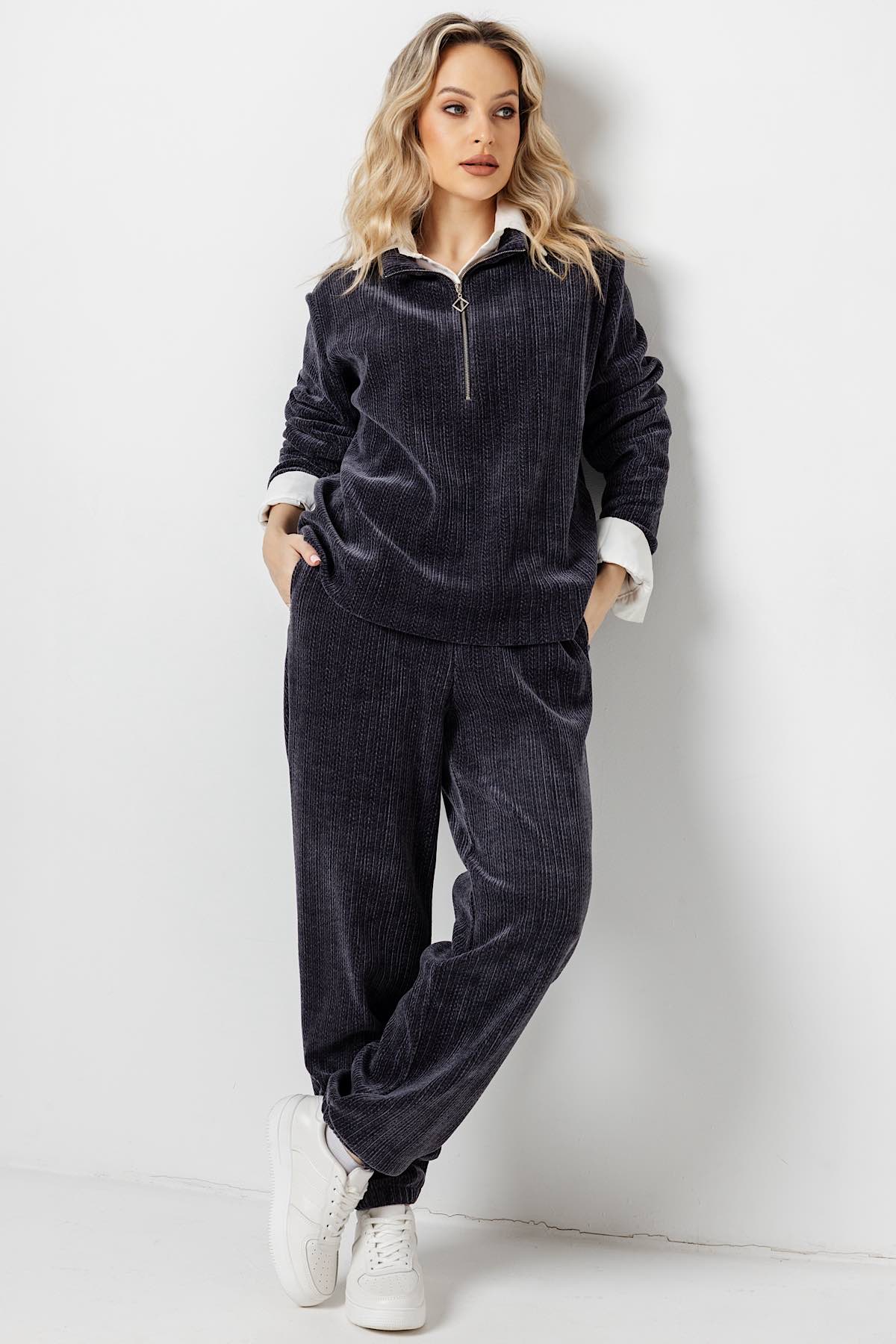 Описание: Блузка - толстовка из мягкого тактильно-приятного трикотажного вельвета. Хлопковая изнанка. Короткая функциональная молния из стойки. Спортивный трикотажный костюм из хлопкового вельвета. Материал - трикотажный вельвет приятен к телу, мягко ложится по любой фигуре, не вытягивается, не затирается в процессе эксплуатации. Комфортная посадка дарит уверенность и ощущение свободы.