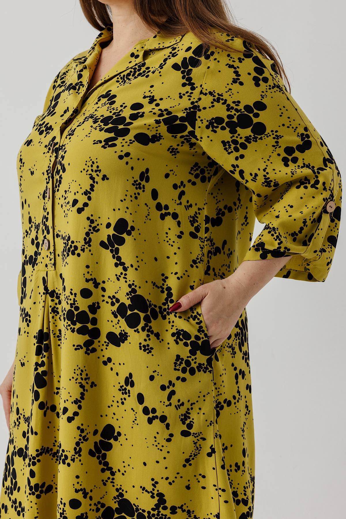 Описание: Летнее женское платье из штапеля с карманами. Женское платье из штапеля – идеальный выбор для женщин, стремящихся подчеркнуть свою элегантность и стиль в любой ситуации. Это платье прекрасно подходит как для повседневных образов, так и для более торжественных мероприятий: вечеринок, праздников и офисных встреч. Свободный крой не стесняет движений, обеспечивая комфорт на протяжении всего дня.Модель платья- А силуэт, что делает изделие универсальным. Отложной воротничок и планка с пуговицами придаёт платью классический вид, удлиненные рукава, которые фиксируются патами, добавляют интересный акцент и позволяют регулировать длину рукава по вашему желанию. Встречная складка под планкой спереди и на спинке придает свободу движения при этом сохраняют утонченный силуэт. размер 56-58