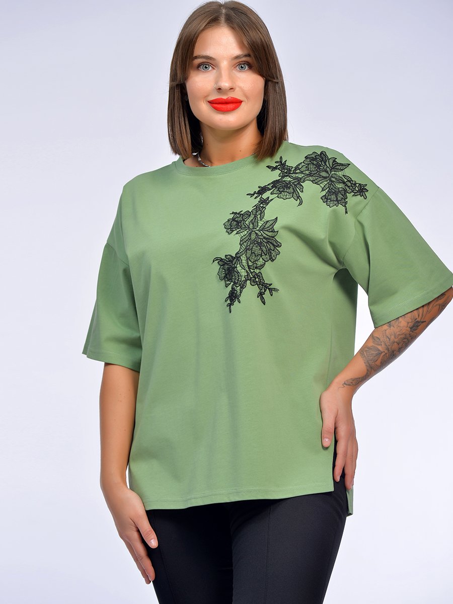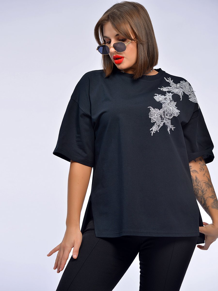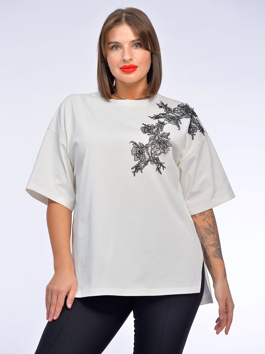 Комфортная нарядная футболка с ассиметричной длиной и кружевной апликацией. Состав 100% хлопок качества пенье, плотностью 220 г/м2 , он держит форму, не просвечивает, не заламывается, не пилингуется. Модель свободного прямого силуэта с конструктивными разрезами в боковых швах. Разрезы добавляют динамику силуэту, а так же визуально вытягивают пропорции фигуры, облегчая нижнюю часть изделия. Комфортная длина футболки сохраняет современный городской вид. Спущенная линия плеча, просторная пройма, широкий рукав- идеальное конструктивное решение для больших размеров. Главная фишка модели-цветочная кружевная апликация на плече с переходом на грудь. Ажурное кружево нашито по технологии, исключающей стягивание основного трикотажа. Премиальное сочетание основного цвета модели и контрастного декора - делает футболку стильной дизайнерской вещью.