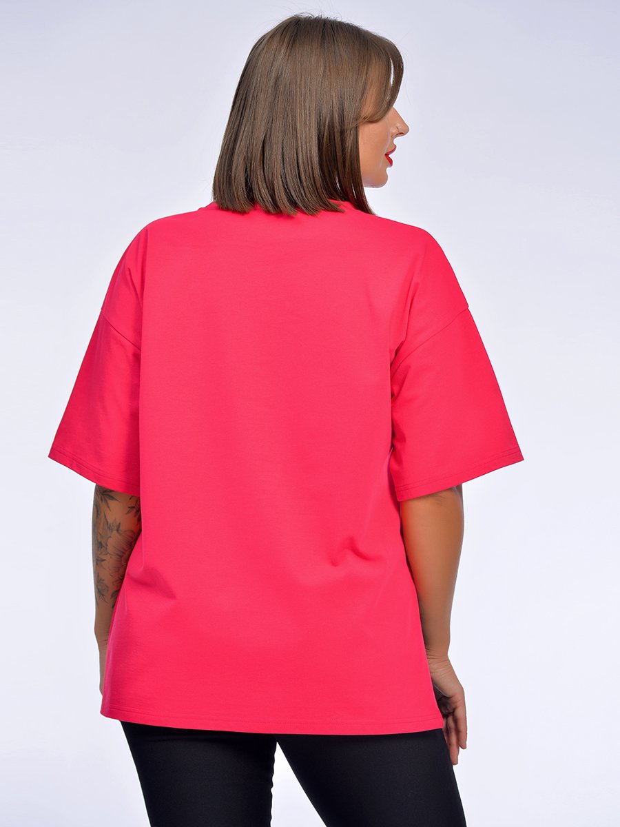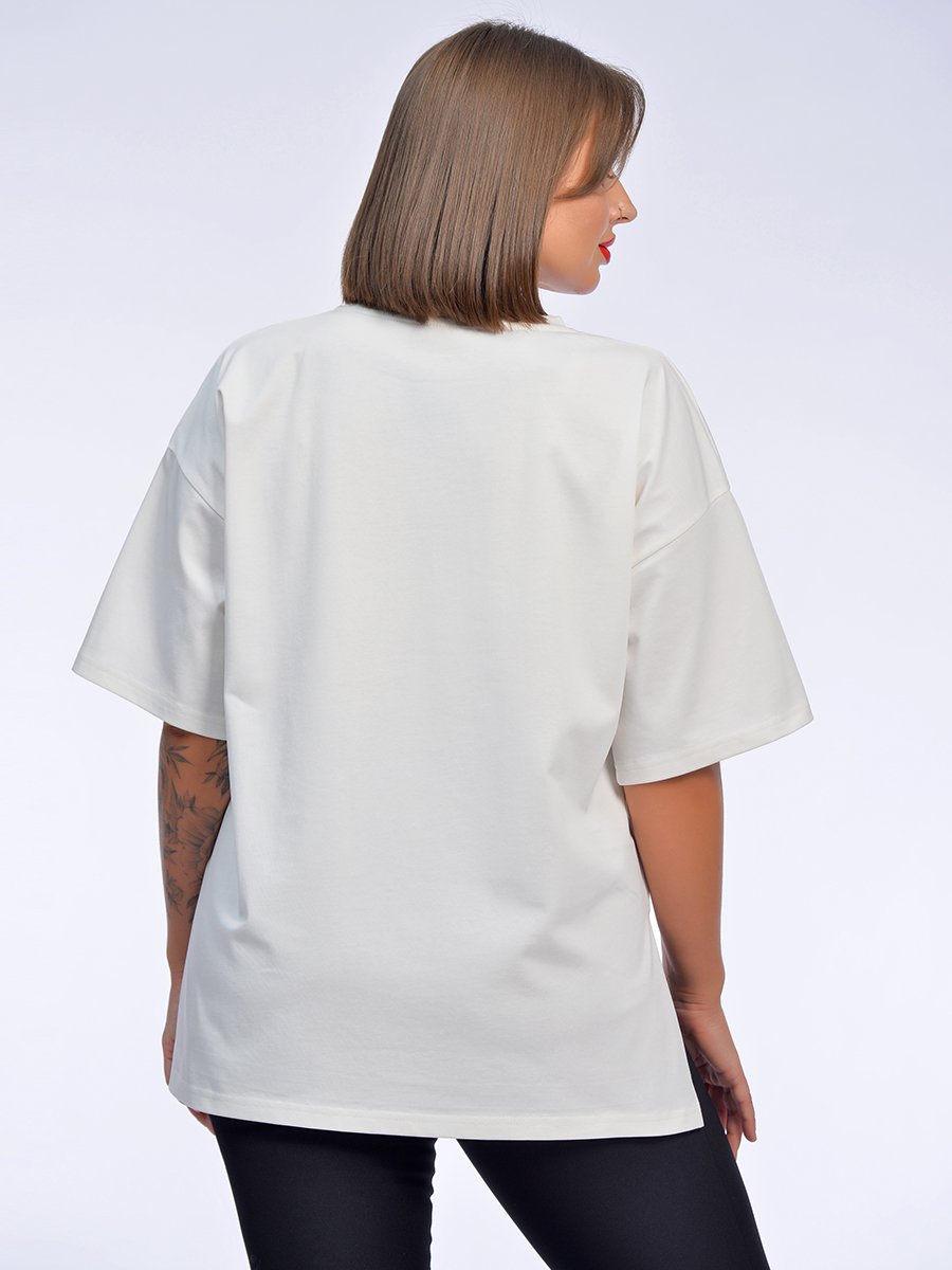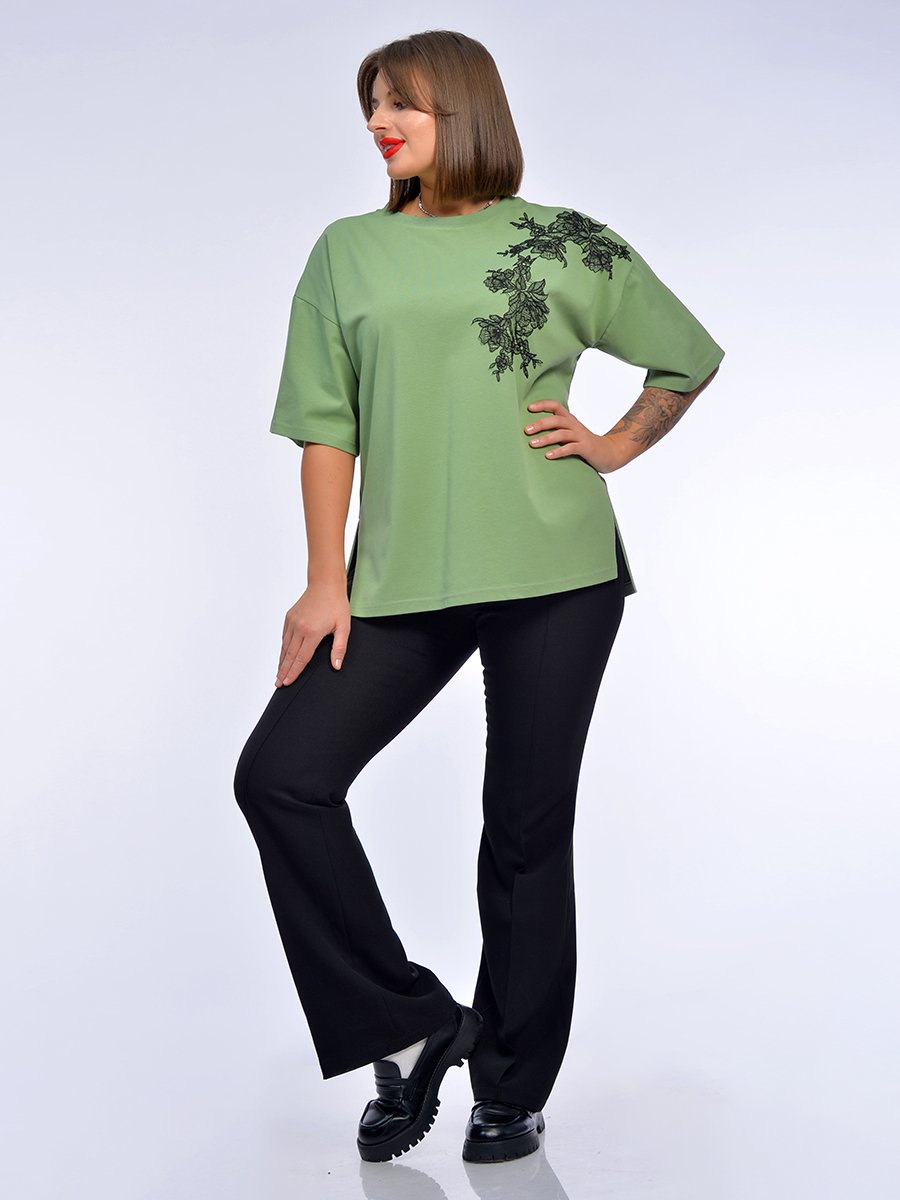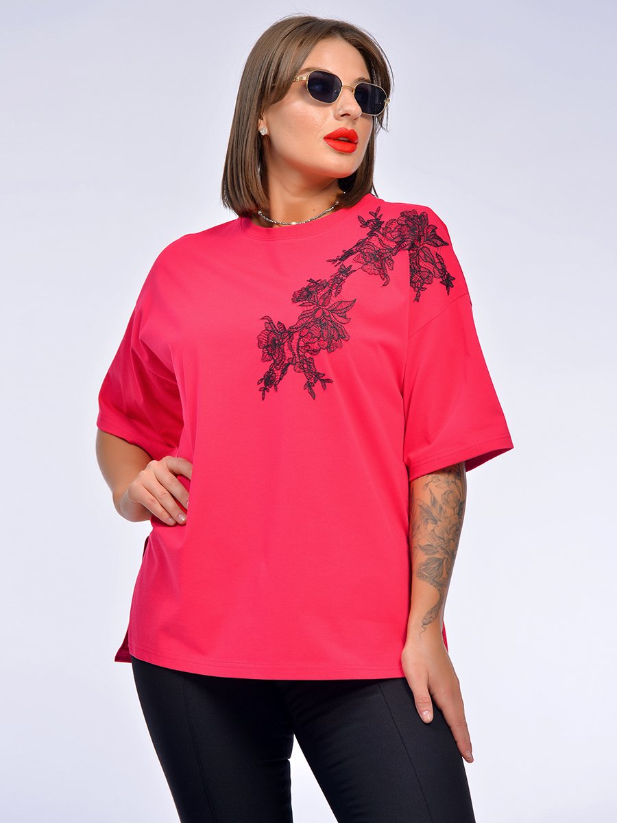 Комфортная нарядная футболка с ассиметричной длиной и кружевной апликацией. Состав 100% хлопок качества пенье, плотностью 220 г/м2 , он держит форму, не просвечивает, не заламывается, не пилингуется. Модель свободного прямого силуэта с конструктивными разрезами в боковых швах. Разрезы добавляют динамику силуэту, а так же визуально вытягивают пропорции фигуры, облегчая нижнюю часть изделия. Комфортная длина футболки сохраняет современный городской вид. Спущенная линия плеча, просторная пройма, широкий рукав- идеальное конструктивное решение для больших размеров. Главная фишка модели-цветочная кружевная апликация на плече с переходом на грудь. Ажурное кружево нашито по технологии, исключающей стягивание основного трикотажа. Премиальное сочетание основного цвета модели и контрастного декора - делает футболку стильной дизайнерской вещью.