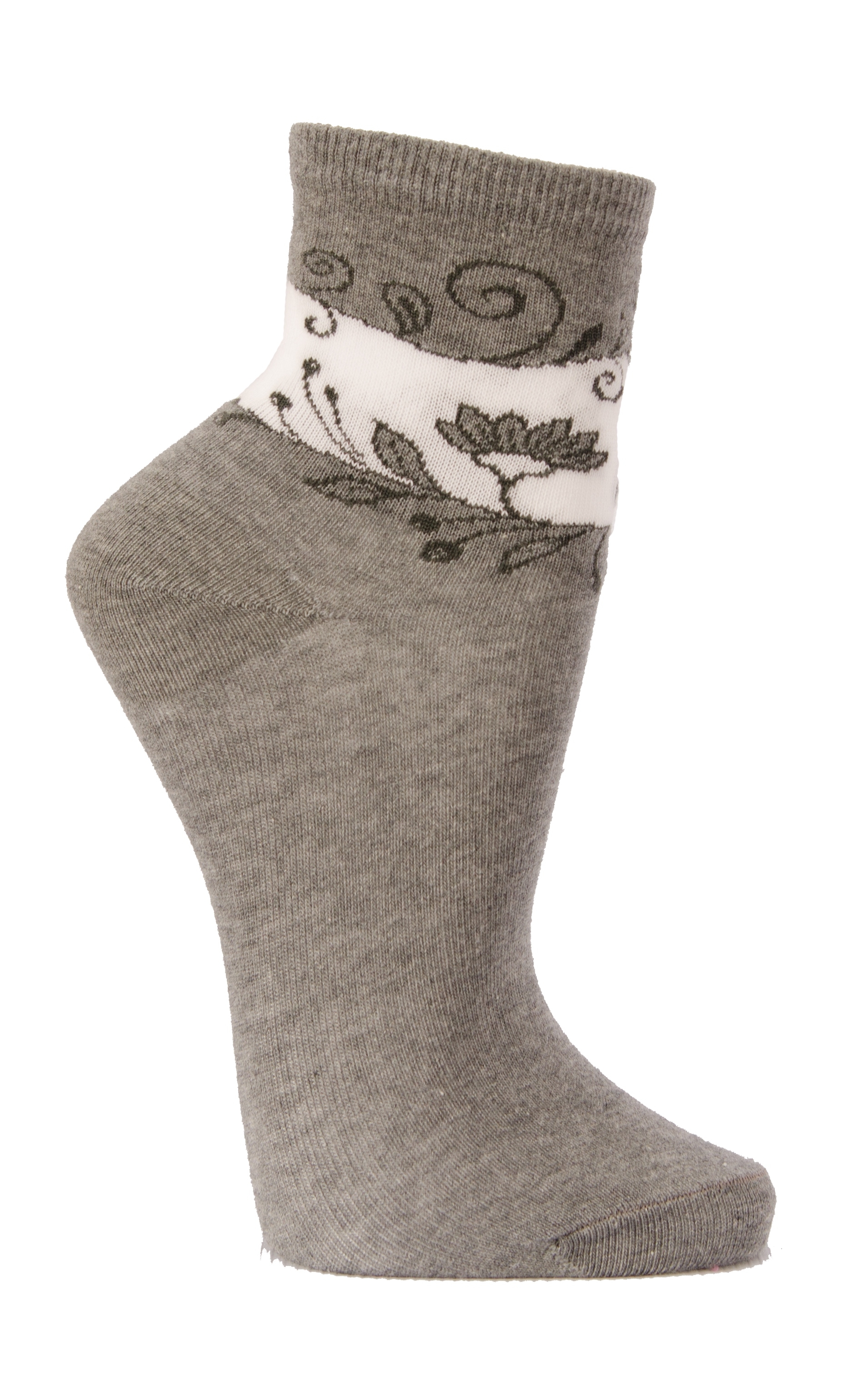 Демисезонный меланжевый носок с растительным рисунком на верхней части паголенка.