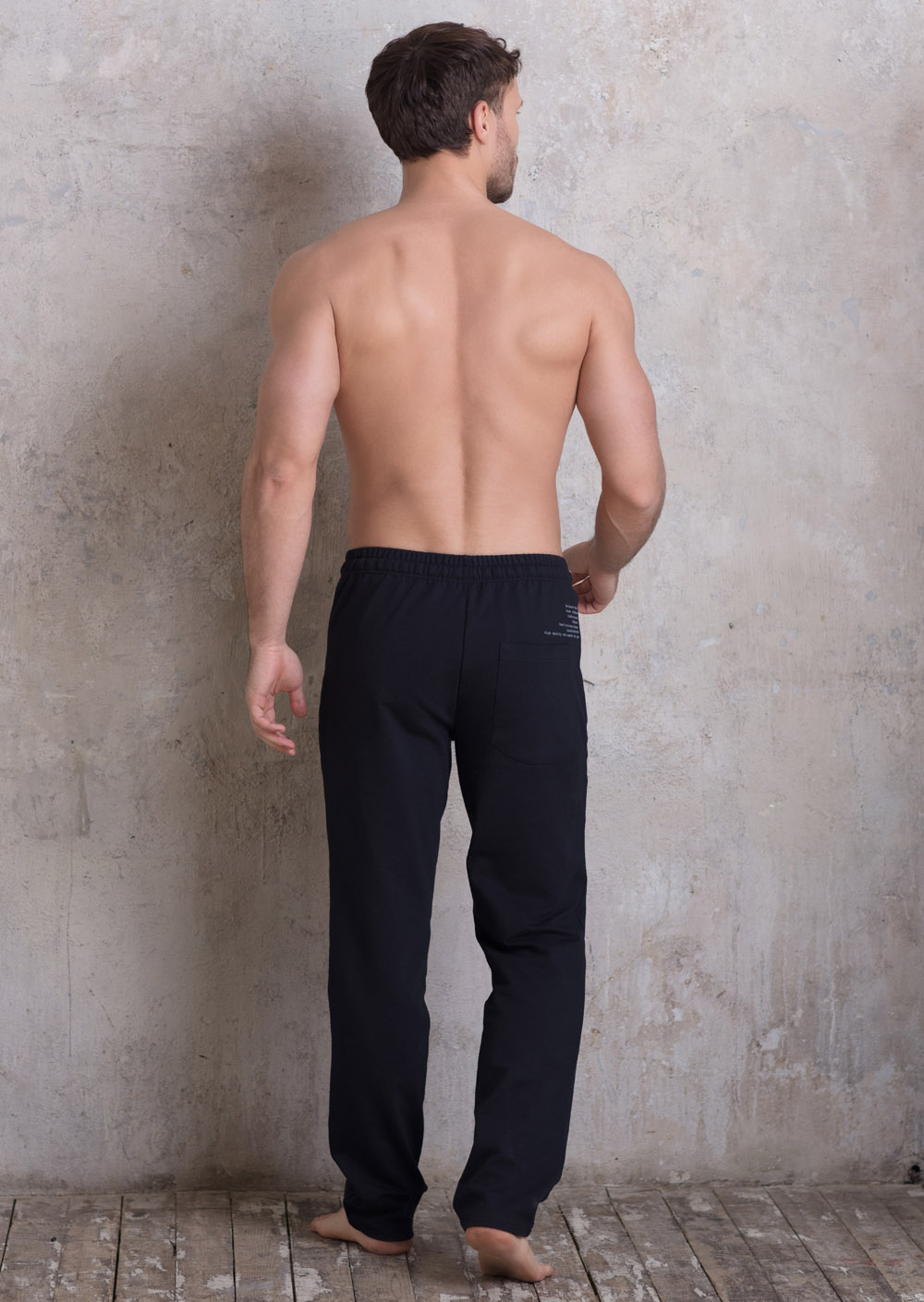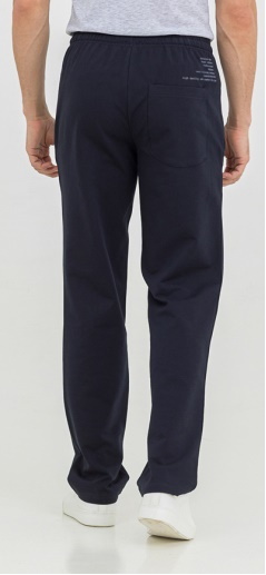 Мужские брюки из футера без начеса. Пояс цельнокроеный с резинкой и шнуром. Карманы наклонные на молниях. На задней детали накладной карман и принт.