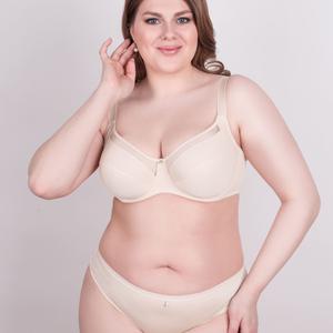 Классический бюстгальтер выполненный из эластичного полотна и трикотажного полотна. В верхней детали чашки вставка из эластичного сетчатого полотна. Модель на каркасах, мягкие чашки с двойным членением, боковая корректирующая деталь, расширенная бретель. Используется четырехрядная застежка, что позволяет идеально отрегулировать объем бюстгальтера. Ширина бретелей и застежки изменяется в зависимости от размера бюстгальтера. Отделка — подвеска.