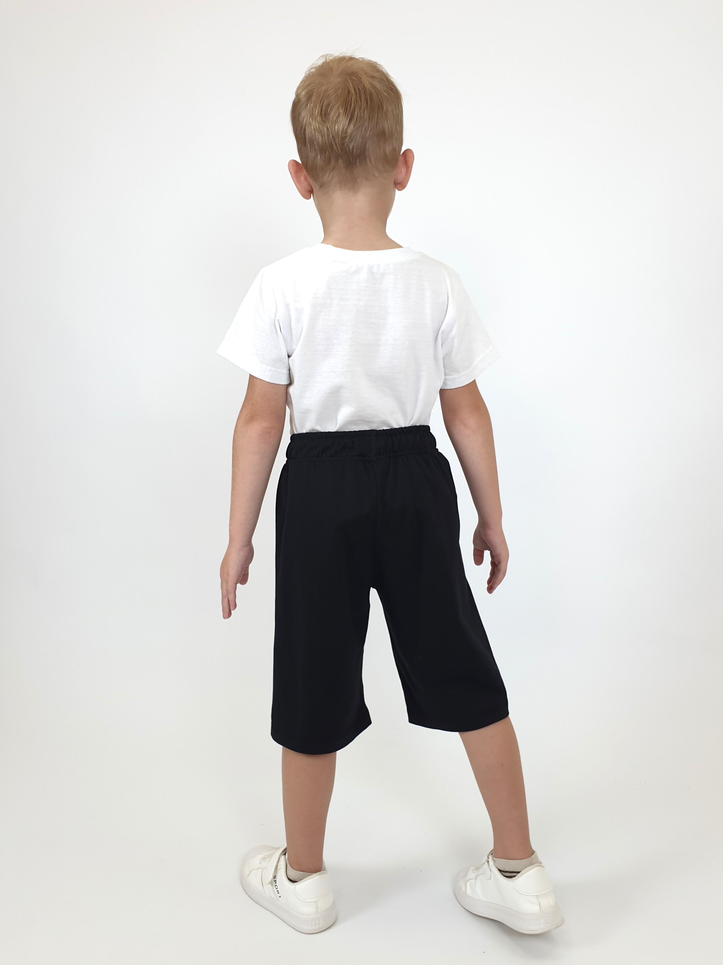 Прямые, удлиненные с печатью по левой передней половинке внизу. Пояс притачной с резинкой и шнуром.
