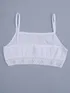 Топ для девочки, белого цвета, из х/б трикотажа. Низ топа отделан широким эластичным кружевом. Тонкие бретели и вырез из атласного, эластичного канта.