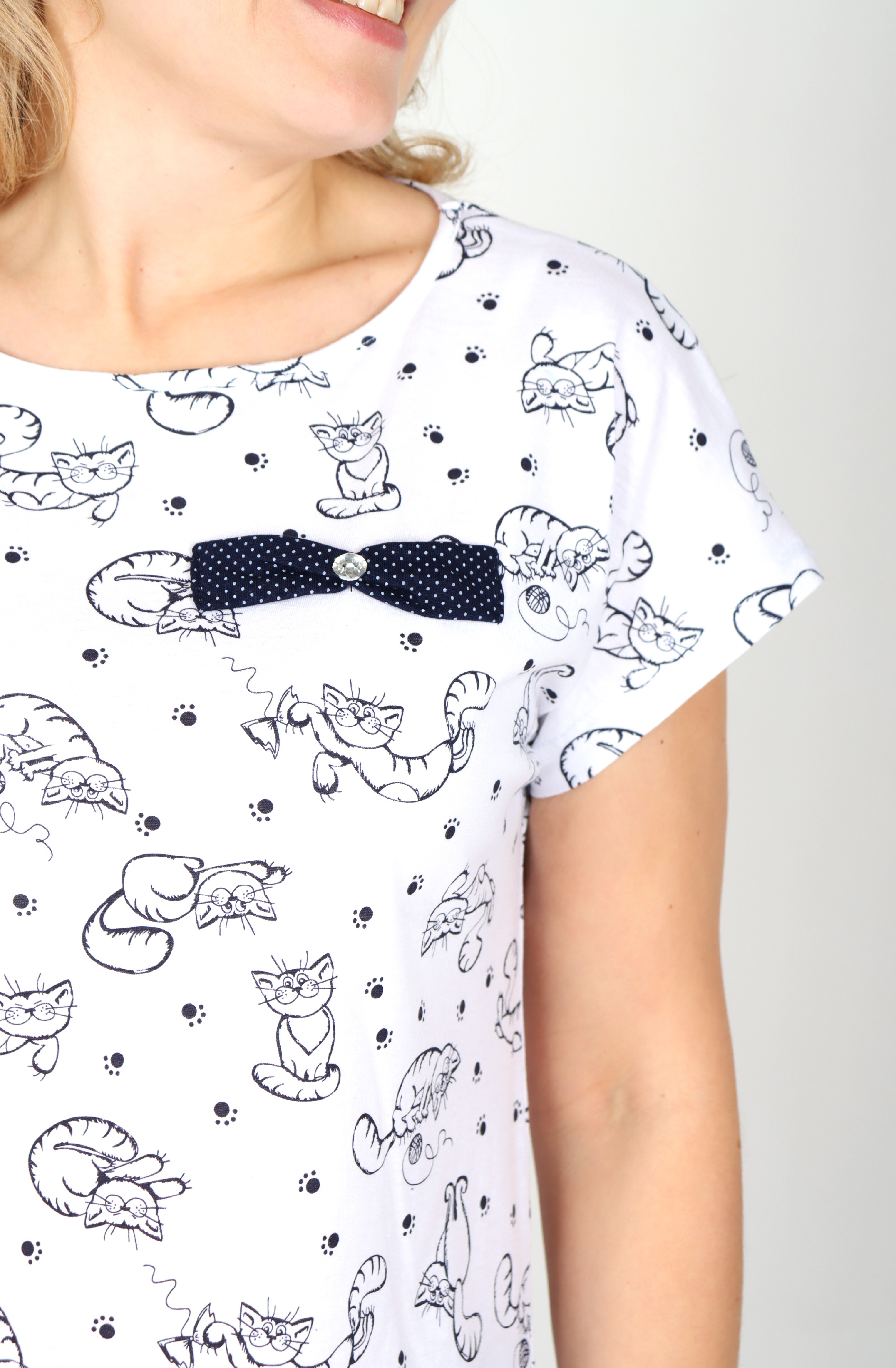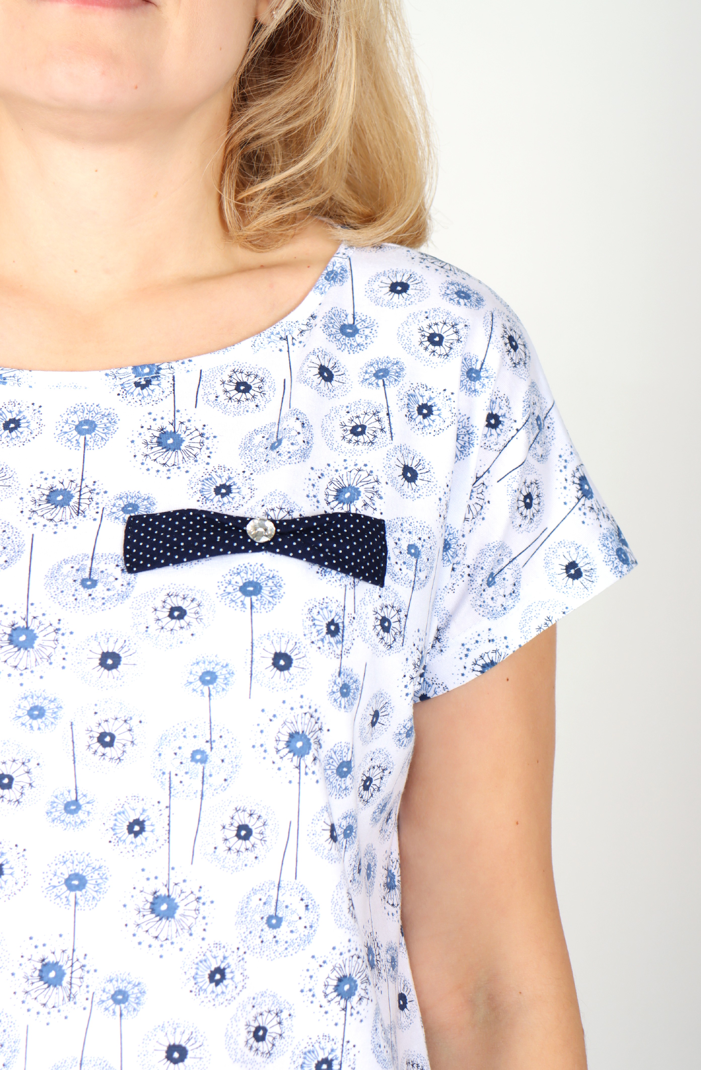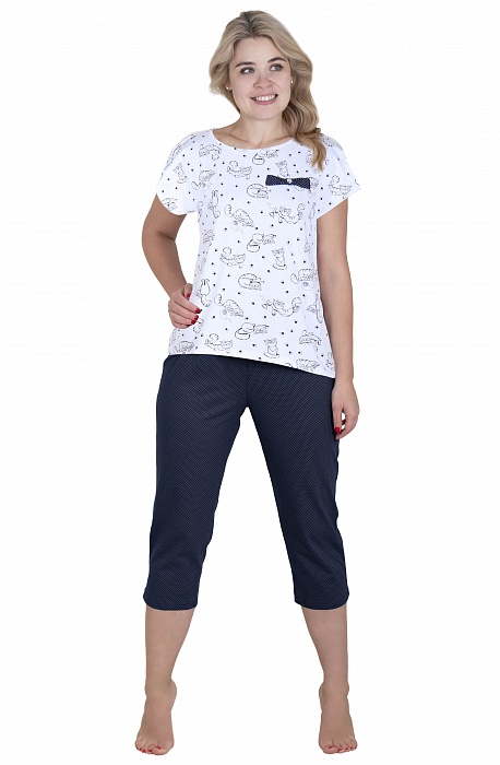 Нежный принт гармонично сочетается с набивным рисунком брюк, а декоративный бант вверху изделия создаст стильный легкий образ для домашнего отдыха.