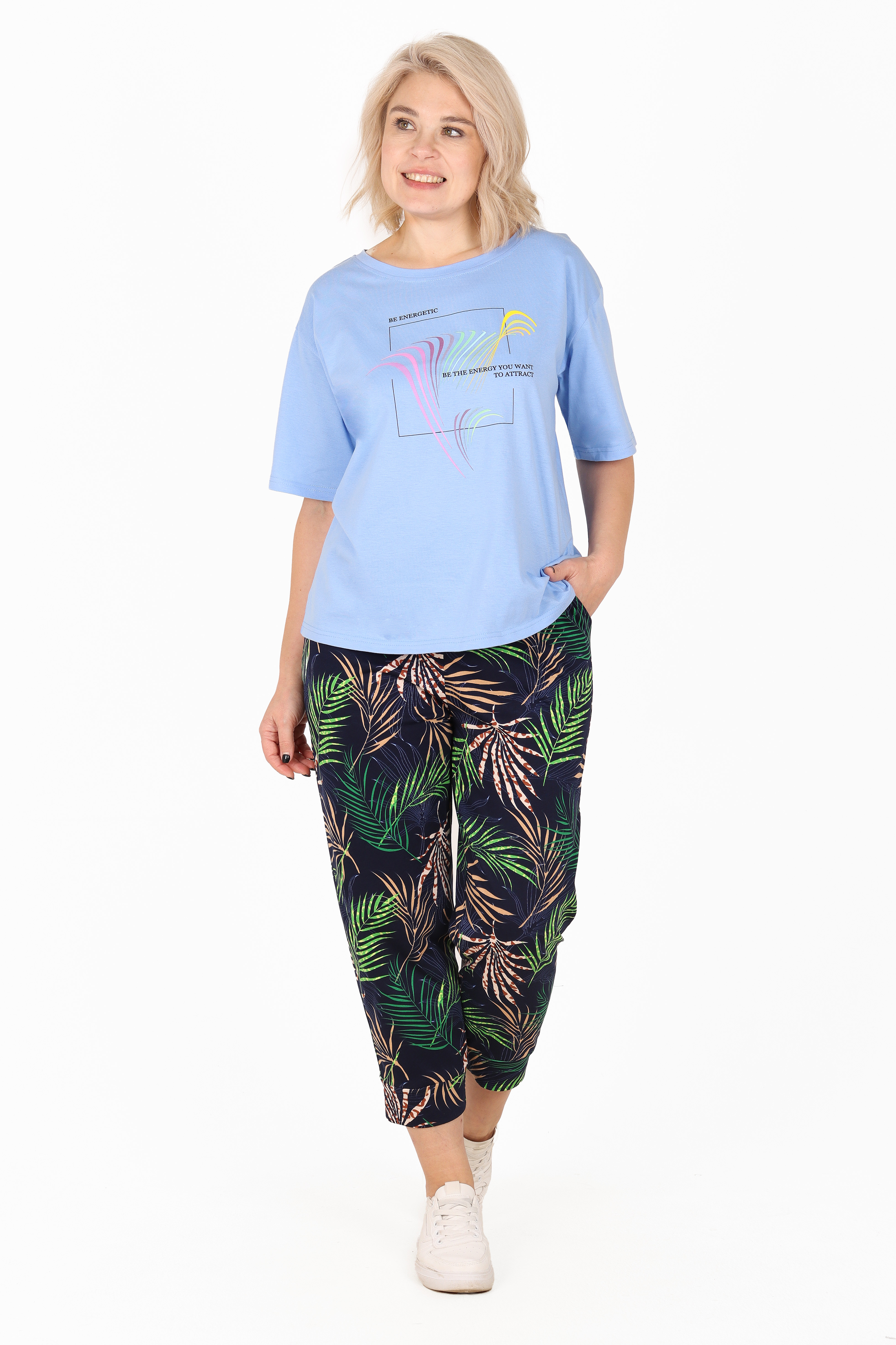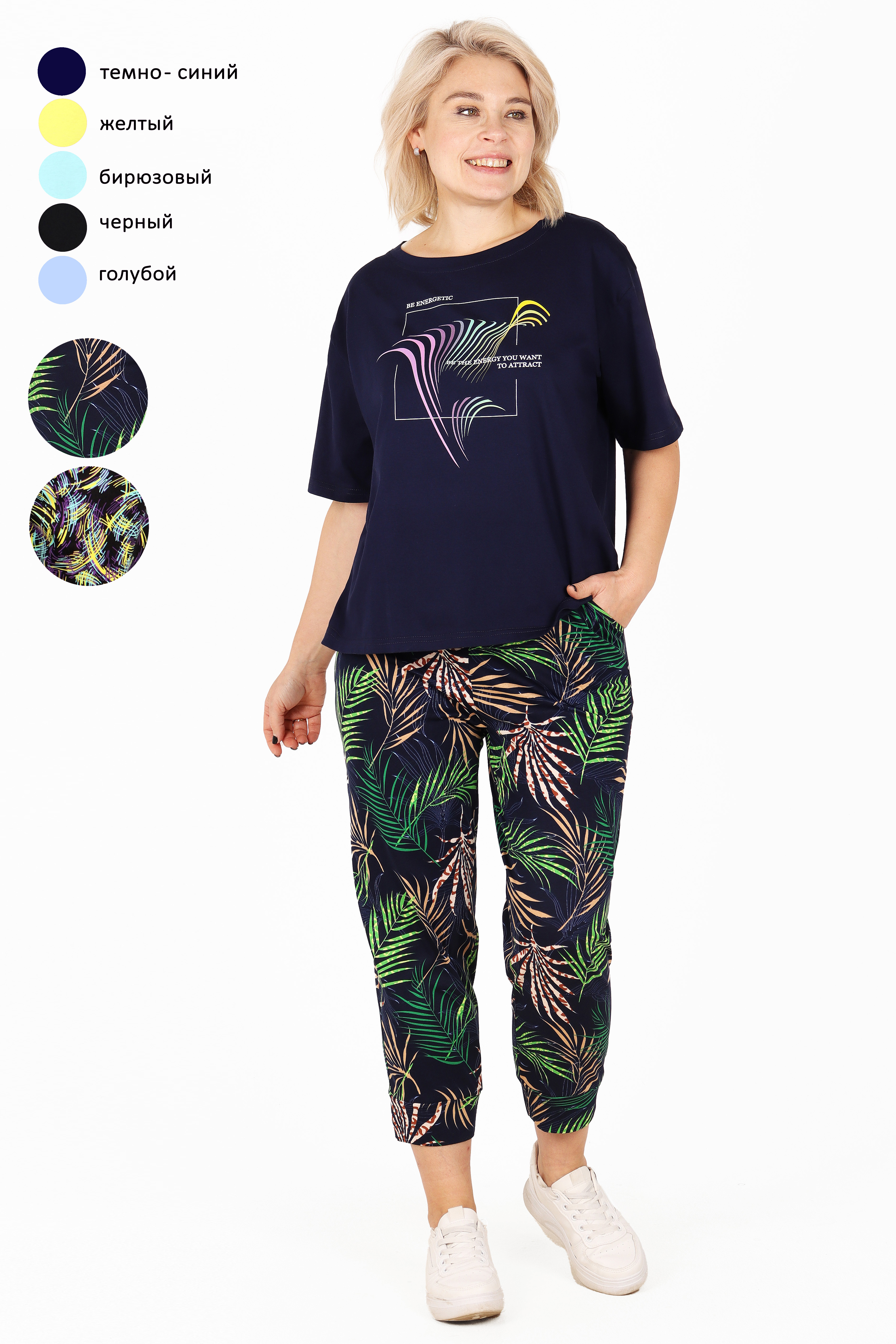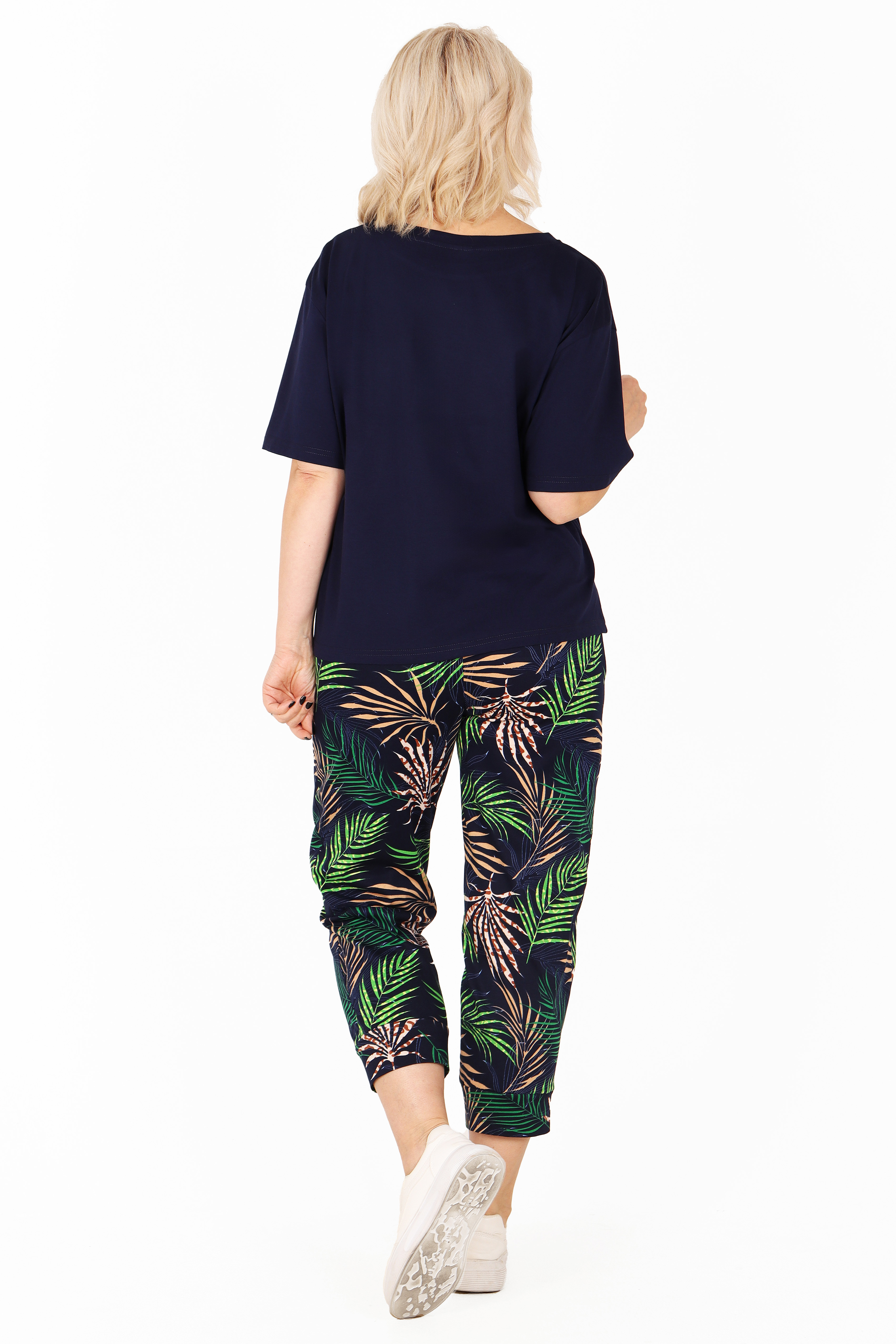 Набивные полотна брюк гармонично сочетаются с верхом костюма, создавая стильный образ для дома.