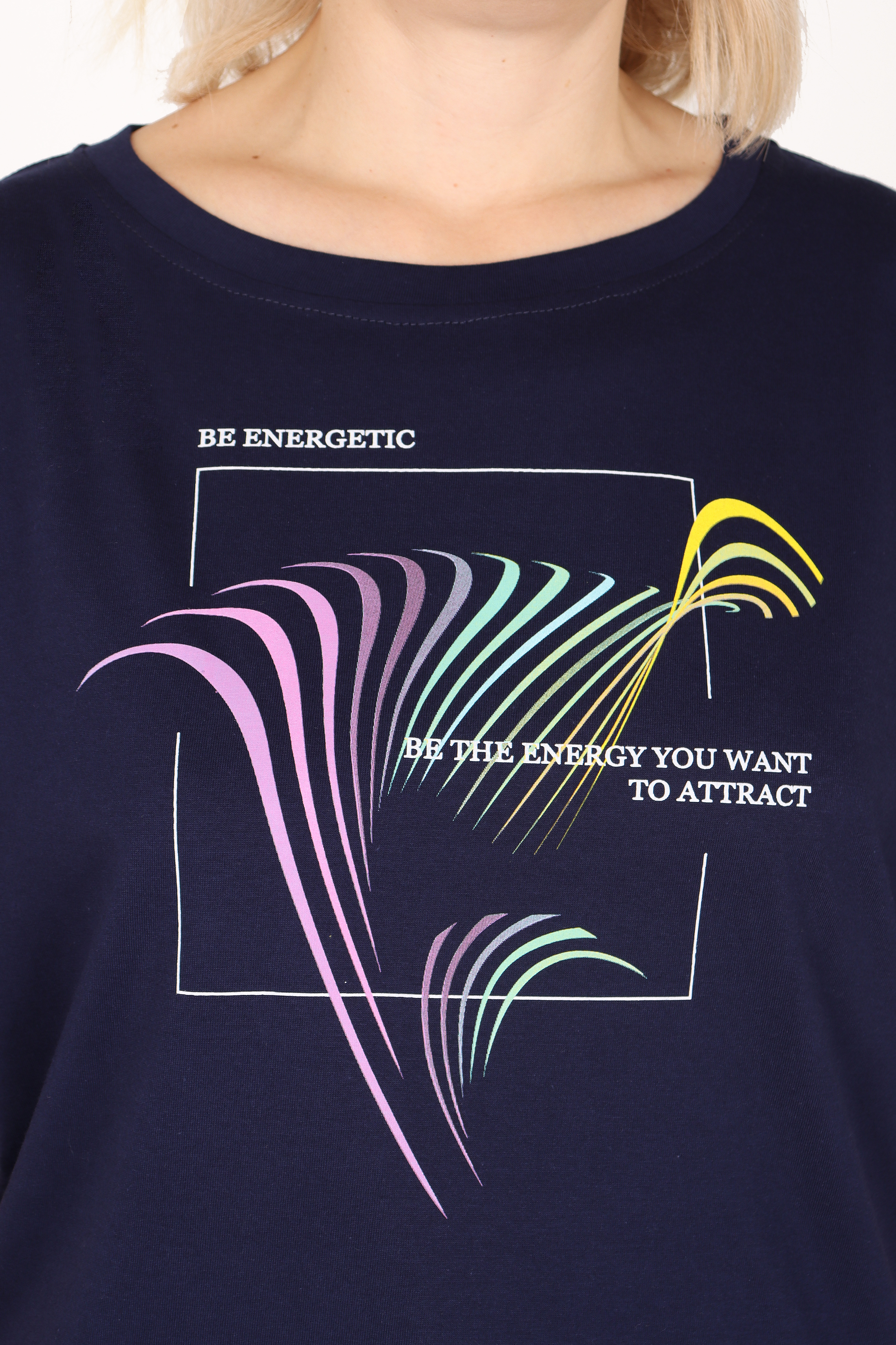 Футболку из однотонного полотна украшает модный принт, с изображением надписи и узоров.