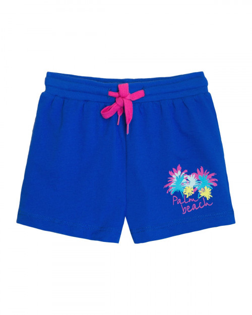 Шорты для девочки прямого силуэта из кулирки. Пояс отрезной в цвет изделия из кашкорсе с улягивающим шнурком. На передней половинке шорт принт.