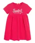 Платье для девочки А-силуэта с втачным коротким рукавом. Отрезное по линии талии. Горловина круглая обработана воротником из кулирки в цвет изделия. Юбка прямая с круговой сборкой по талии. На полочке принт с глиттером.