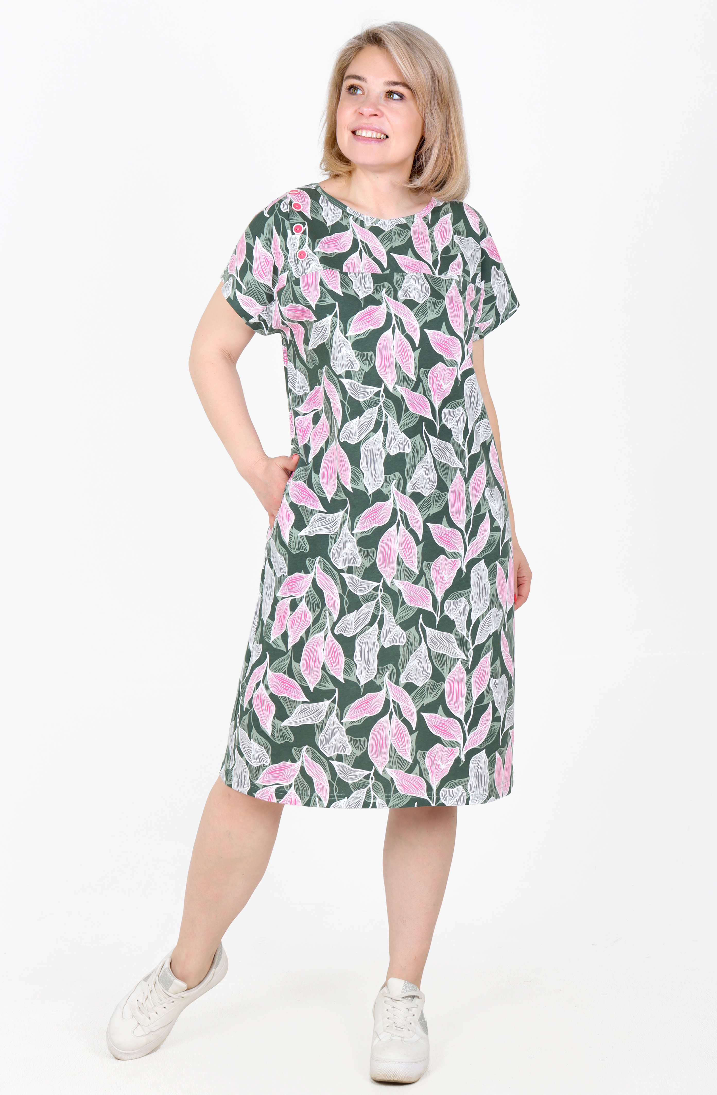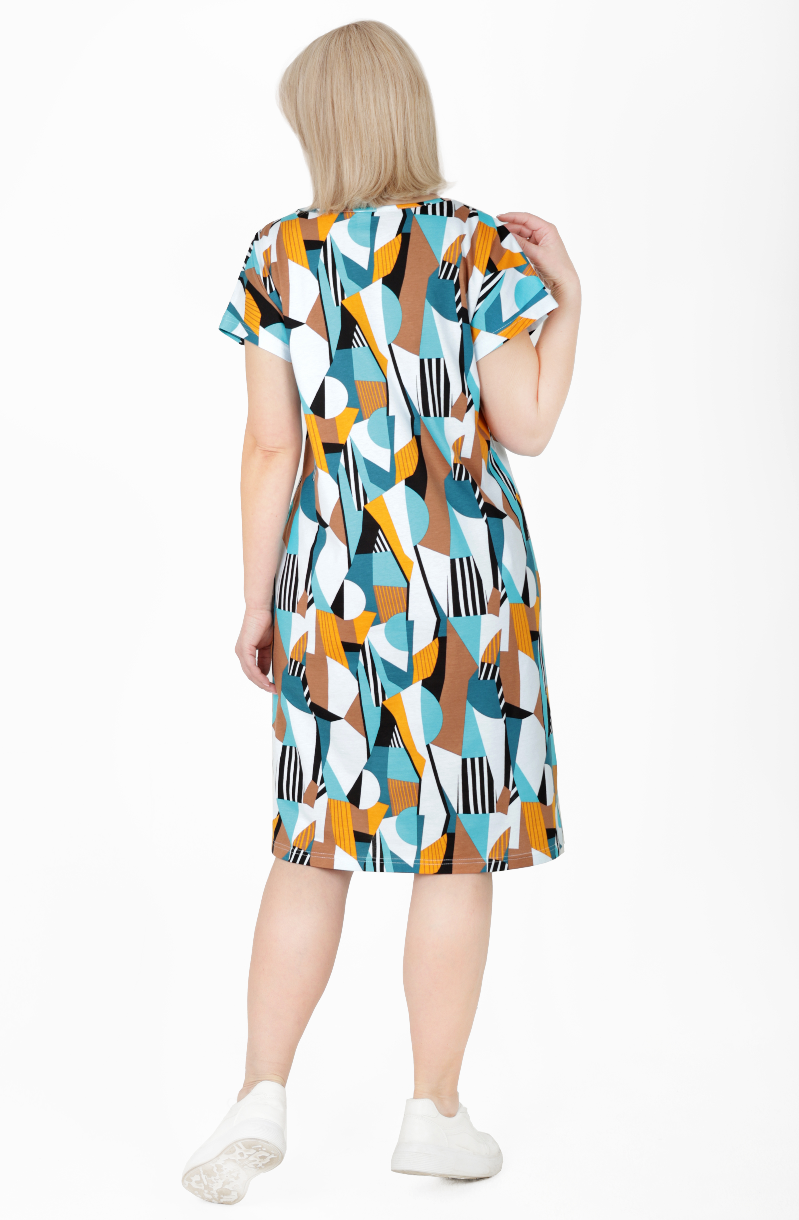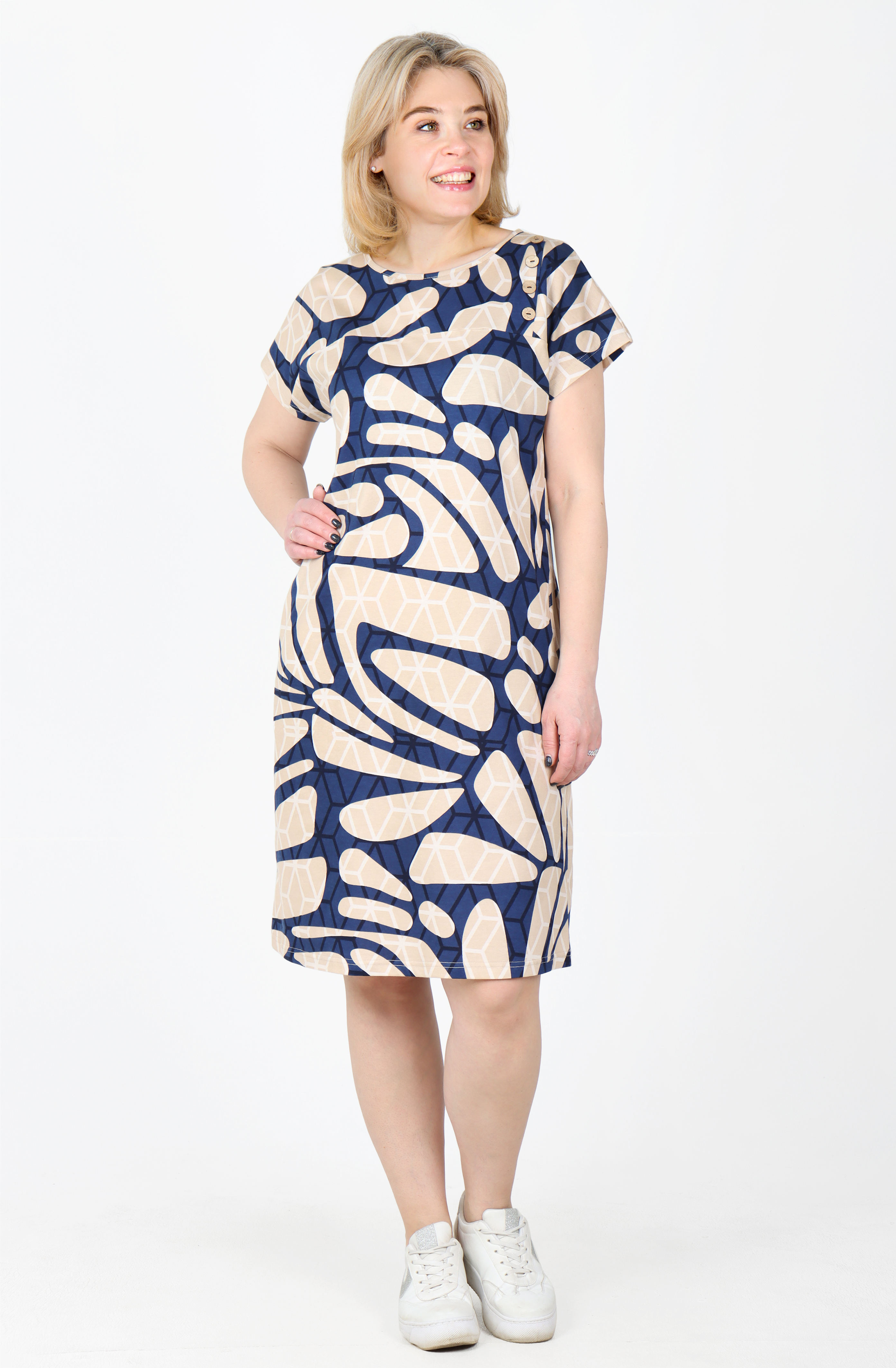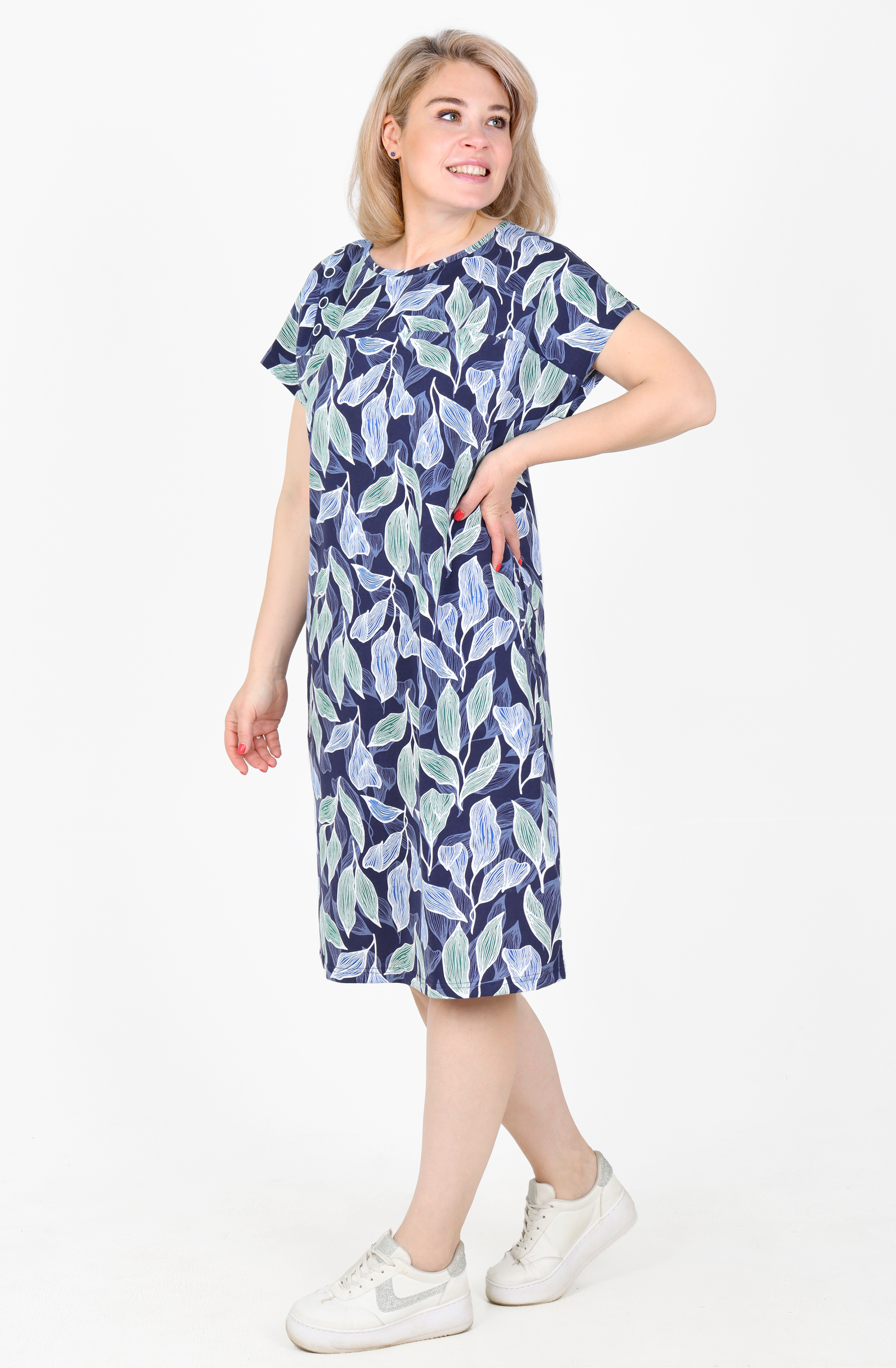 Туника из приятного к телу хлопка, с коротким спущенным рукавом, длина немного ниже колена.