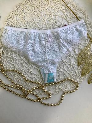 Трусы – бразильяна со средней посадкой. Передняя деталь выполнена из трикотажного полотна, задняя - кружевная. Это придаёт женским формам особую соблазнительность. Края ножек и пояса обработаны кантом с ажурным краем.
