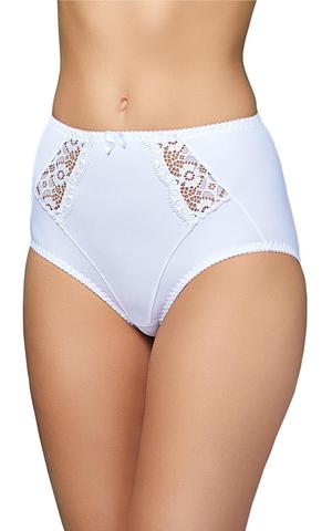 Трусы с высокой линией талии из полиамидного микроволокна. По бокам небольшие кружевные вставки. Срезы обработаны швом "зигзаг". Ластовица дублирована хлопком.