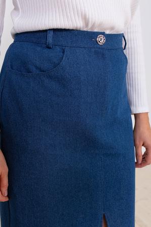 Юбка женская прямого силуэта из текстильного полотна. По талии притачной пояс. По середине переда разрез и застежка на молнию с пуговицей. На поясе имеются шлевки.