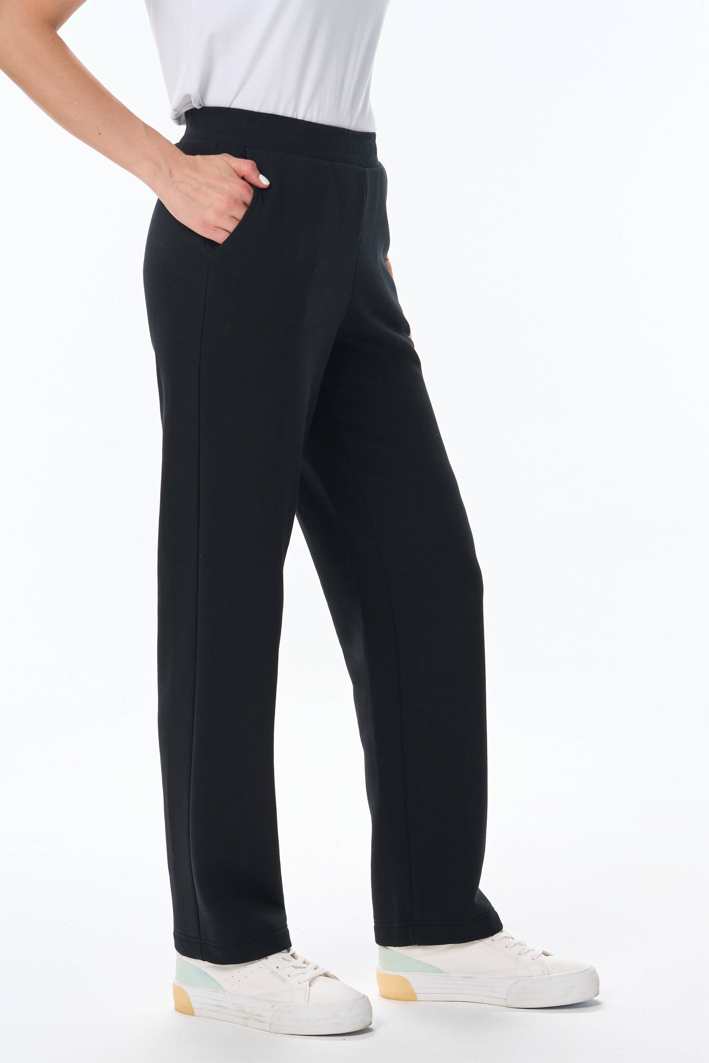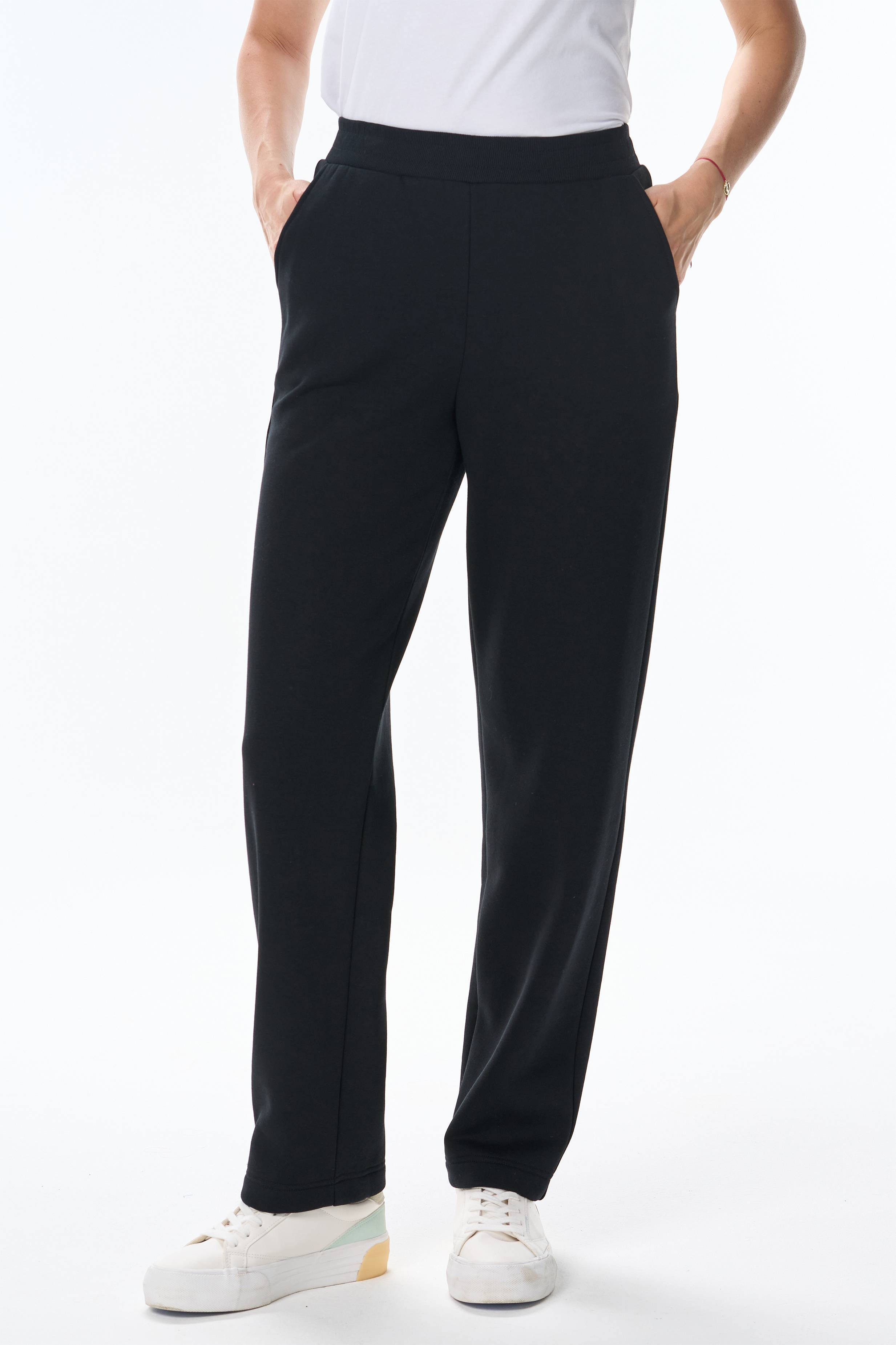 Описание: Стильные прямые брюки с карманами из хлопкового футера высокого качества 3-х нитки стриженный начес. Цельнокроеный пояс с эластичной лентой внутри. Длина брюк по боковом шву в 44 размере 107см. Рост модели на фото 177см.