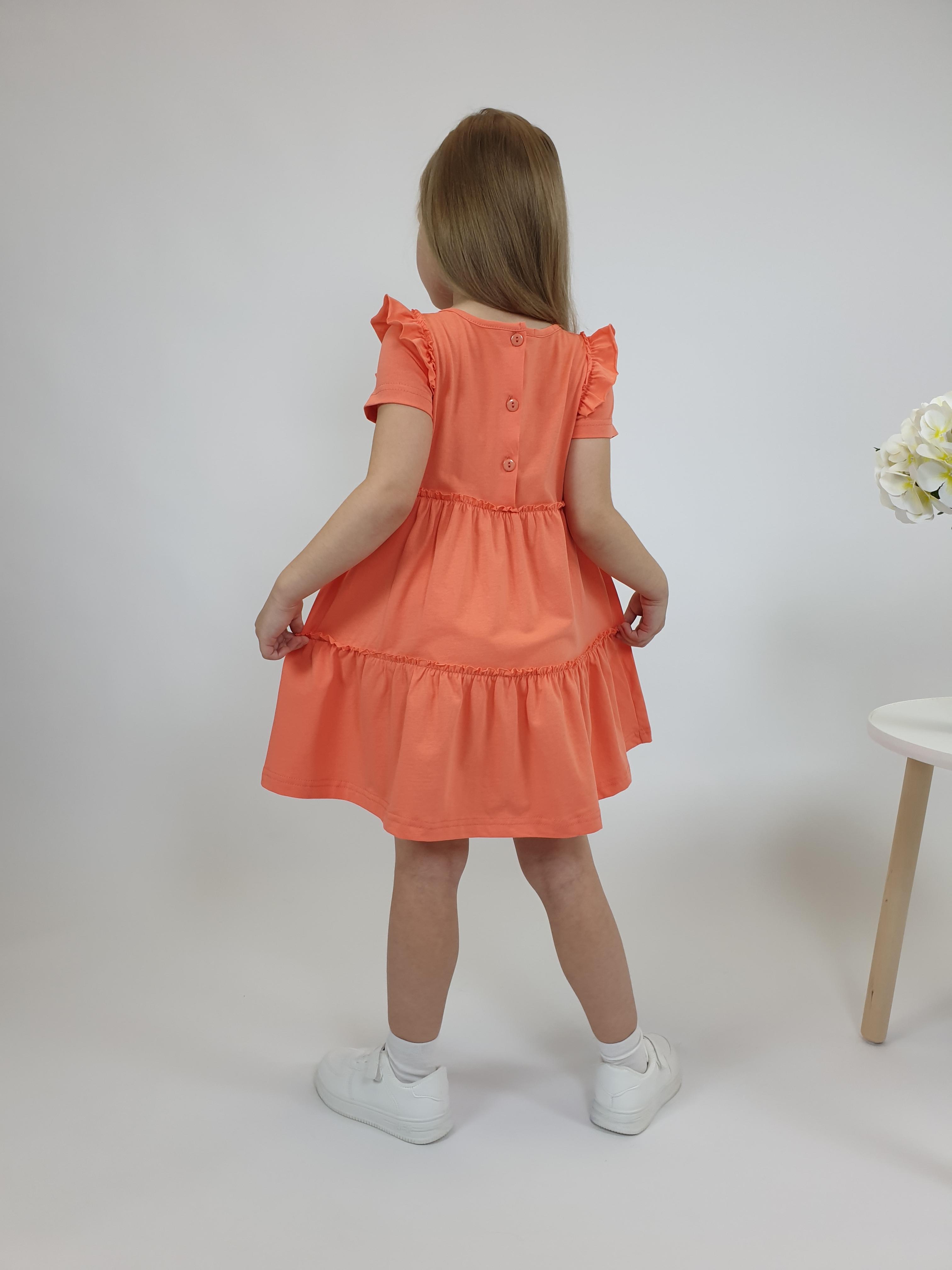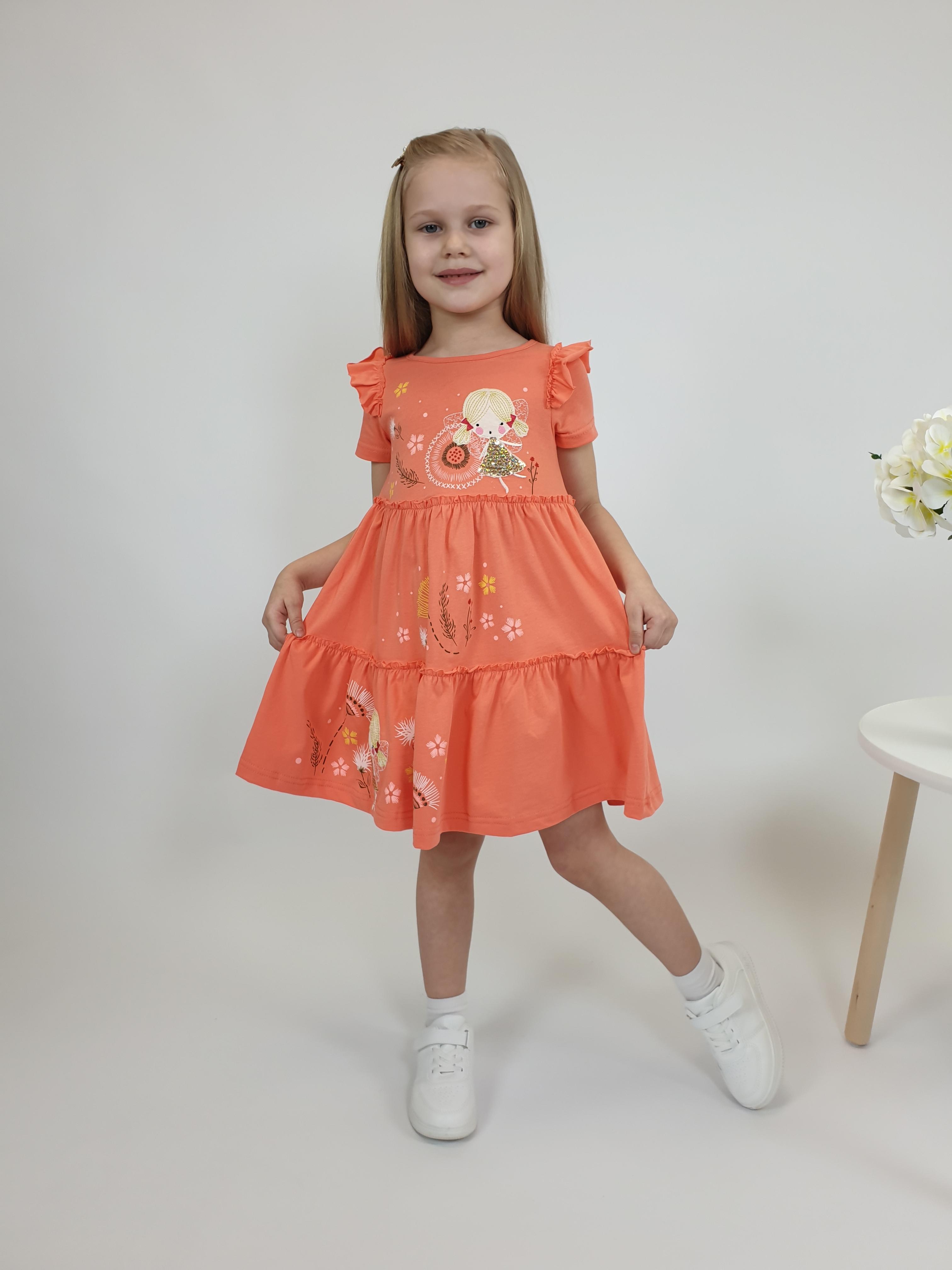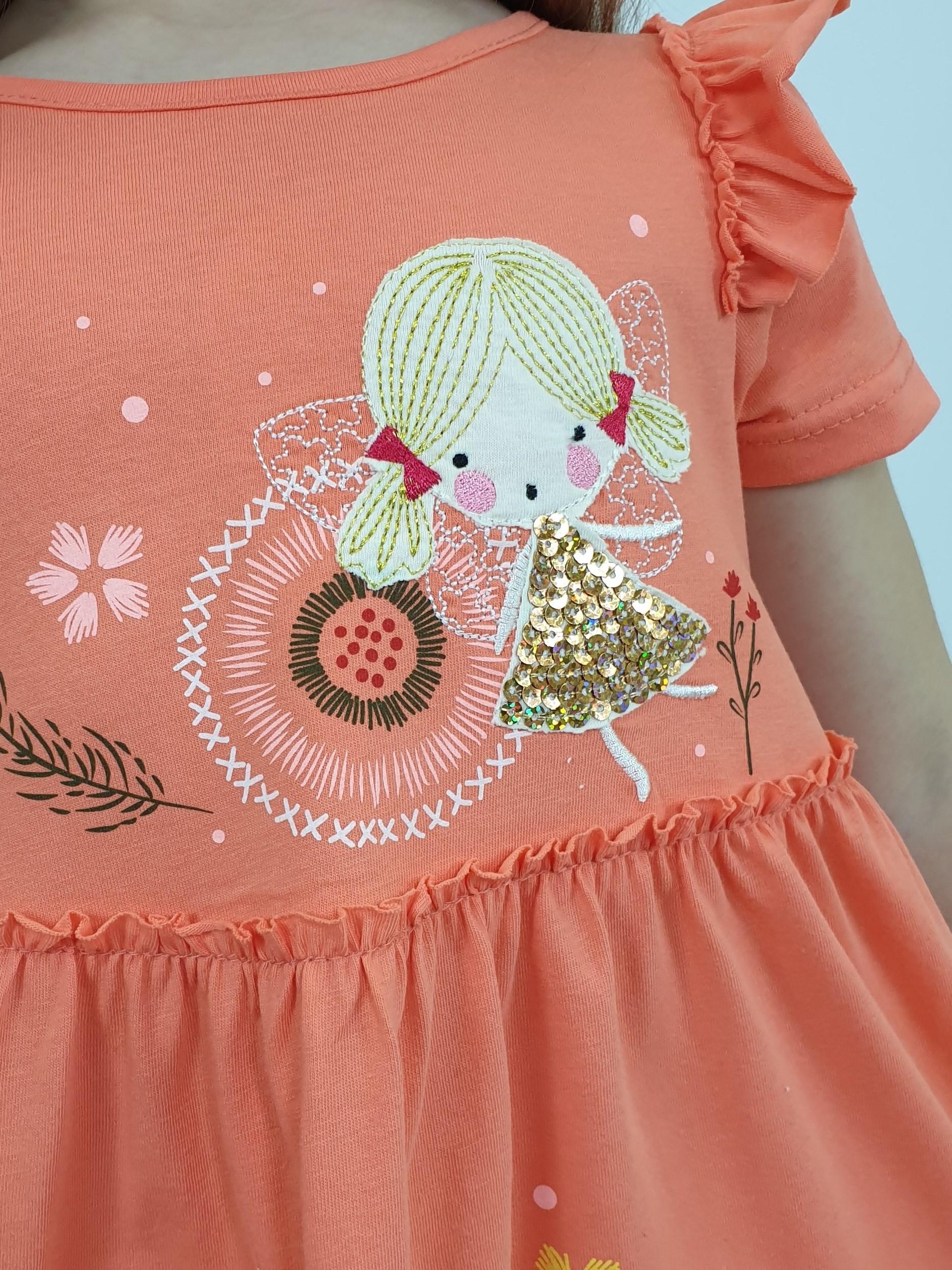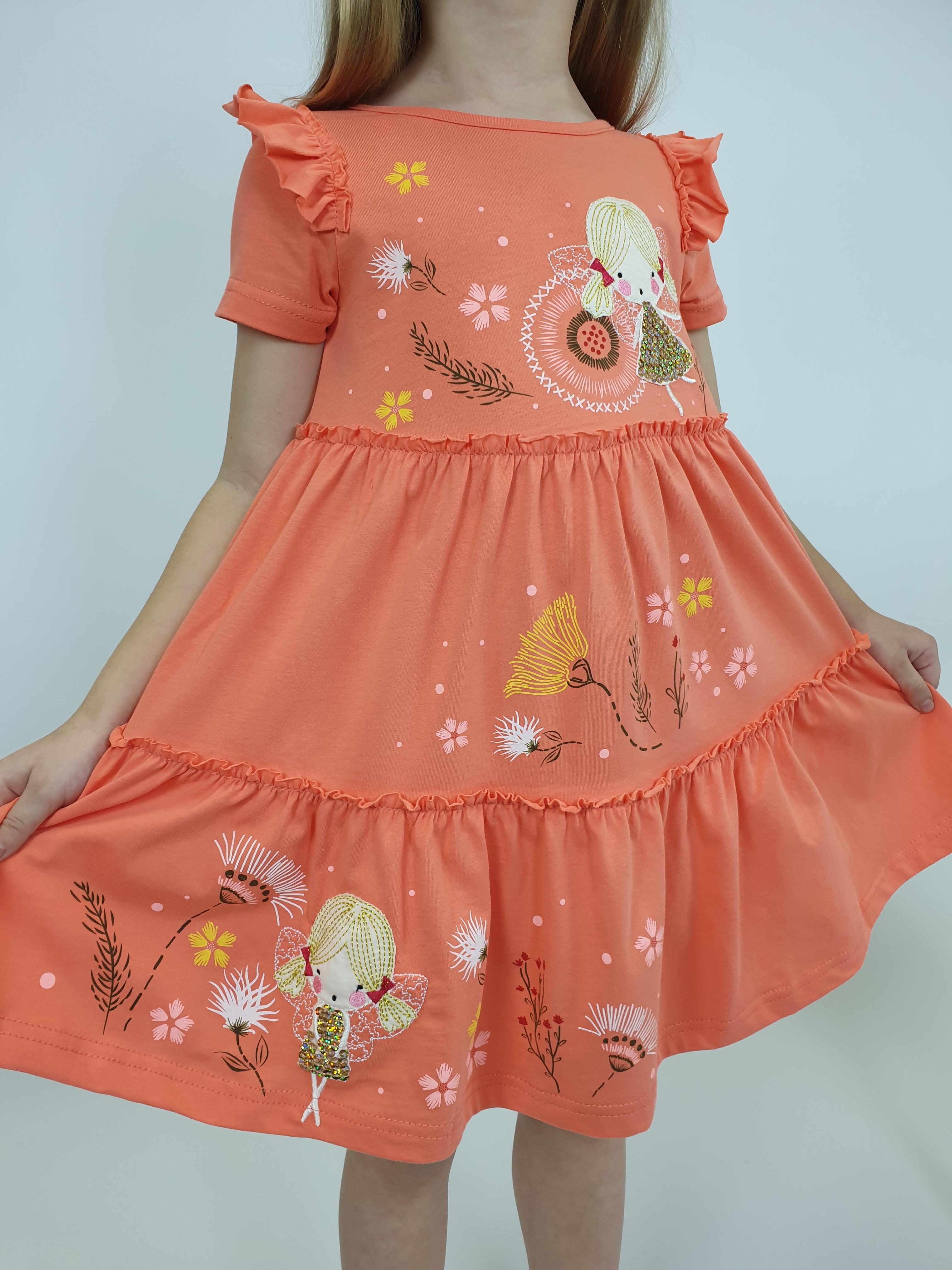 Платье-силуэт трапеция, короткий втачной рукав с настрочной рюшей по пройме. Юбка переда и спинки из двух воланов, по передним воланам печать. Кокетка переда с печатью, застежка по спинке на пуговицы. Горловина окантована. Вышивка (пайетки)-на кокетке переда и нижнем волане.