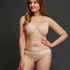 Мягкая чашка с тройным диагональным членением. Нижние детали чашки ламинированы хлопковым полотном. Вехние детали чашки декорированы геометричным кружевом в полоску на эластичной сетчатой фнукциональной подкладке. Ластовица прозрачная выполнена из неэластичного сетчатого полотна. Модель декорирована лаконичным металлическим украшением. Боковые детали стана выполнены из эластичного трикотажного полотна. Стан маечного типа.Также данная модель доступна в расширенном размерном предложении на полноты HIJ и обхваты 100-115.