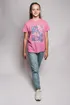 Футболка для девочки прямого силуэта с втачным коротким рукавом. Горловина круглая, обработана воротником из кулирки. Низ изделия и рукавов обработан швом в подгибку. На полочке принт шелкография.