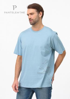 Футболка с втачным рукавом, свободного силуэта, с круглым вырезом горловины. На передней детали принт. Внизу изделия разрезы с хольнитенами.