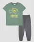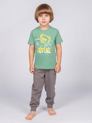 Пижама для мальчика, состоящая из футболки и брюк. Футболка прямого силуэта с втачным коротким рукавом. Горловина круглая, обработана воротником из рибаны. По горловине полочки и спинки отделочная строчка. Низ изделия и рукава обработан швом в подгибку. На полочке принт ШЕЛКОГРАФИЯ. Брюки для мальчика прямого силуэта из однотонного полотна. Пояс цельнокроенный в цвет изделия, выполнен из основного полотна с эластичной тесьмой внутри. По низу изделия манжеты из рибаны.