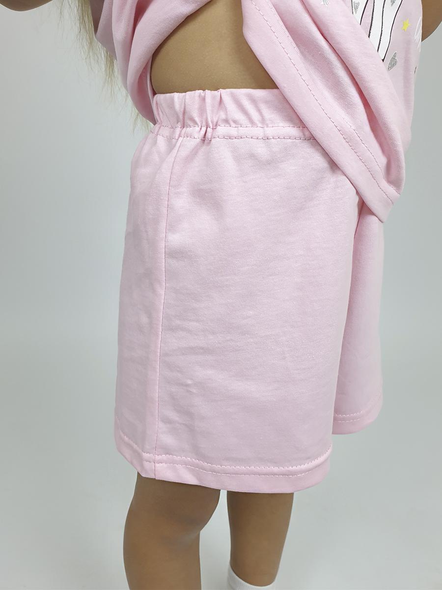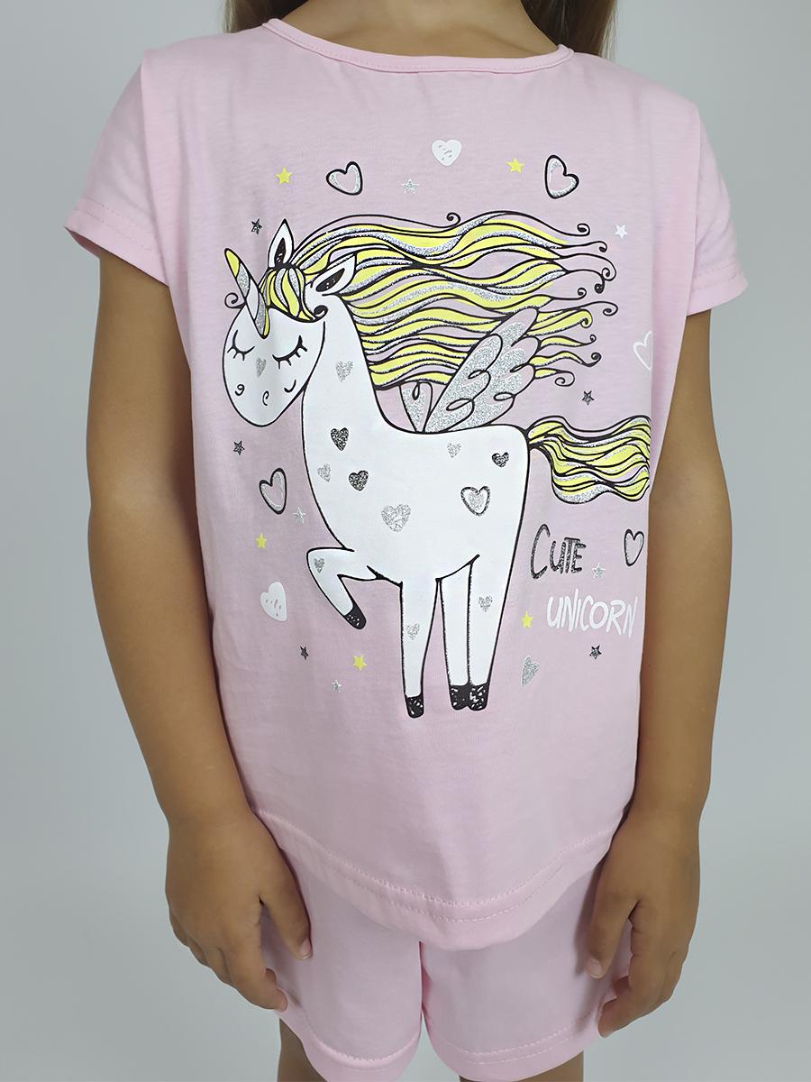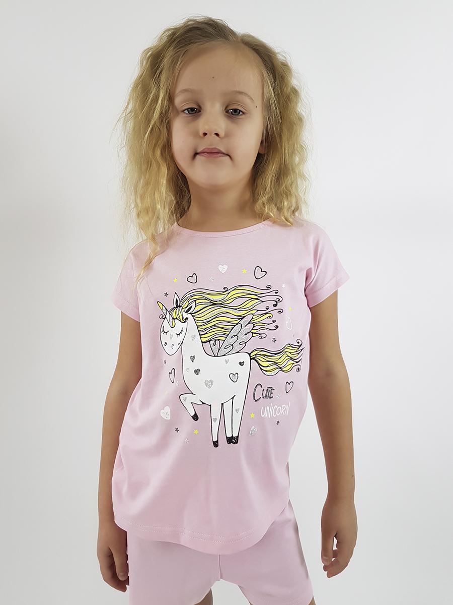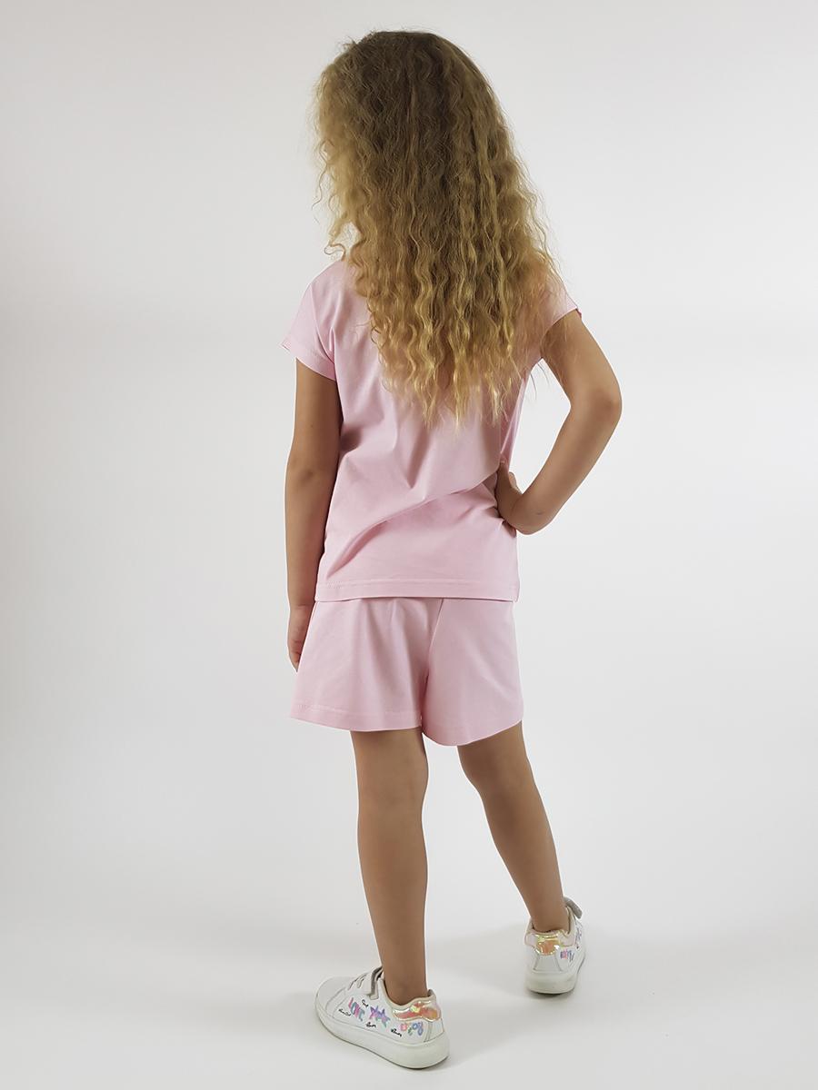 Фуфайка-с цельнокроенным, коротким рукавом. Перед с печатью. Горловина окантована, низ подшит. Шорты-короткие,на резинке.