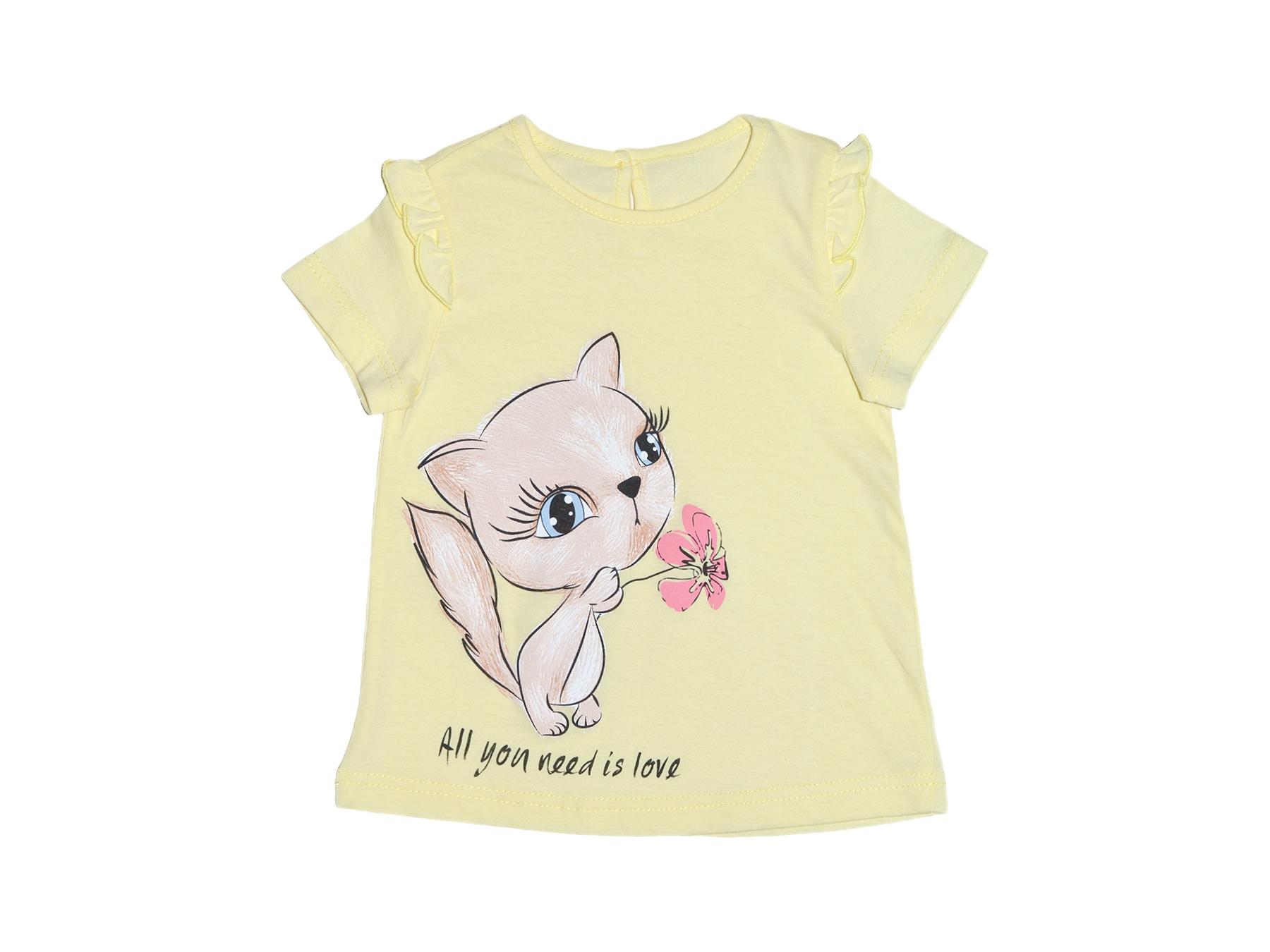 Фуфайка-силуэт трапеция, короткий втачной рукав, в пройме рюша. Горловина окантована, застежка на пуговицу по спинке. Печать на переде.