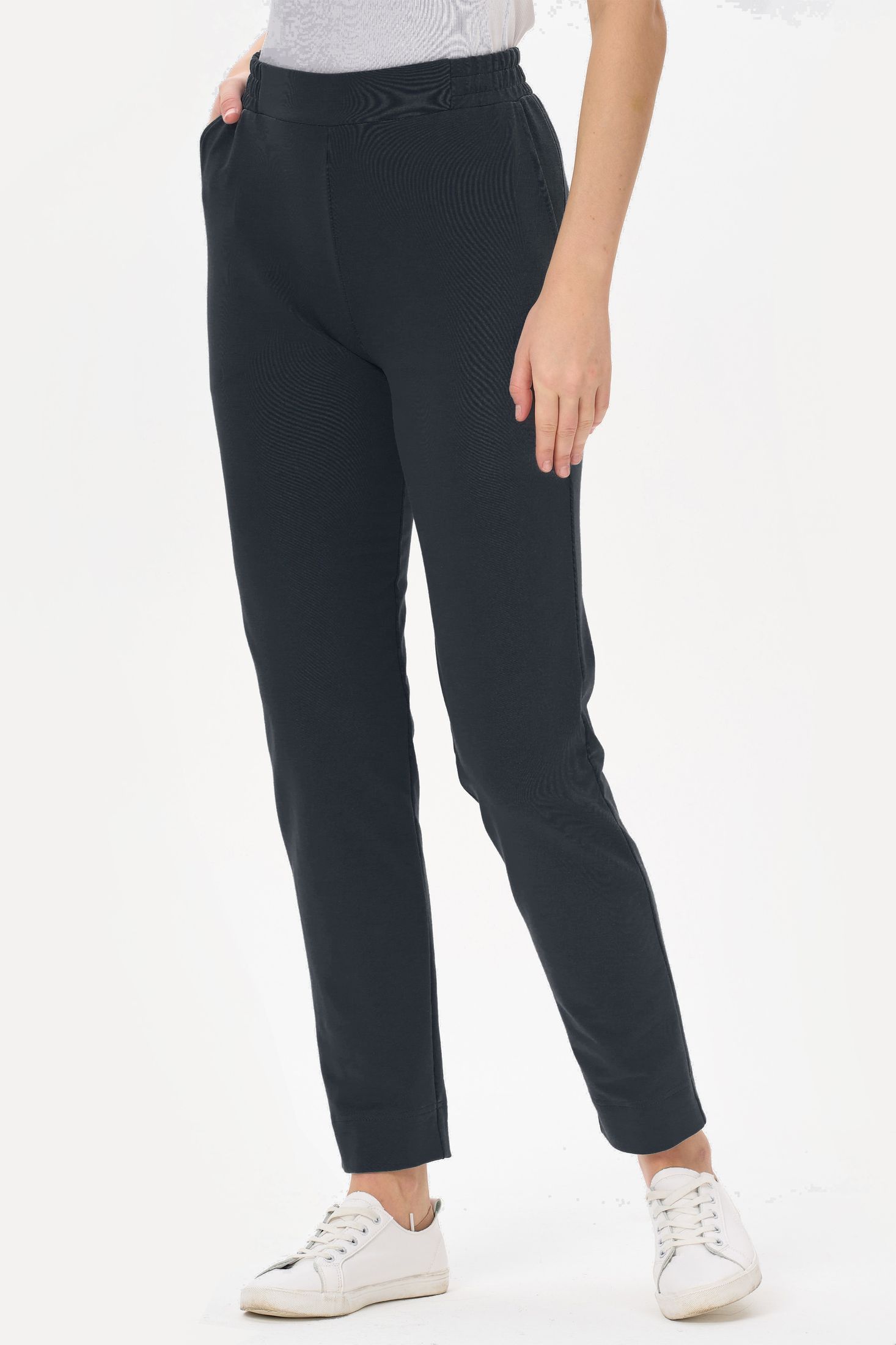 Описание: Зауженные брюки с карманами из хлопкового полотна футер (без начеса). Пояс с планкой и эластичной лентой внутри. Длина брюк регулируется подворотом. Длина по боковому шву (без учета пояса) в 44 размере - 98см. Рост модели 178 см.