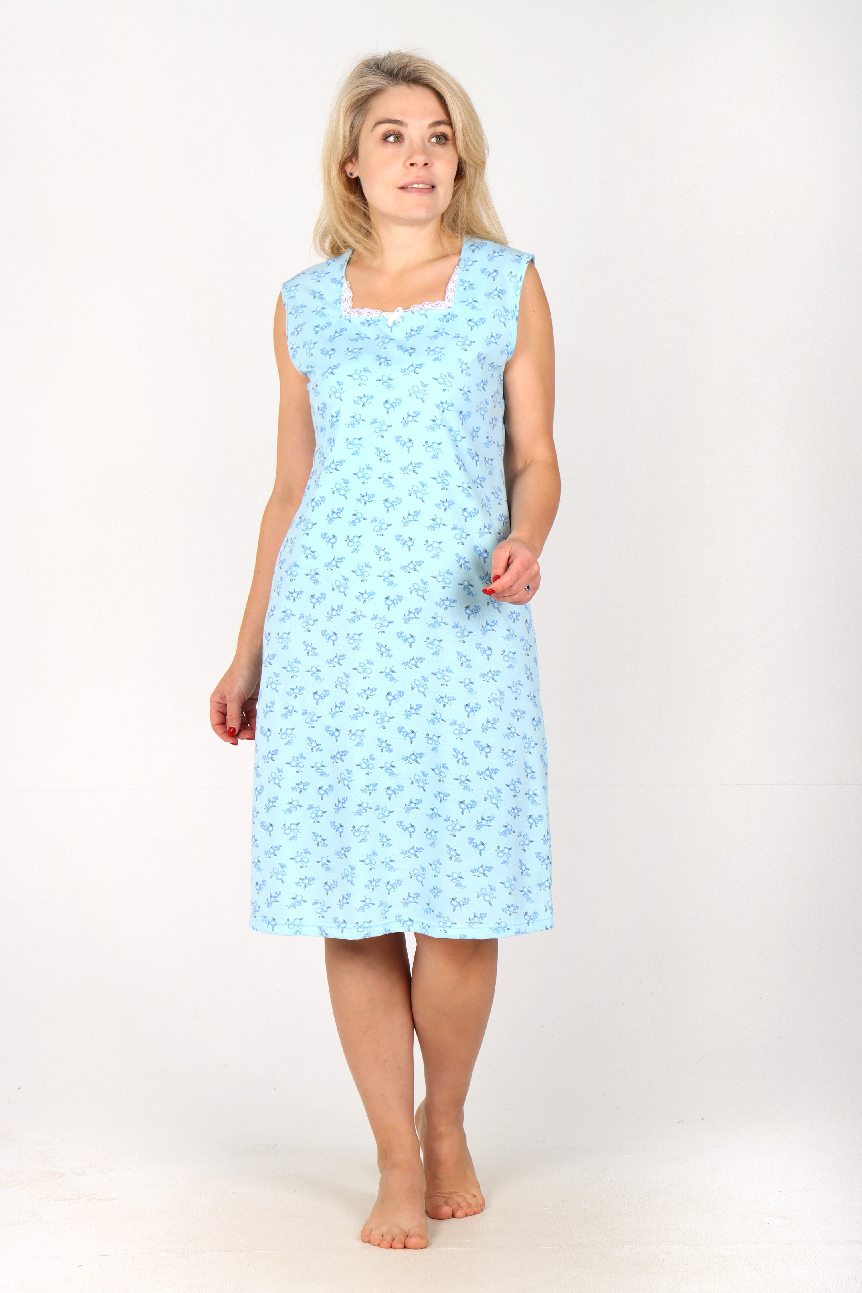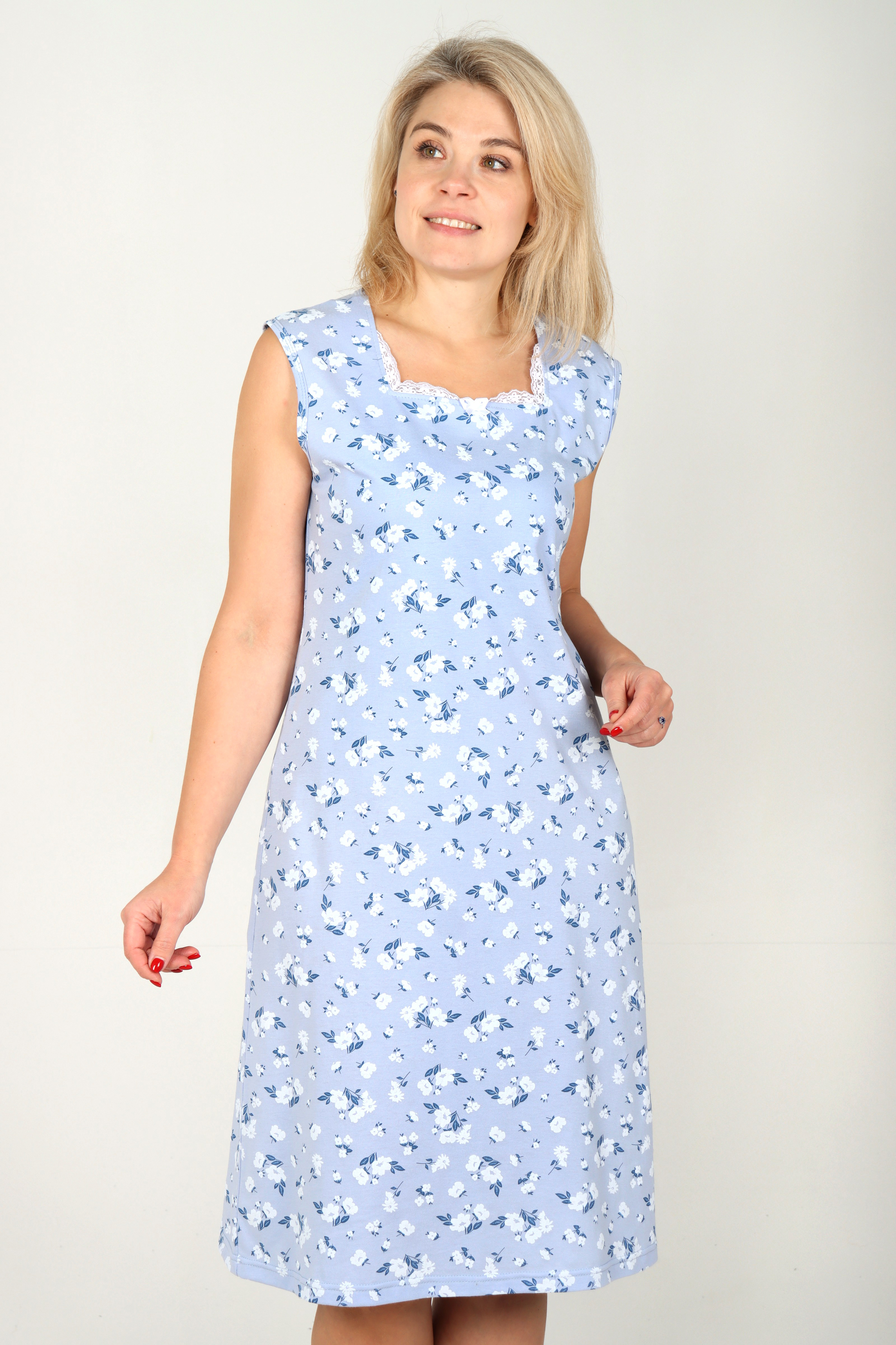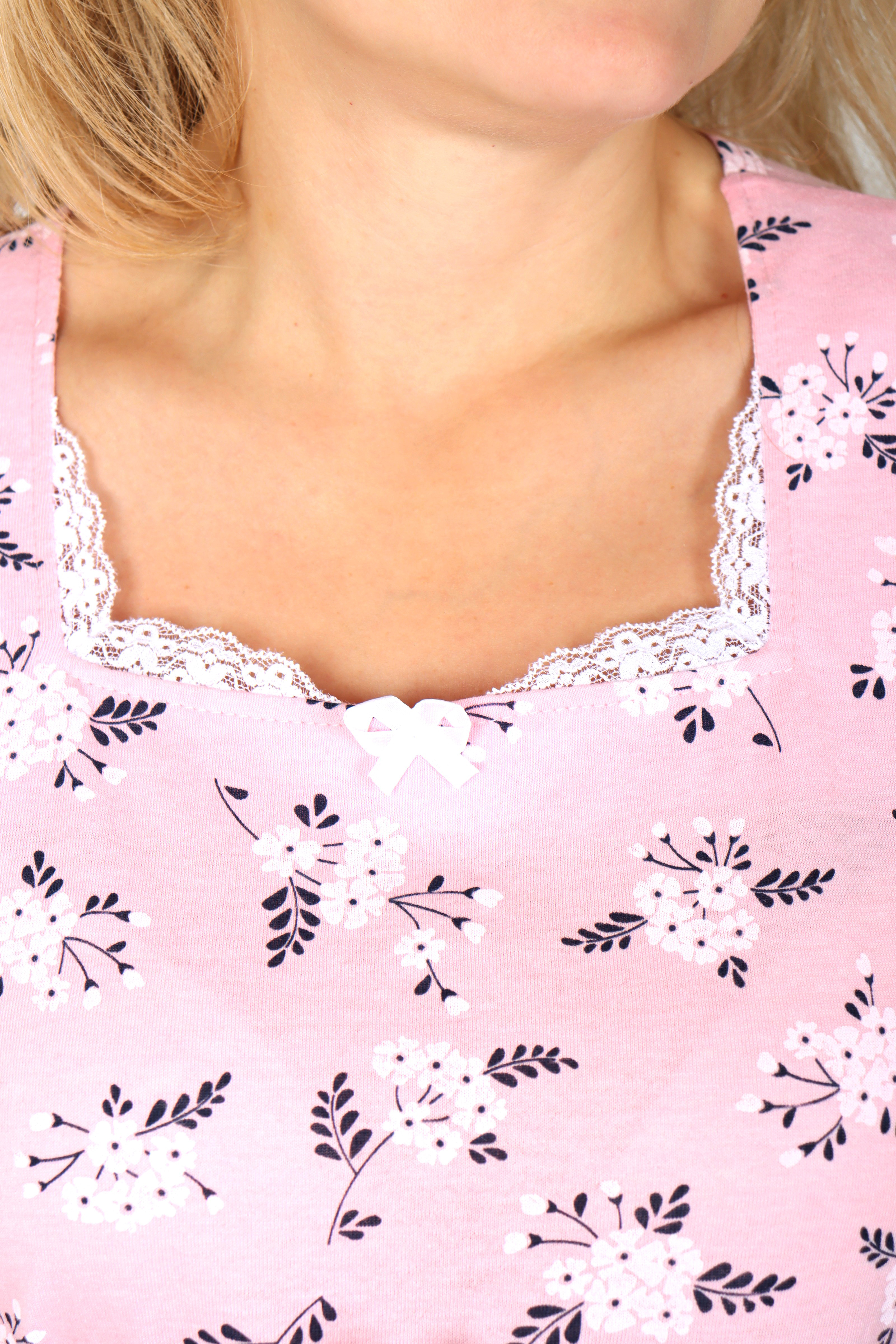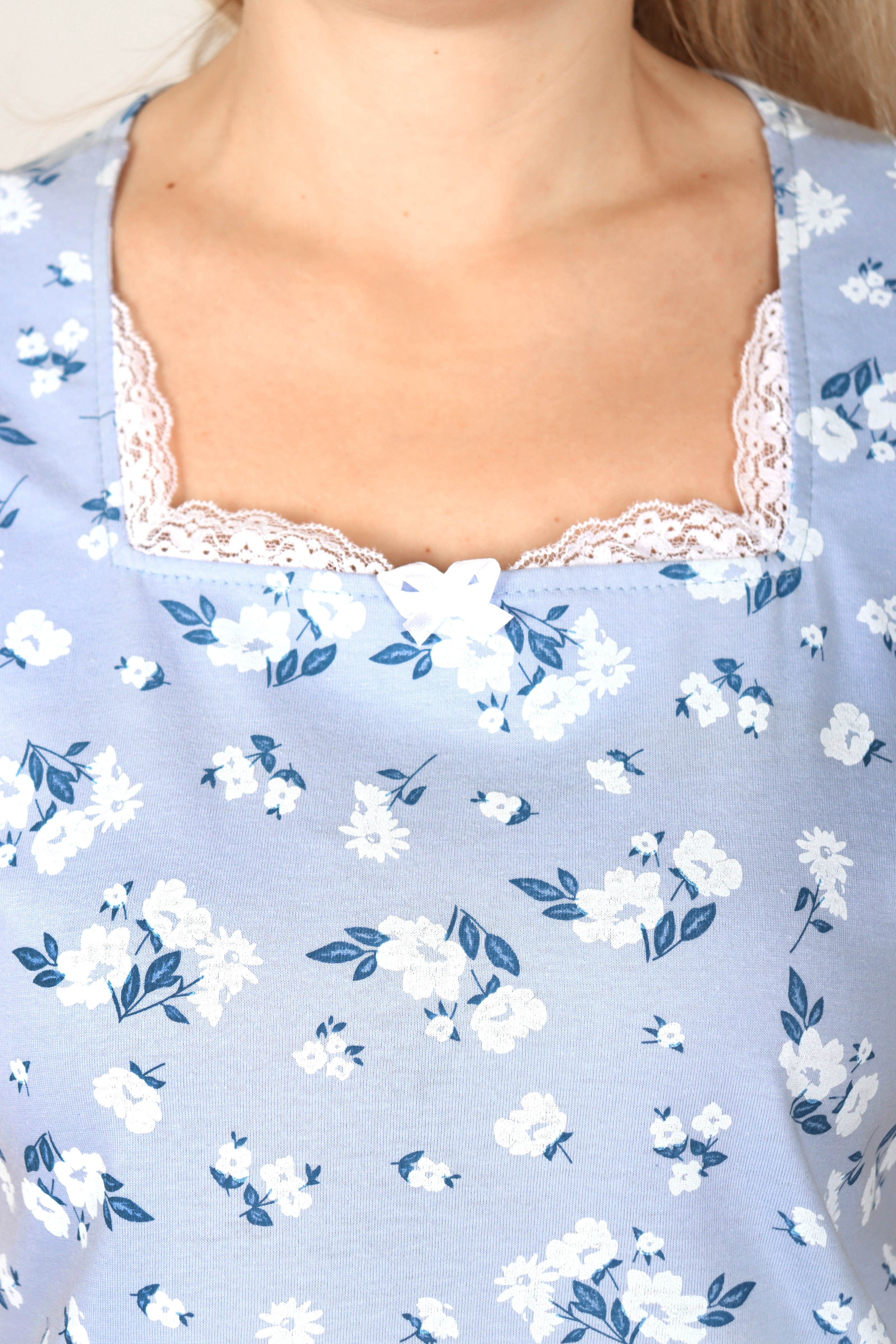 Женская сорочка из хлопкового трикотажного полотна с нежным рисунком, горловина оригинальной формы украшена тонкой полоской кружева.