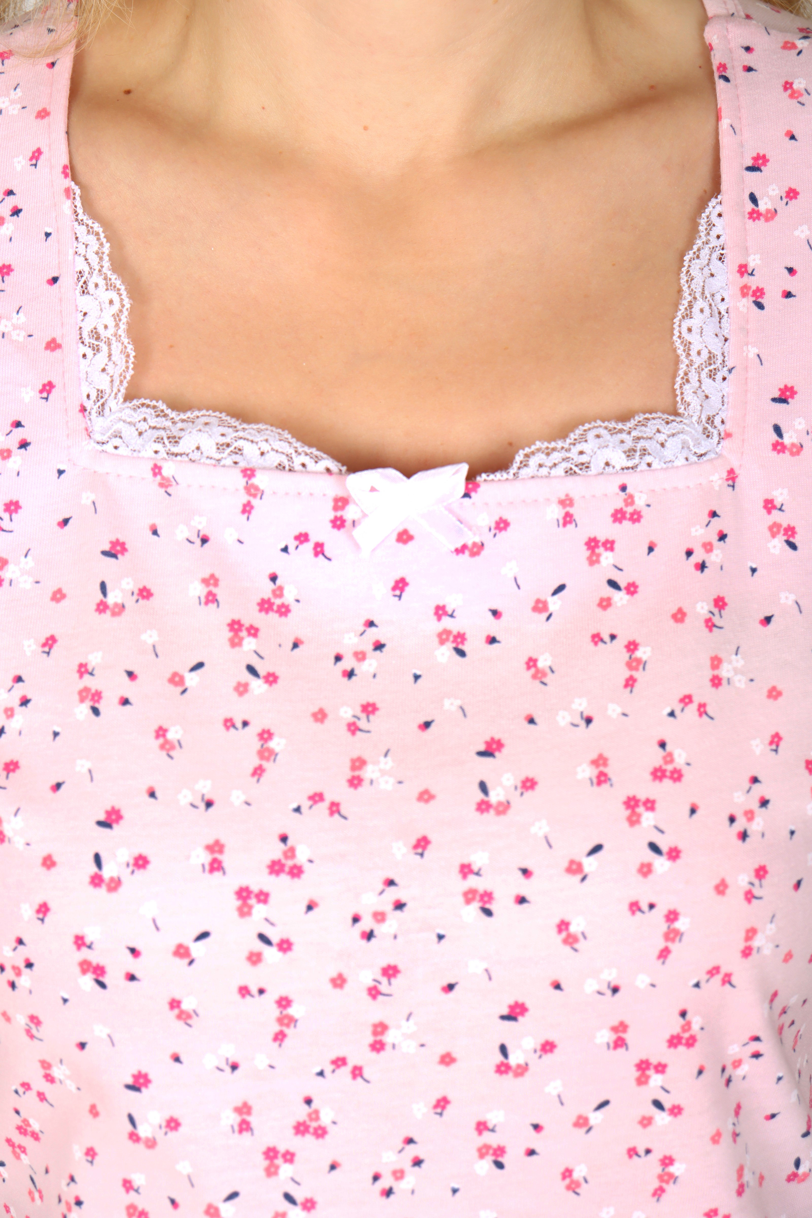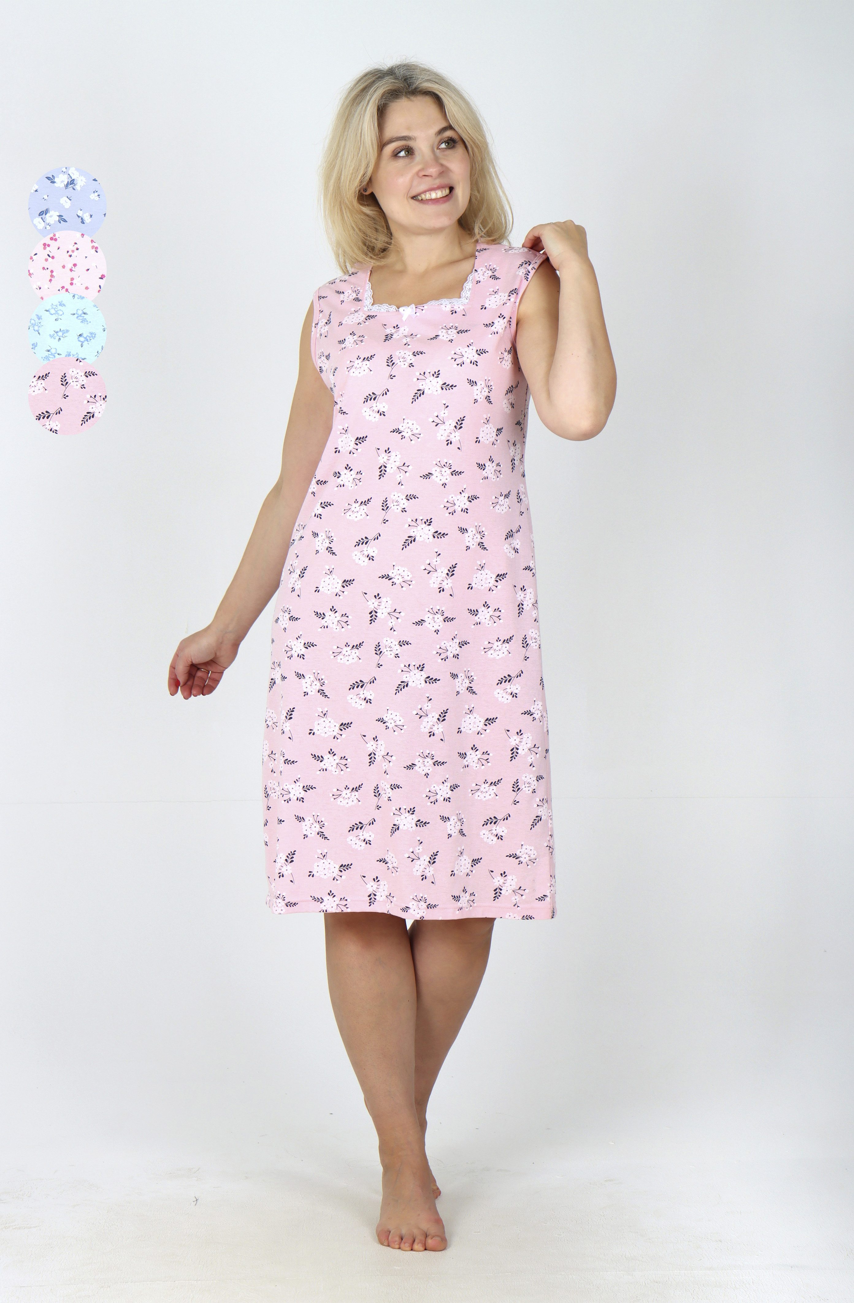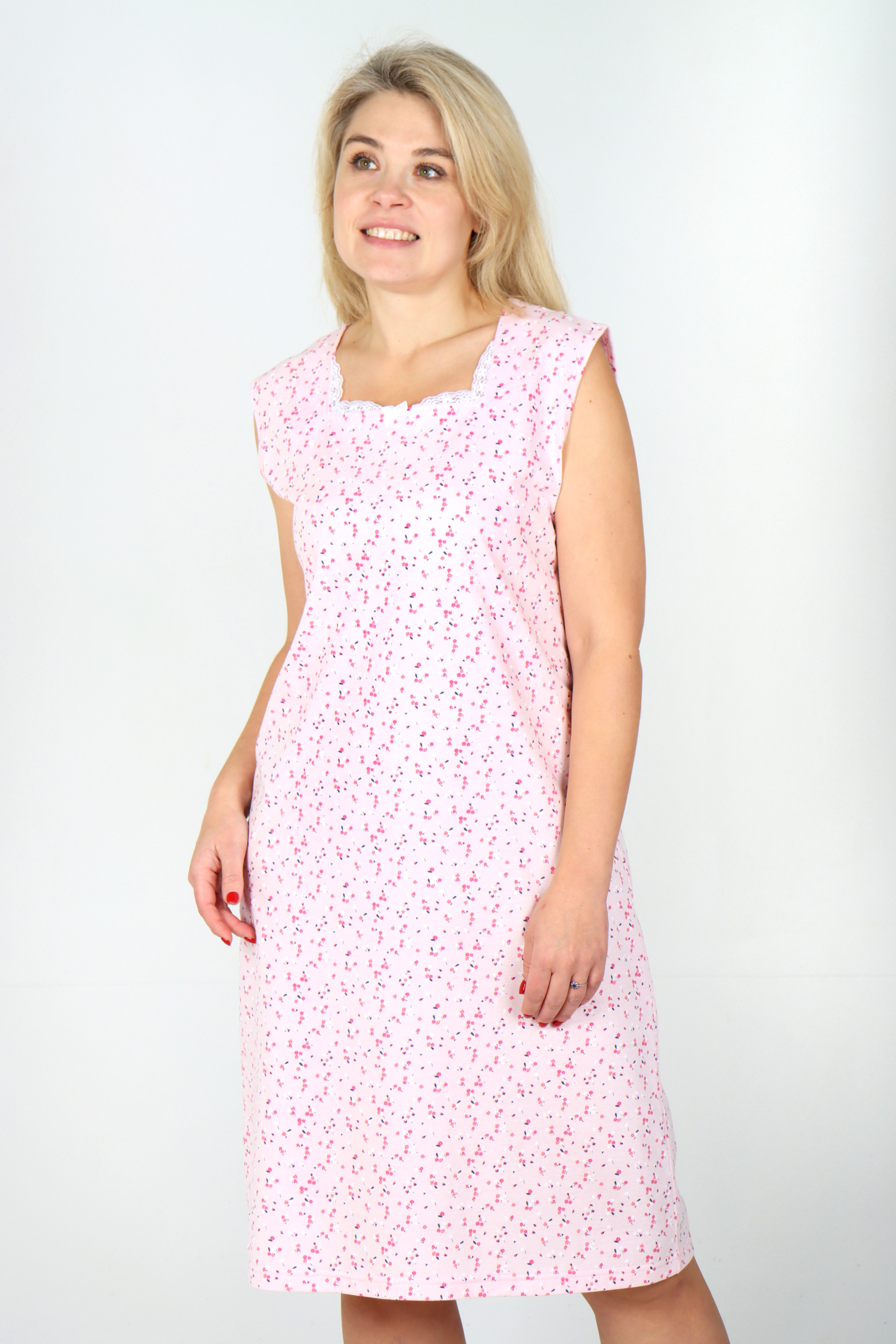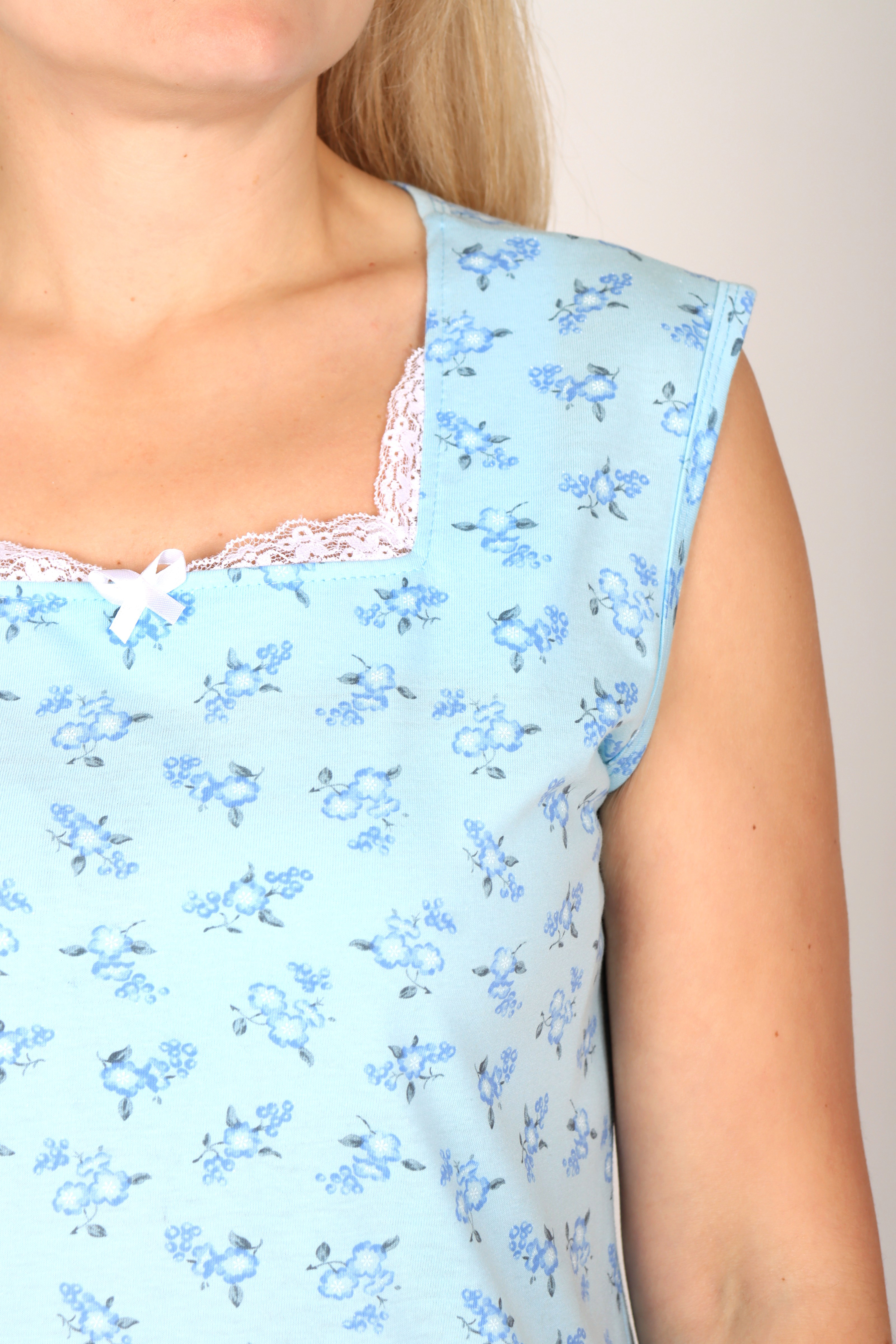 Женская сорочка из хлопкового трикотажного полотна с нежным рисунком, горловина оригинальной формы украшена тонкой полоской кружева.