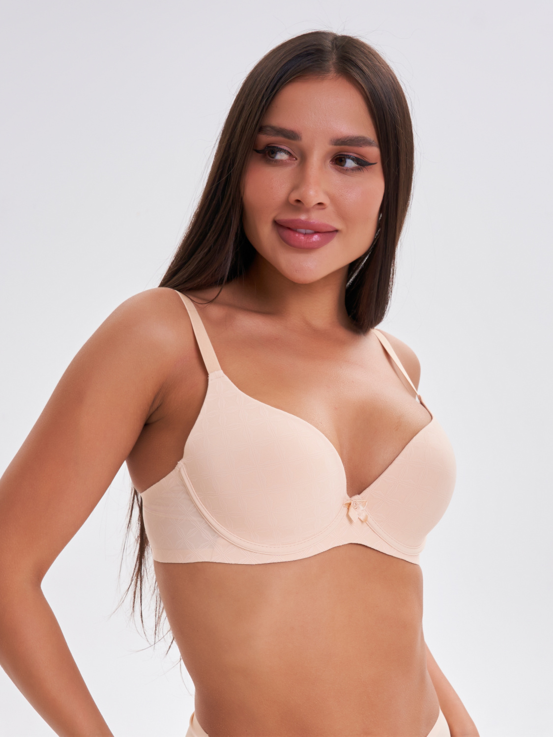 Классический бюстгальтер с формованной чашкой без пуш-ап на косточках выполненный из текстурного полиамидного полотна. Пояс изделия и стан из основного полотна, края пояса обработаны клеевой технологией, застежка трехрядная на два крючка. Модель имеет неотстегивающиеся регулируемые бретели.