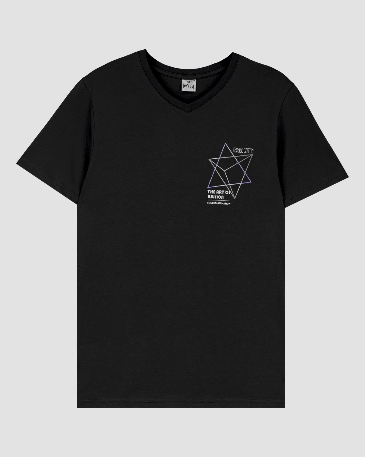 Футболка мужская прямого силуэта с втачным коротким рукавом. Горловина V-образная, обработана воротником из рибаны. Горловина спинки внутри укреплена бейкой из кулирки. Низ изделия и рукавов обработан швом в подгибку. На полочке ФОТОПРИНТ. Надпись переводится как "Реальность;Искусство иллюзии;Твое воображение". Модель рассчитана на рост 176-182 см.