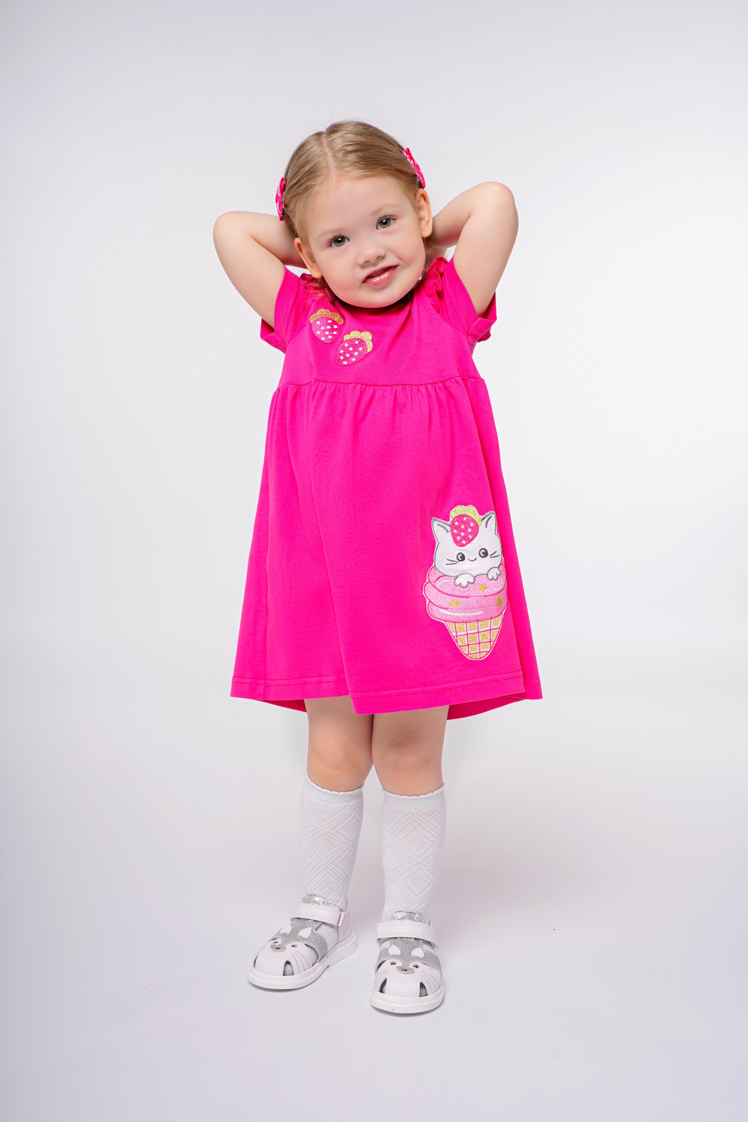 Платье-отрезная юбка со сборкой, с вышивкой на переде. Кокетка переда с печатью. Короткий рукав, в пройме рюша, горловина обработана ластиком.