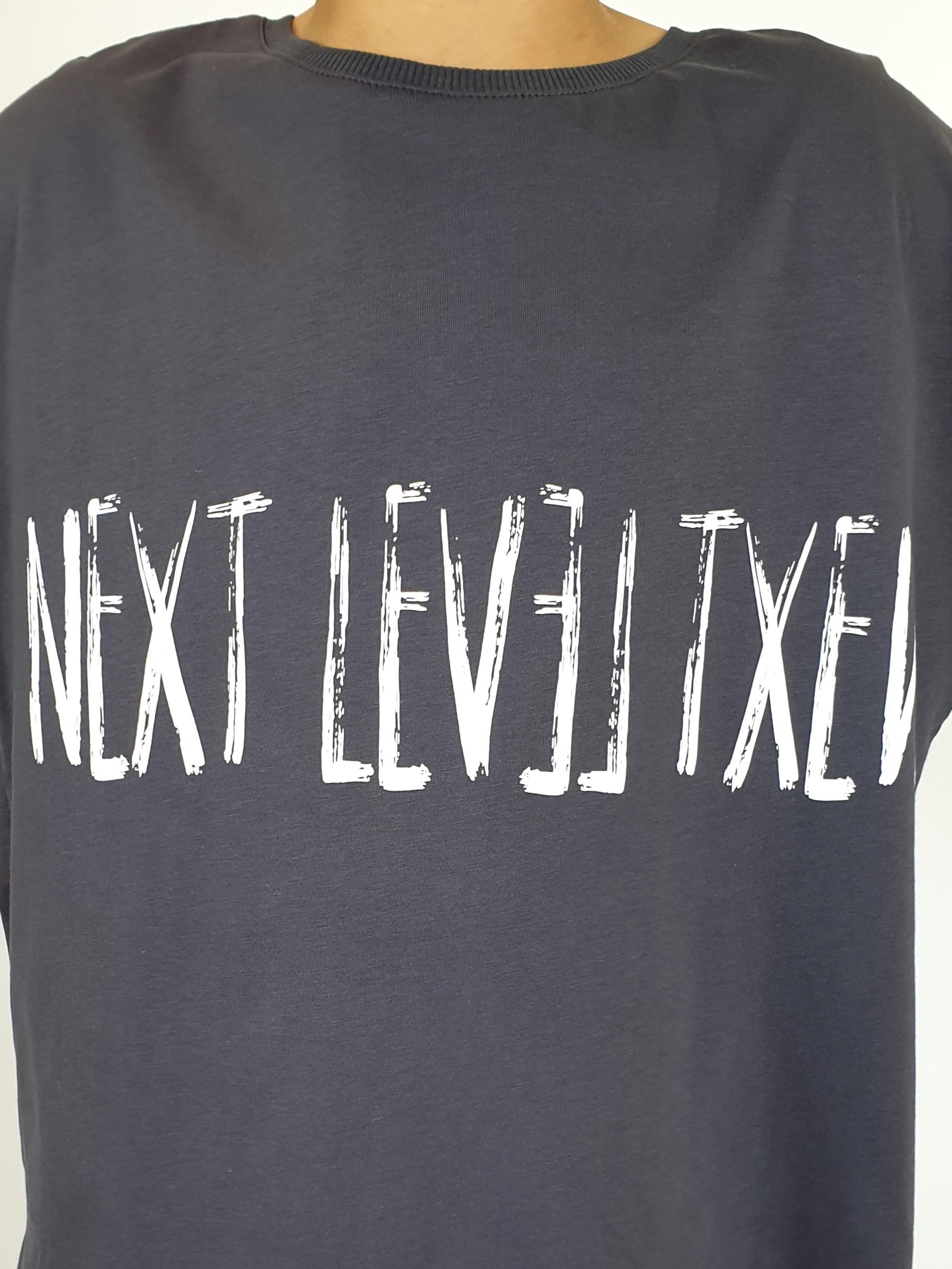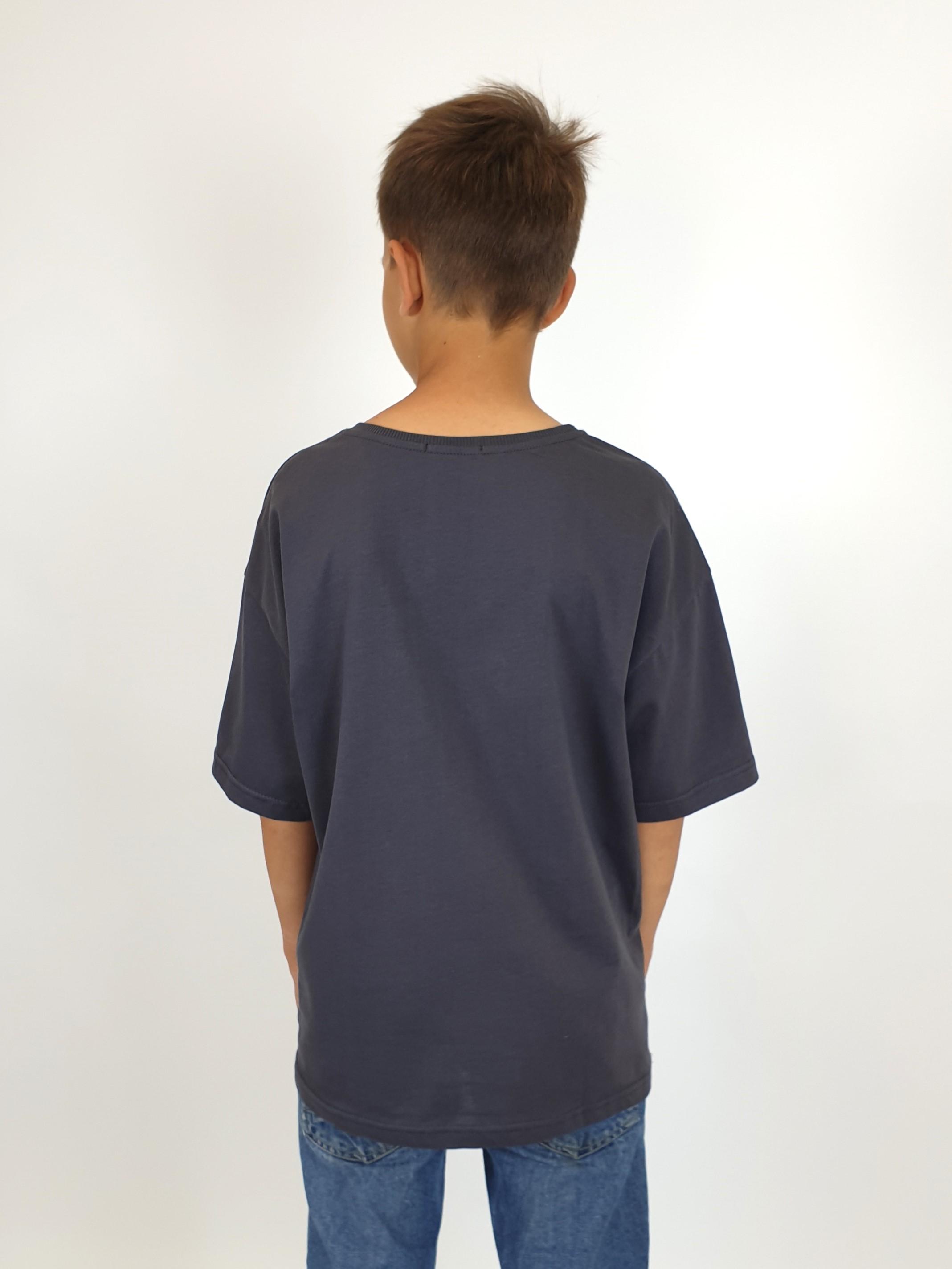Футболка (оверсайз)-прямой силуэт спущенное плечо, короткий рукав, перед с печатью. Горловина обработана планкой из ластика. Низ изделия и рукава подшиты.