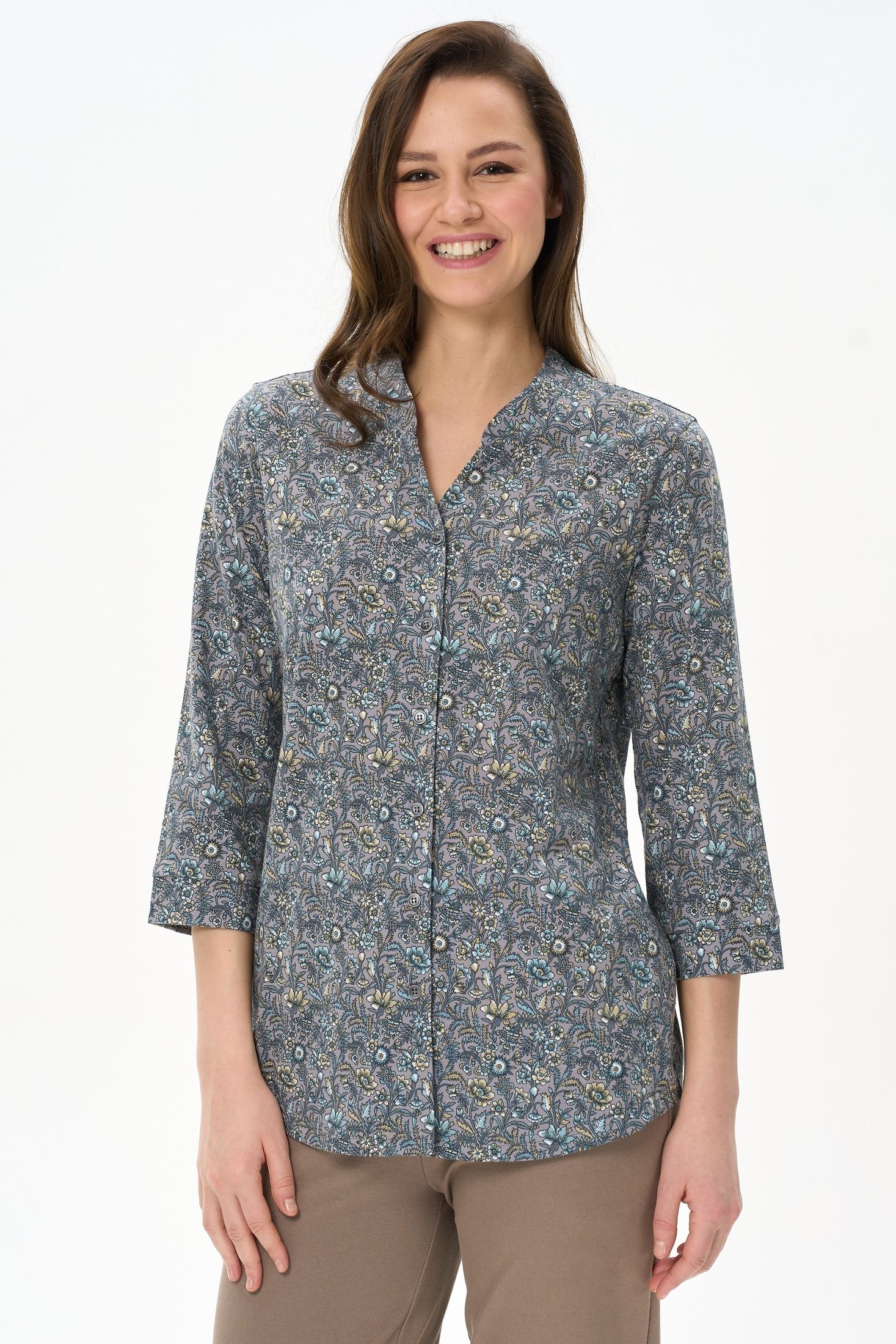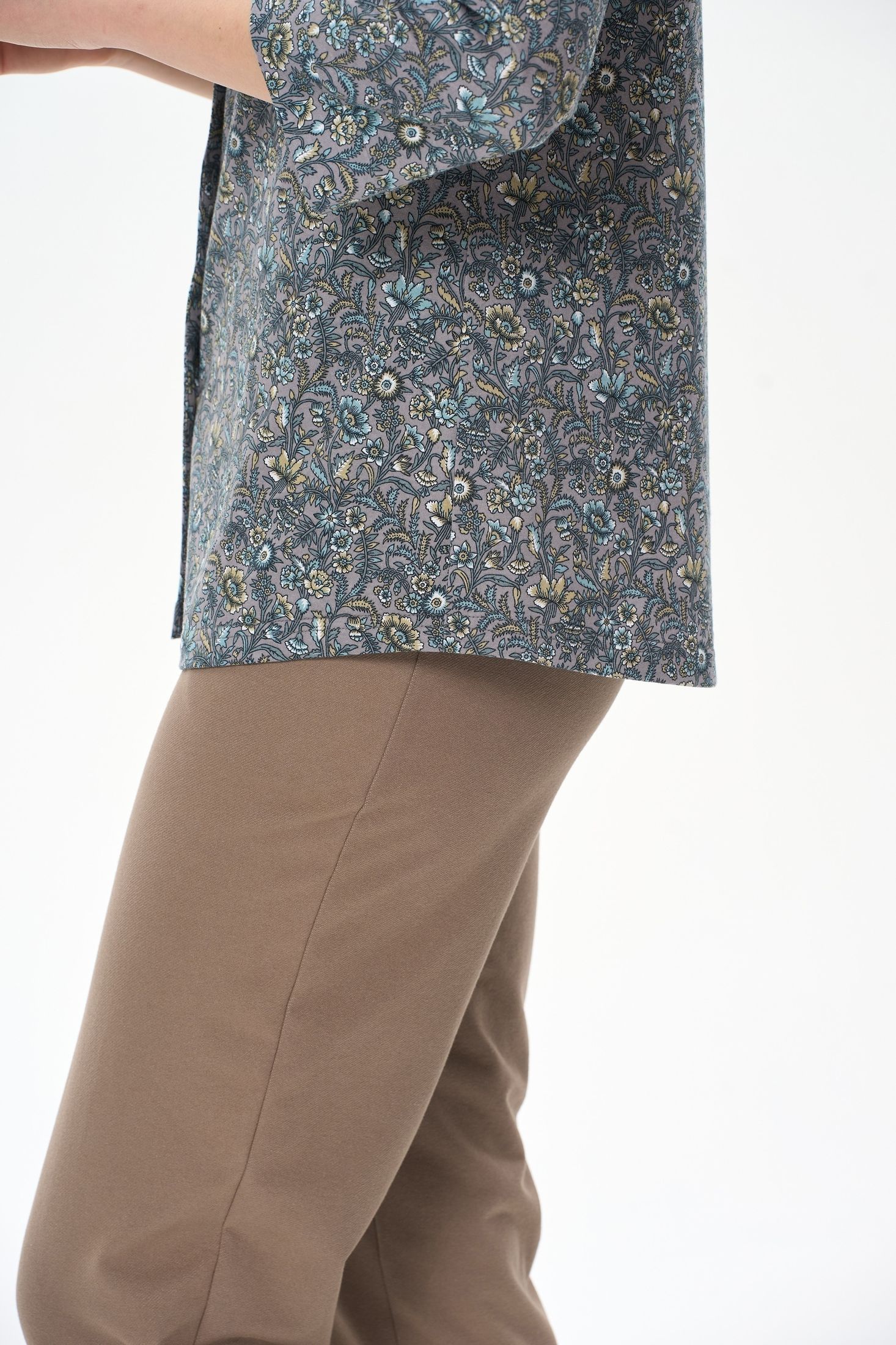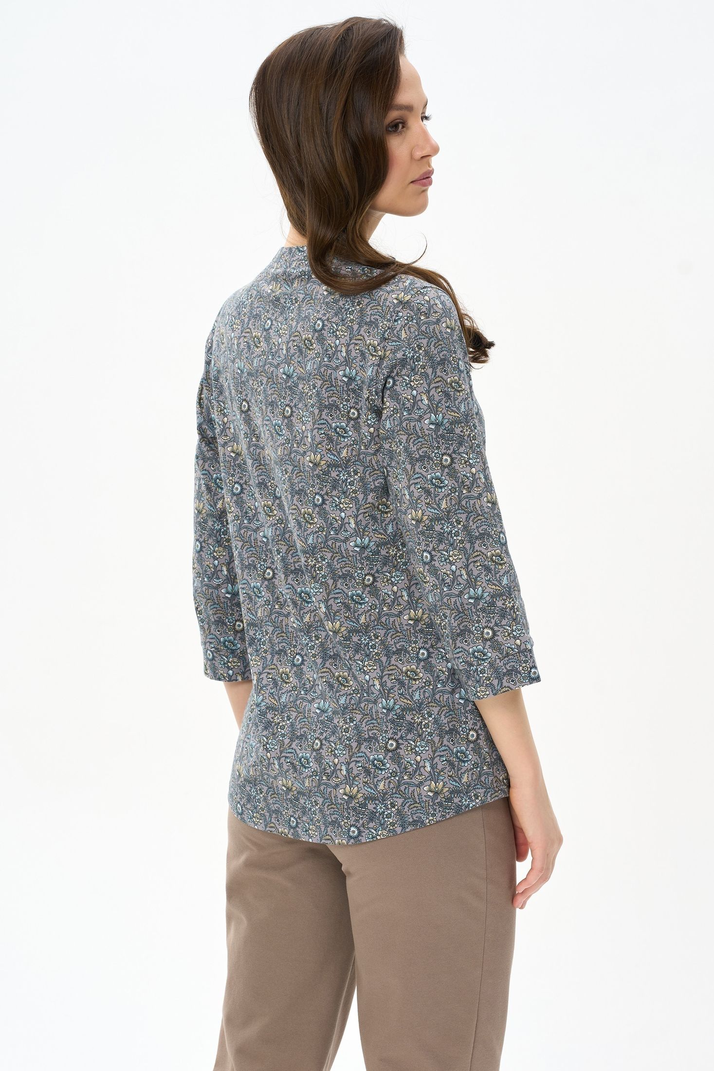 Описание: Блузка прямого силуэта из хлопкового полотна. Воротник стойка, застежка на пуговицы. Втачной рукав 7/8 . Рост модели на фото 178 см.