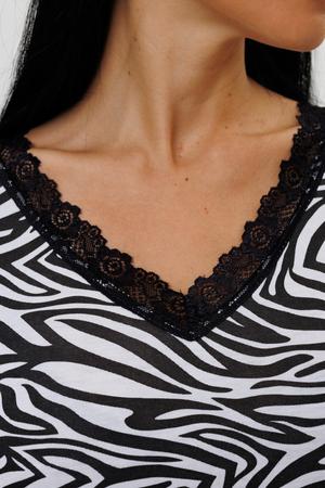 Ночная сорочка с анималистическим принтом сшита из вискозного полотна. У сорочки V-образный вырез, отделанный кружевом. Длина чуть выше колен. Рукава 3/4.