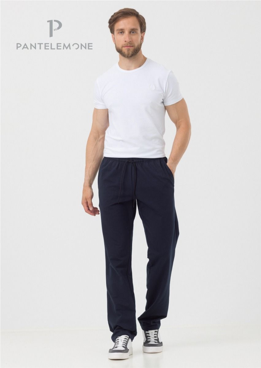 Брюки свободные, прямые из футера без начеса, с боковыми карманами, задние карманы накладные с отделкой хольнитенами. На задней левой детали принт. Пояс цельнокроенный с резинкой и шнуром.