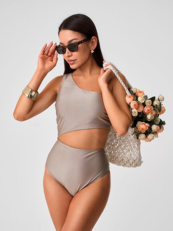 Слитнй купальник на подкладе с чашкой soft bra. Мягкая чашка со съемными формованными вкладышами. Без каркасов и боковых корсетных вставок. Широкие бретели соединены на спинке кулиской. Плавки на подкладе, с завышенной талией, соединены с бюсгальтером справа швом на талии. Эластичное полотно с блеском.