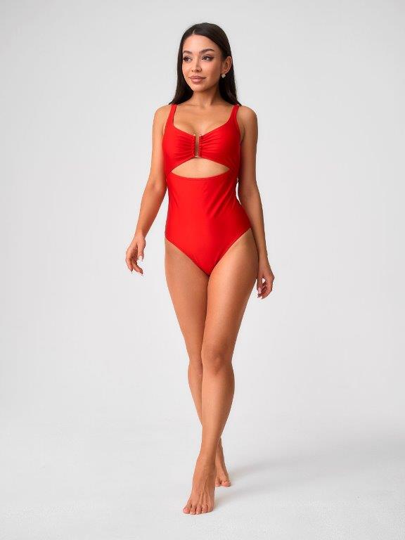 Слитный купальник на подкладе из эластичного полотна с мягкой формованной чашкой soft bra. Мягкая чашка с формованными съемными вкладышами. Без каркасов и без боковых корсетных вставок.Спереди декоративная металлическая вставка. Бретели несъемные и нерегулируемые. Без застежки. Тонкие резинки, подгиб и плоский шов по срезу ножек