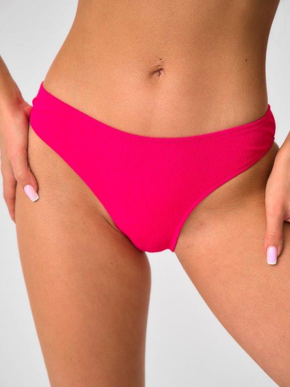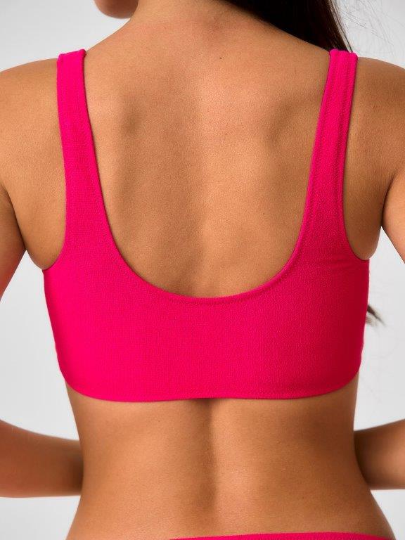 Раздельный купальник на подкладе из фактурного матового полотна с мягкой чашкой soft bra. Бюстгальтер на мягкой чашке со съемными формованными вкладышами, без каркасов и без боковых корсетных вставок. Бретели несъемные и нерегулируемые. Без застежки. Плавки на подкладе с завышенной талией. Тонкая резинка, подгиб и плоский шов по линии талии и срезу ножек.