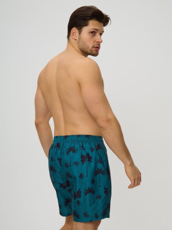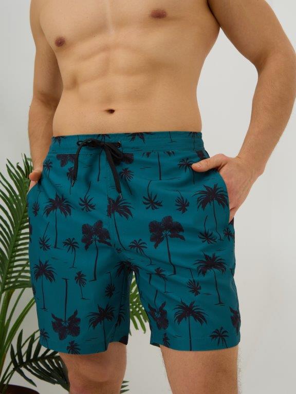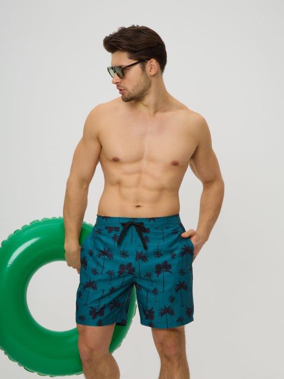 Мужские шорты из мягкого полотна без эластана с тропическим принтом. Боковые карманы с двух сторон. Внутренние плавки из мягкой эластичной сетки. На спине по линии талии широкая резинка, спереди регулируемый шнурок. Подгиб по нижнму краю шорт.