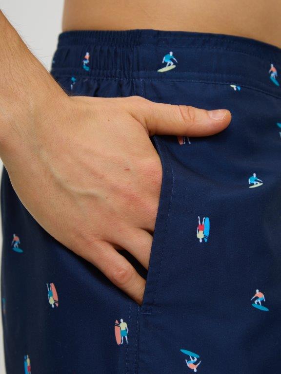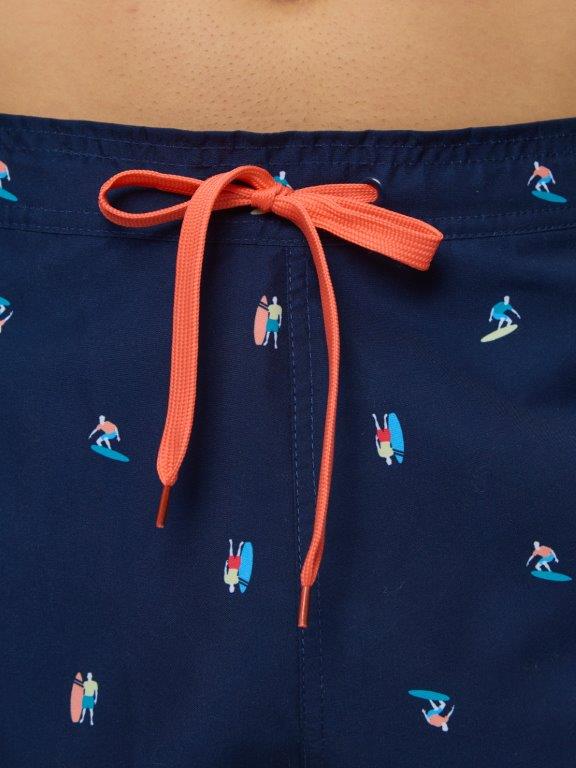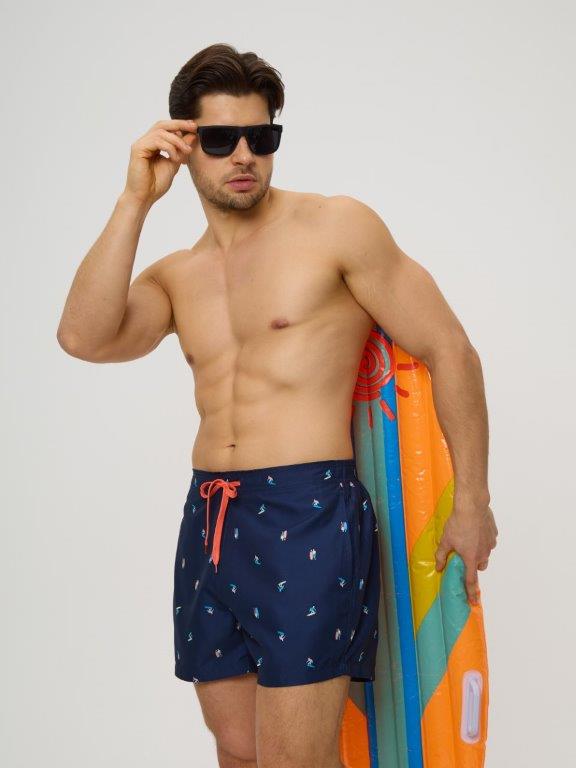 Мужские укороченные плавки из мягкого полотна без эластана, с принтом - серфер. Боковые карманы с двух сторон. Внутренние плавки из мягкой эластичной сетки. Сзади, по линии талии широкая резинка, спереди - регулируемый шнурок. Подгиб по нижнему краю шорт.