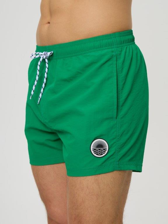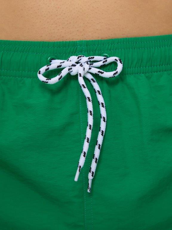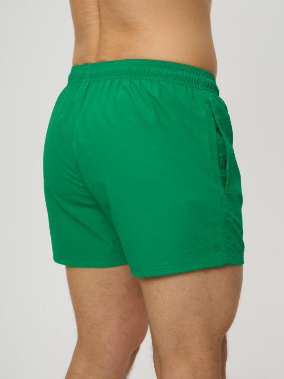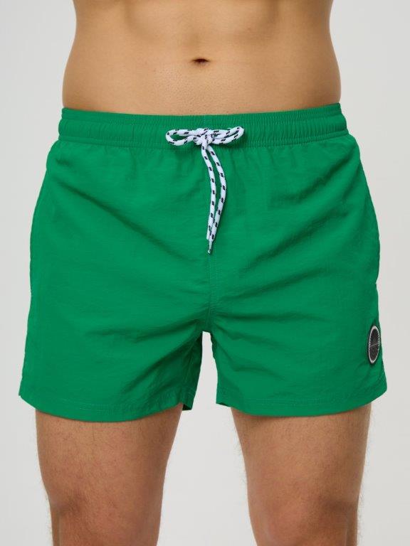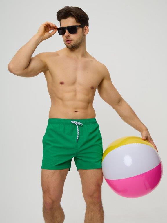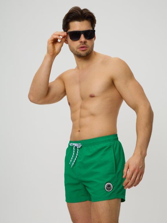 Мужские укороченные шорты из мягкого полотна без эластана. С боковыми карманами с двух сторон. Внутренние плавки из мягкой эластичной сетки. По линии талии широкая резинка и регулируемый шнурок. Подгиб по нижнему краю шорт. Декоратичный резиновый элемент на левой части шорт.