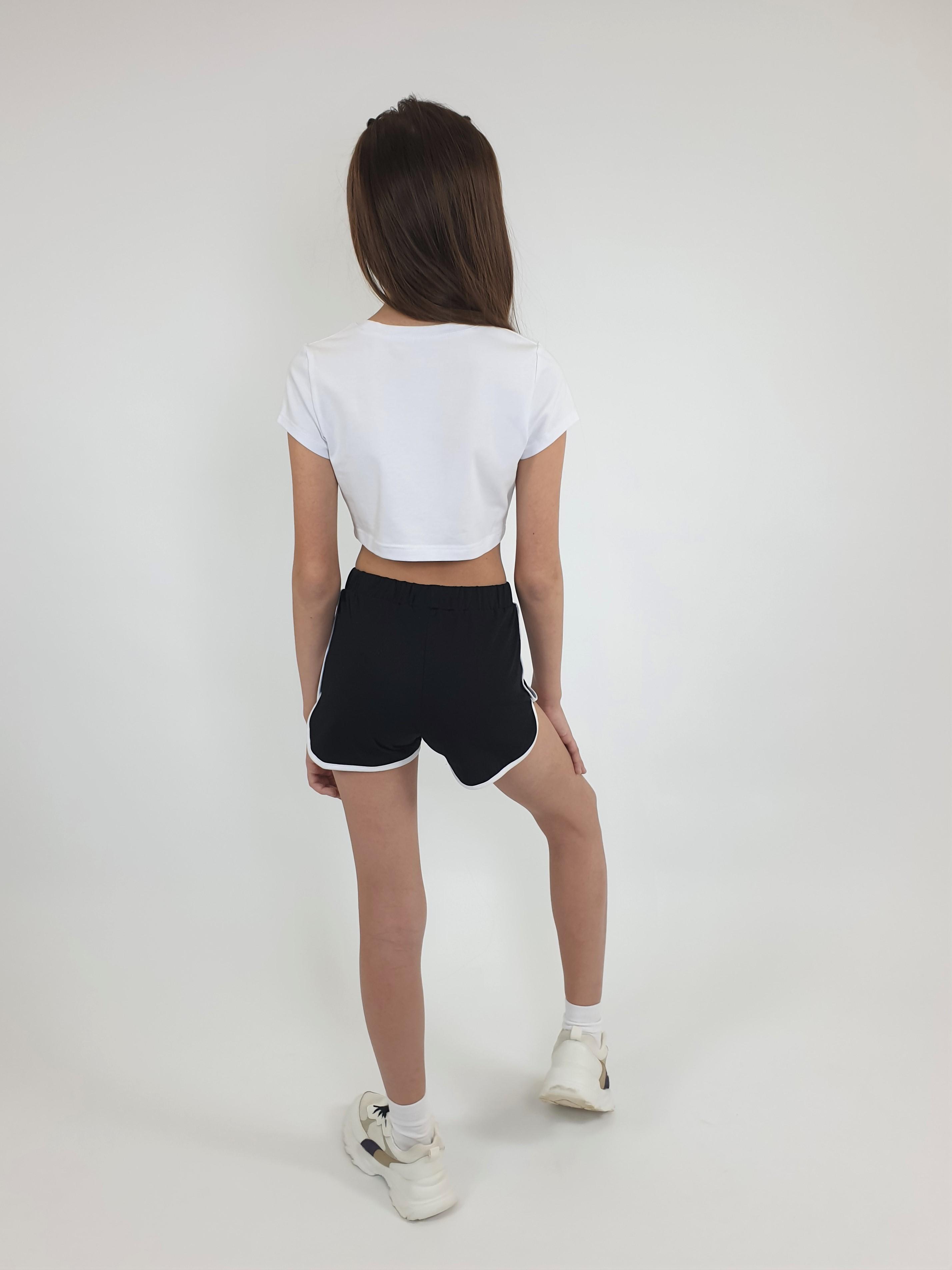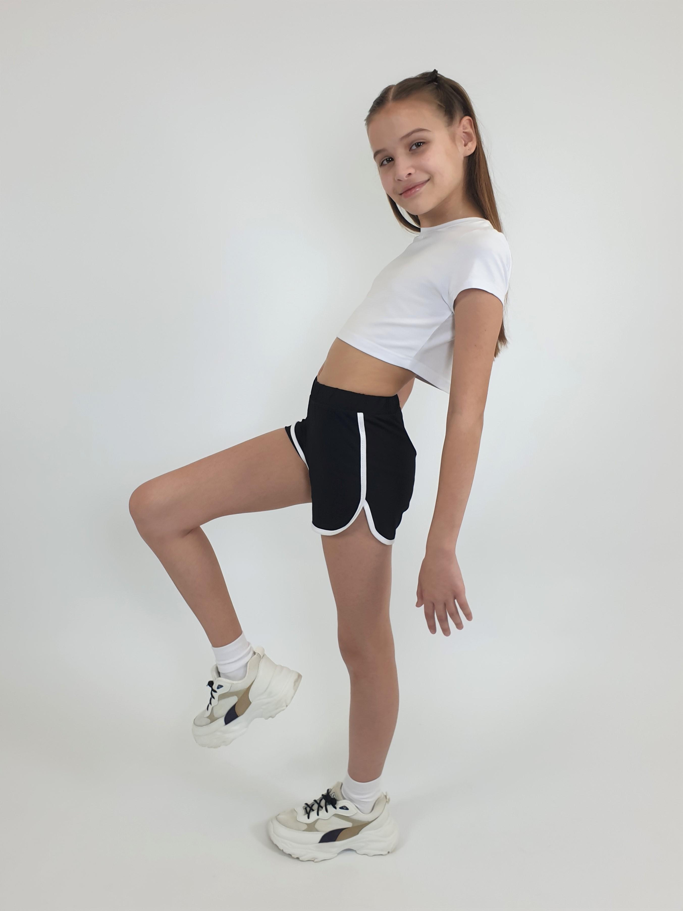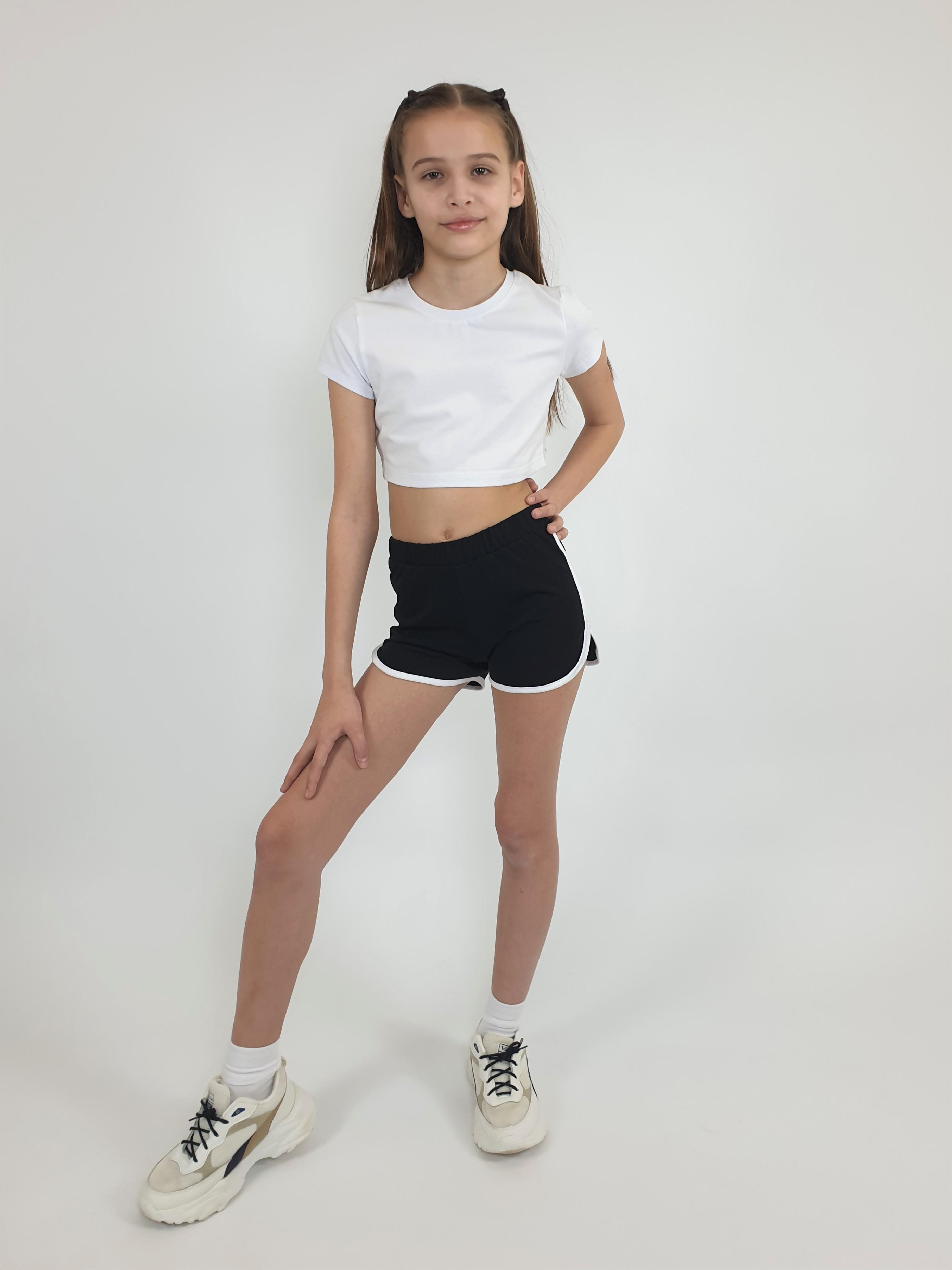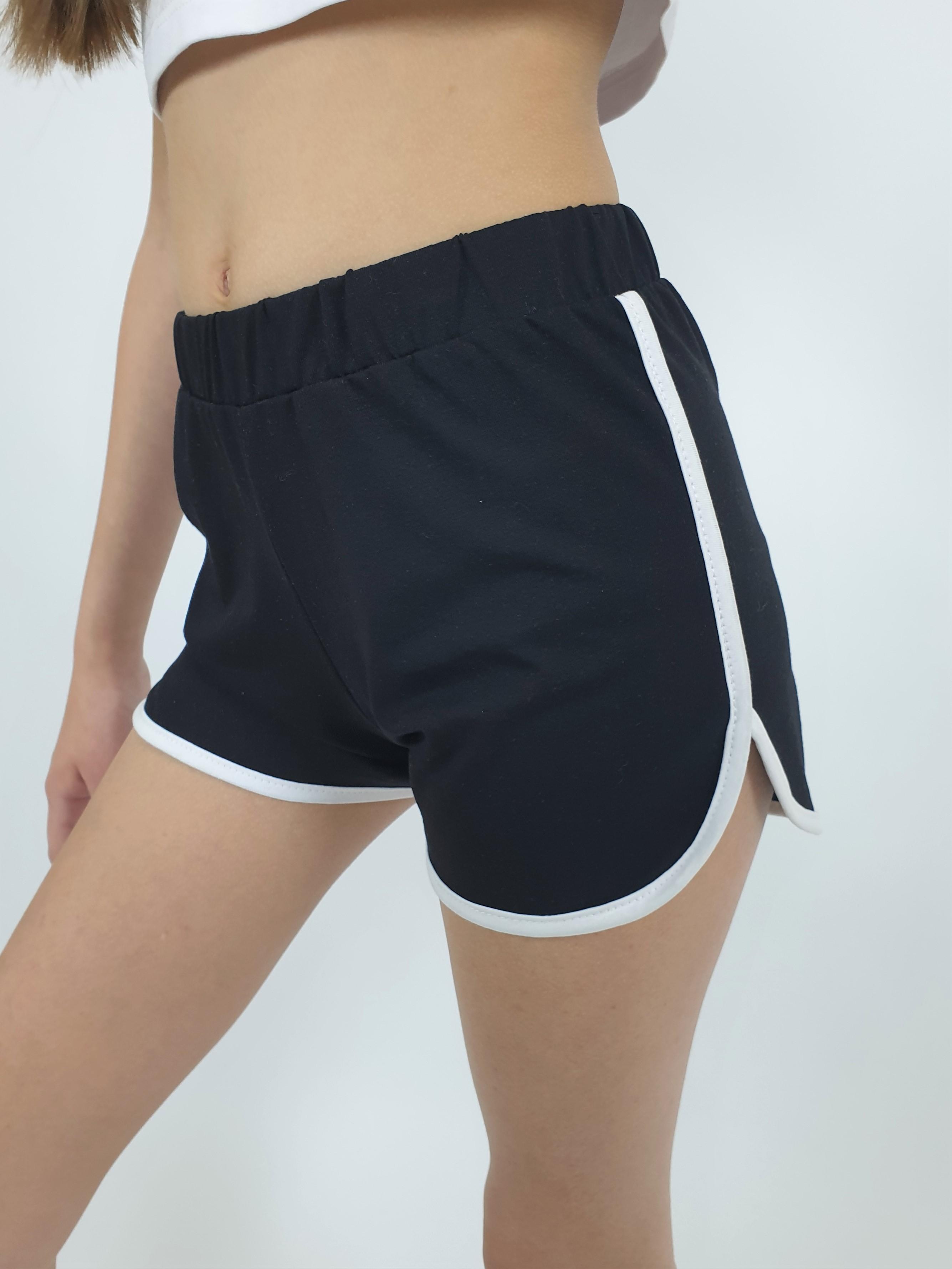 Шорты-короткие с притачным поясом и резинкой. Окантован боковой шов и низ изделия.