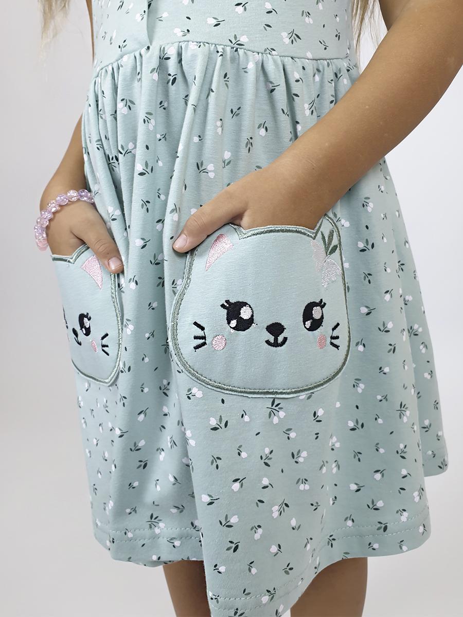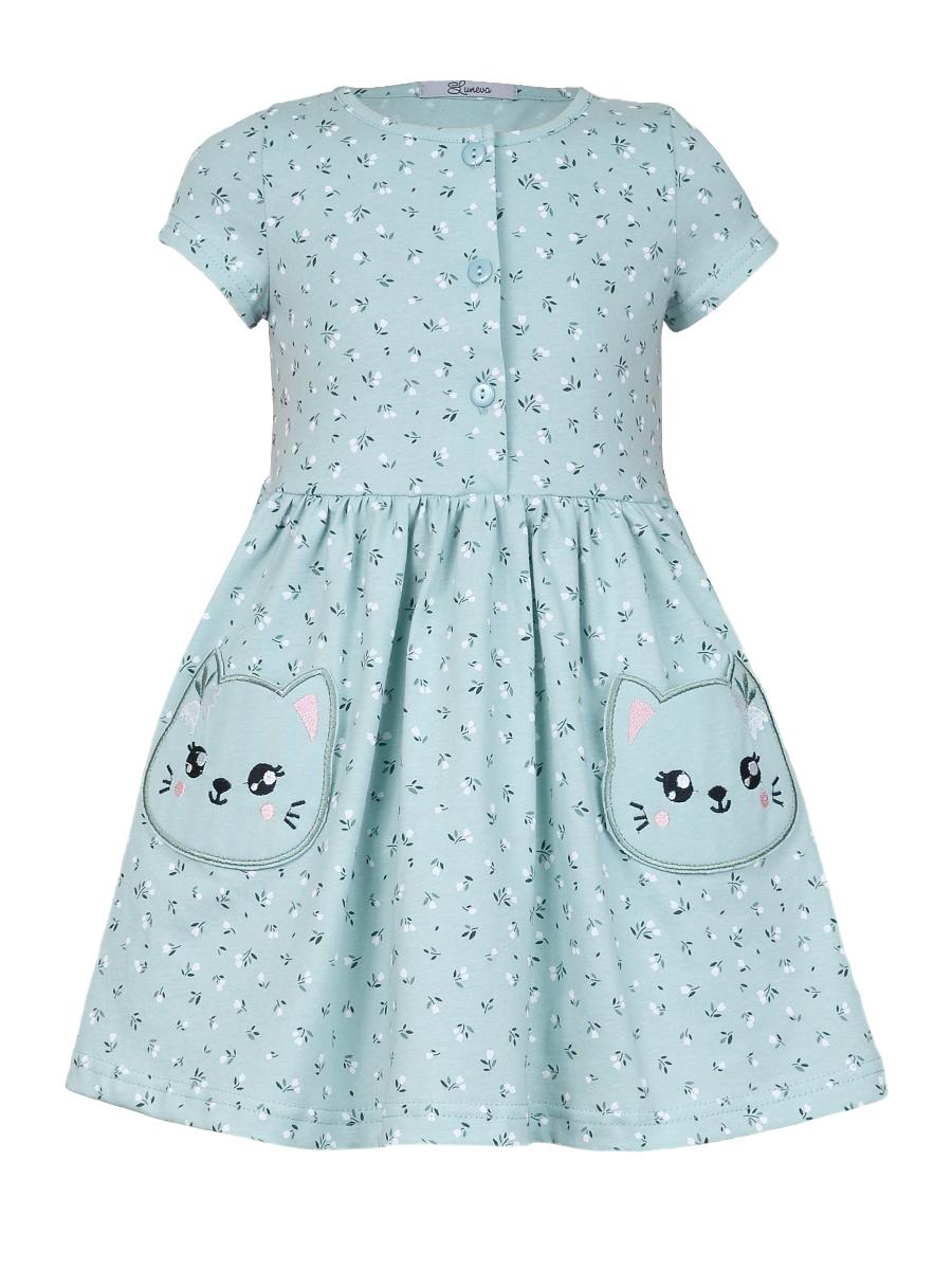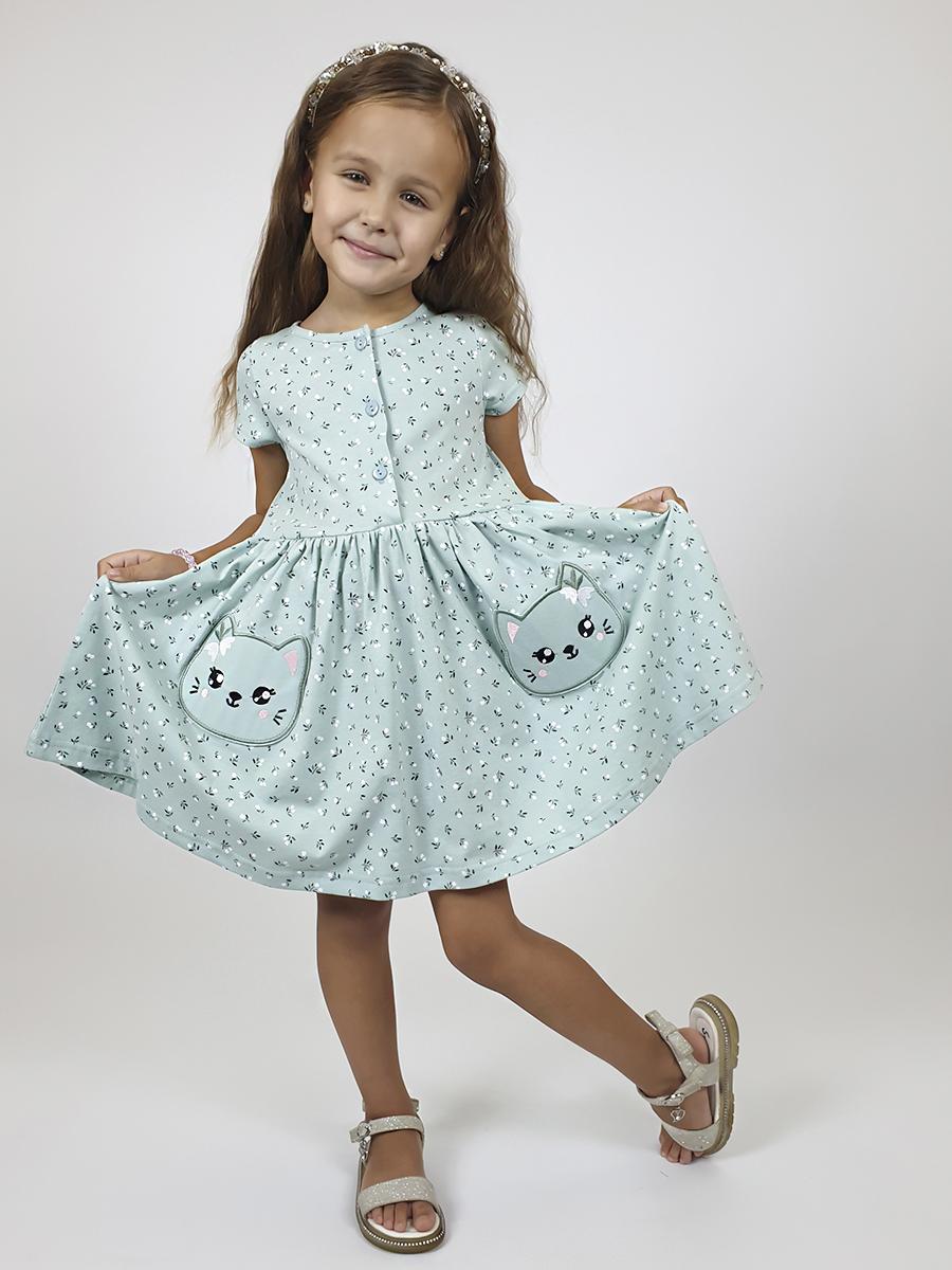 Летнее платье для девочки выполнено из качественного кулирного полотна. Модель – приталенного силуэта, декорирована оригинальными накладными карманами и удобной застежкой на пуговицы. Такое платье идеально подойдёт как на каждый день, так и при особых случаях. Материал легкий, приятный на ощупь, устойчивый к частым стиркам.