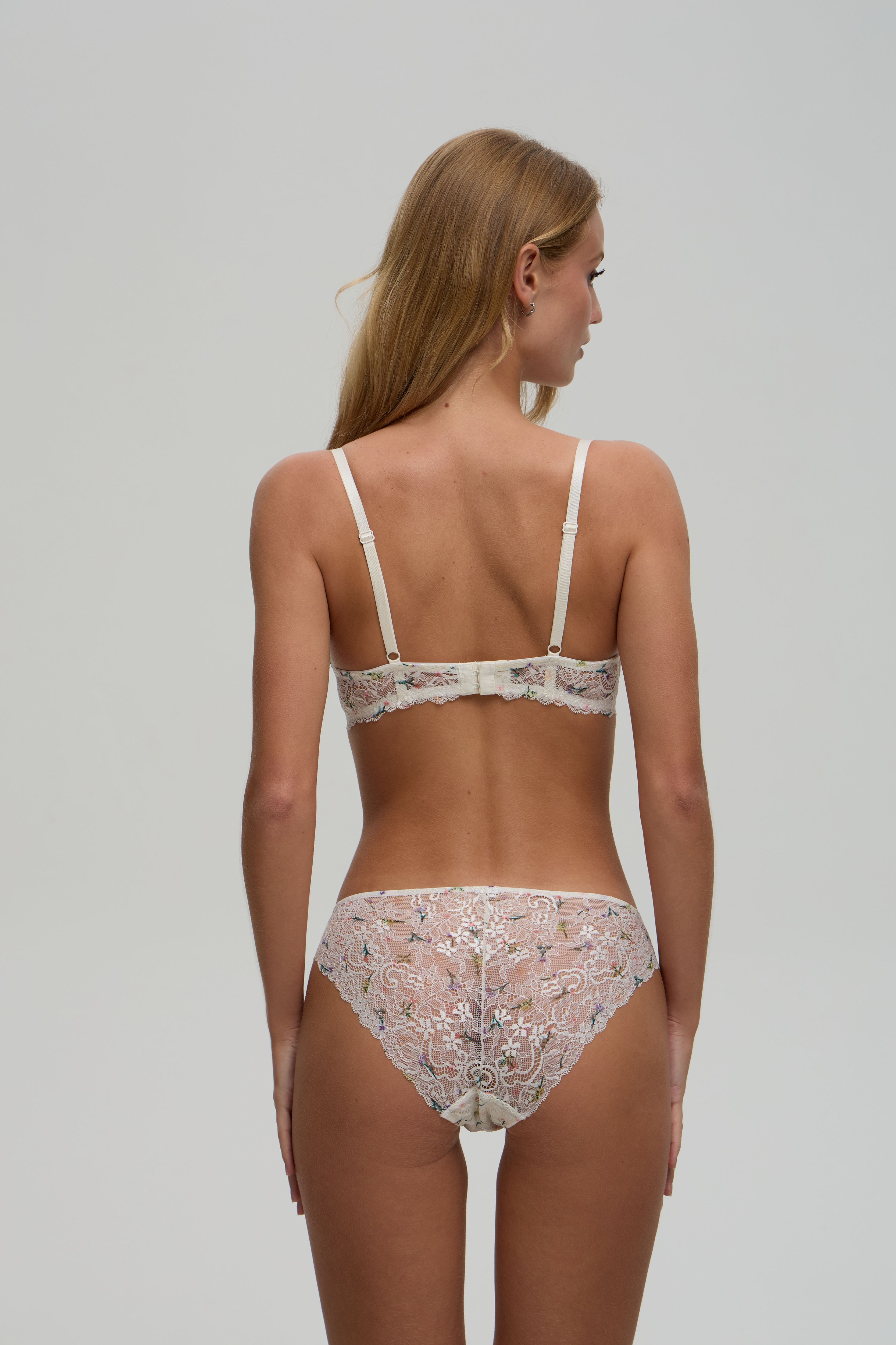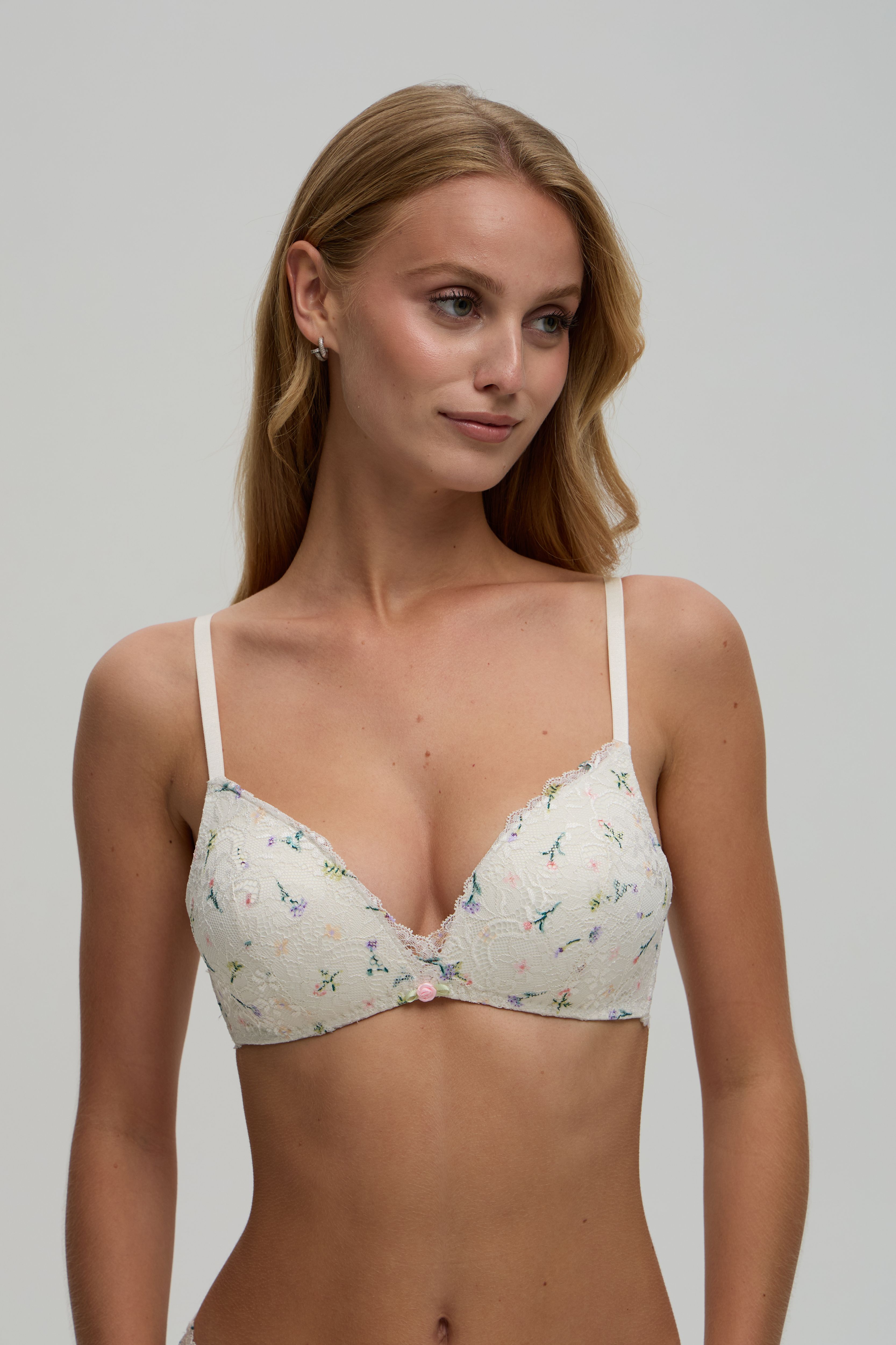 Бюстгальтер Padded Triangle bra выполнен из принтованного кружевного полотна. Формованная чашка с super push up без каркасов. Бретели регцлируемые не отстегивающиеся. Застежка на два крючка и три ряда петель.