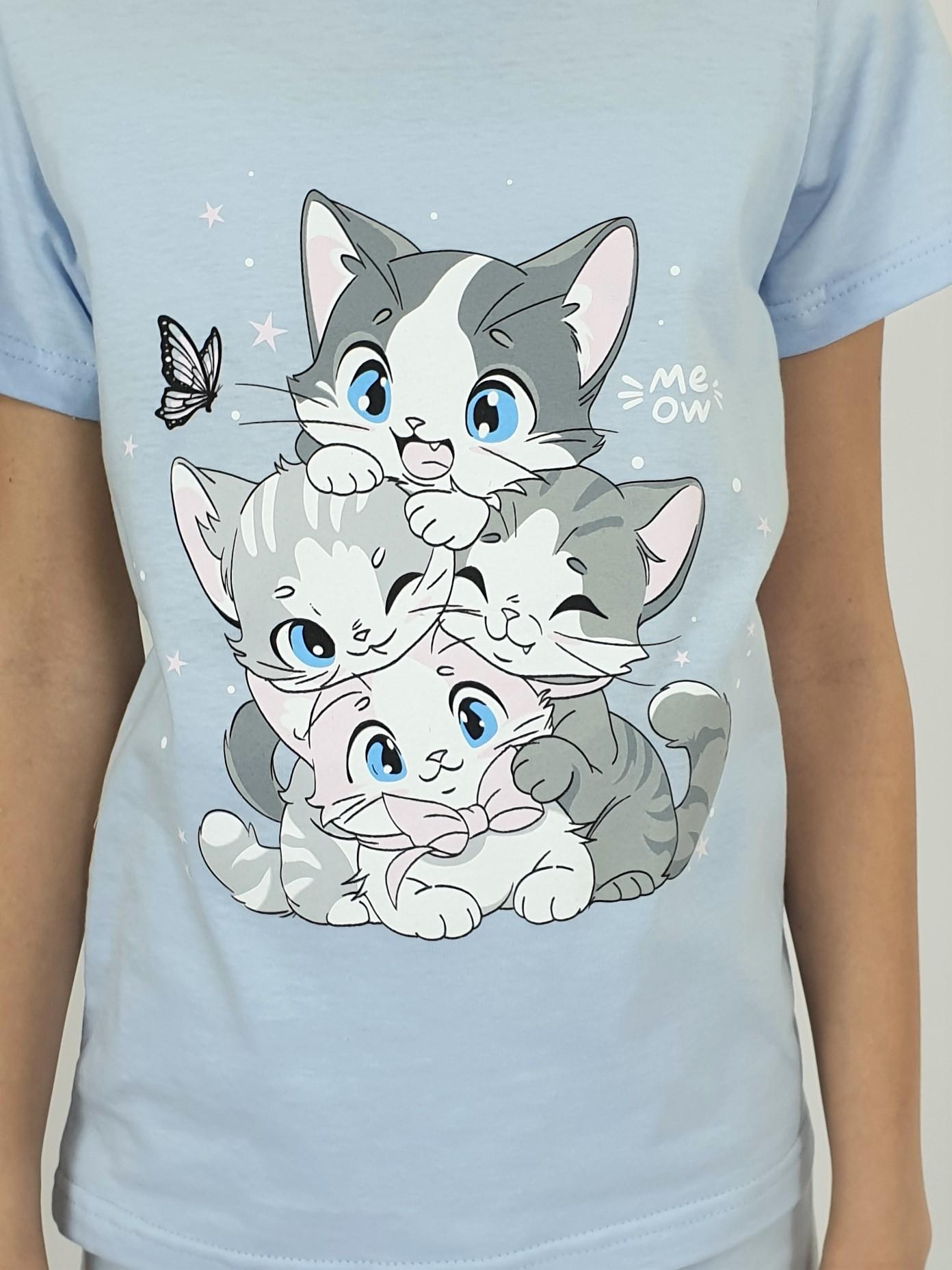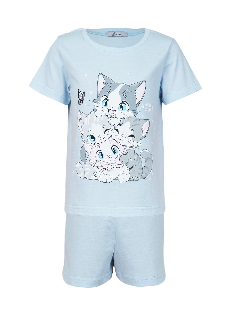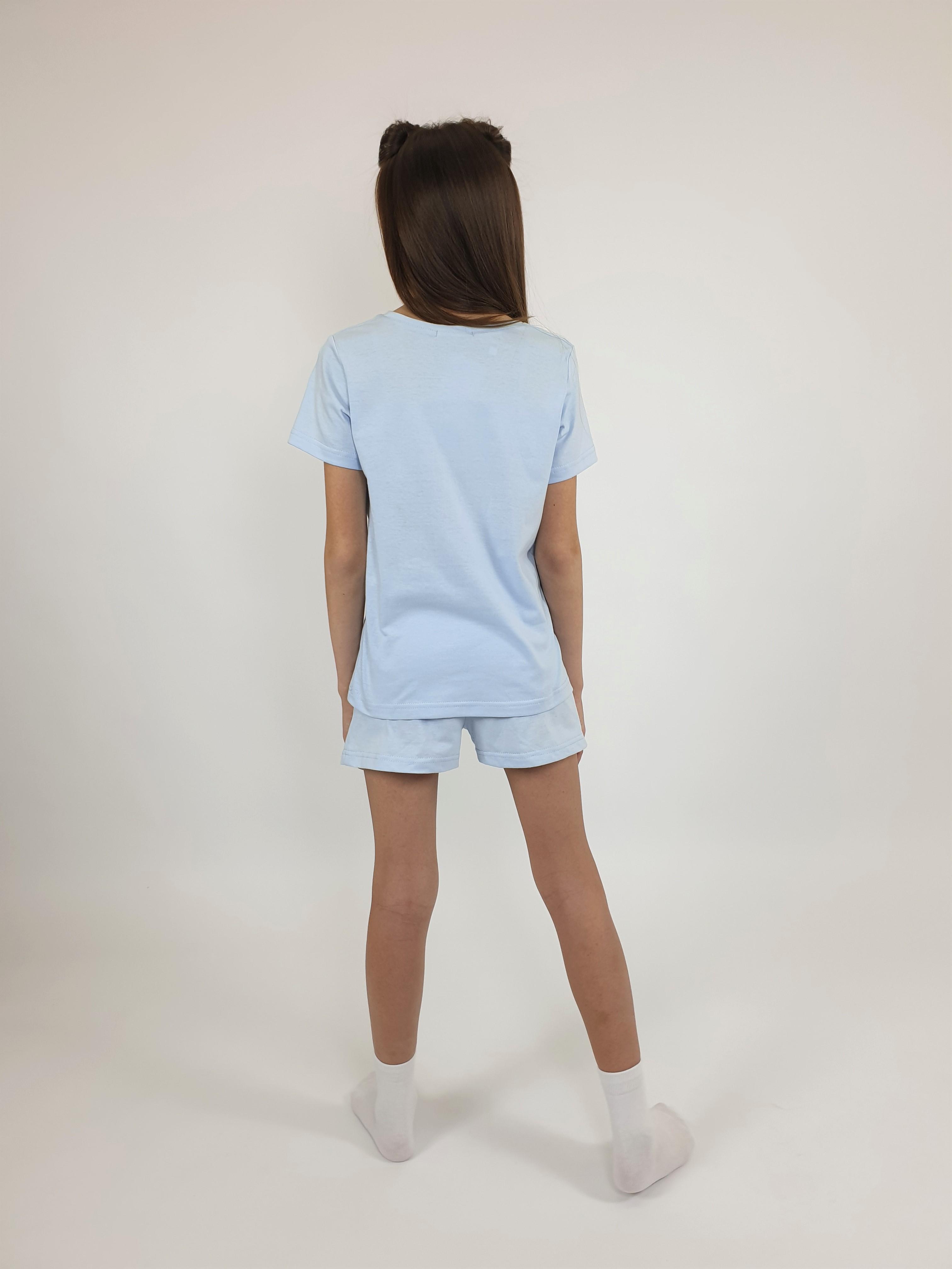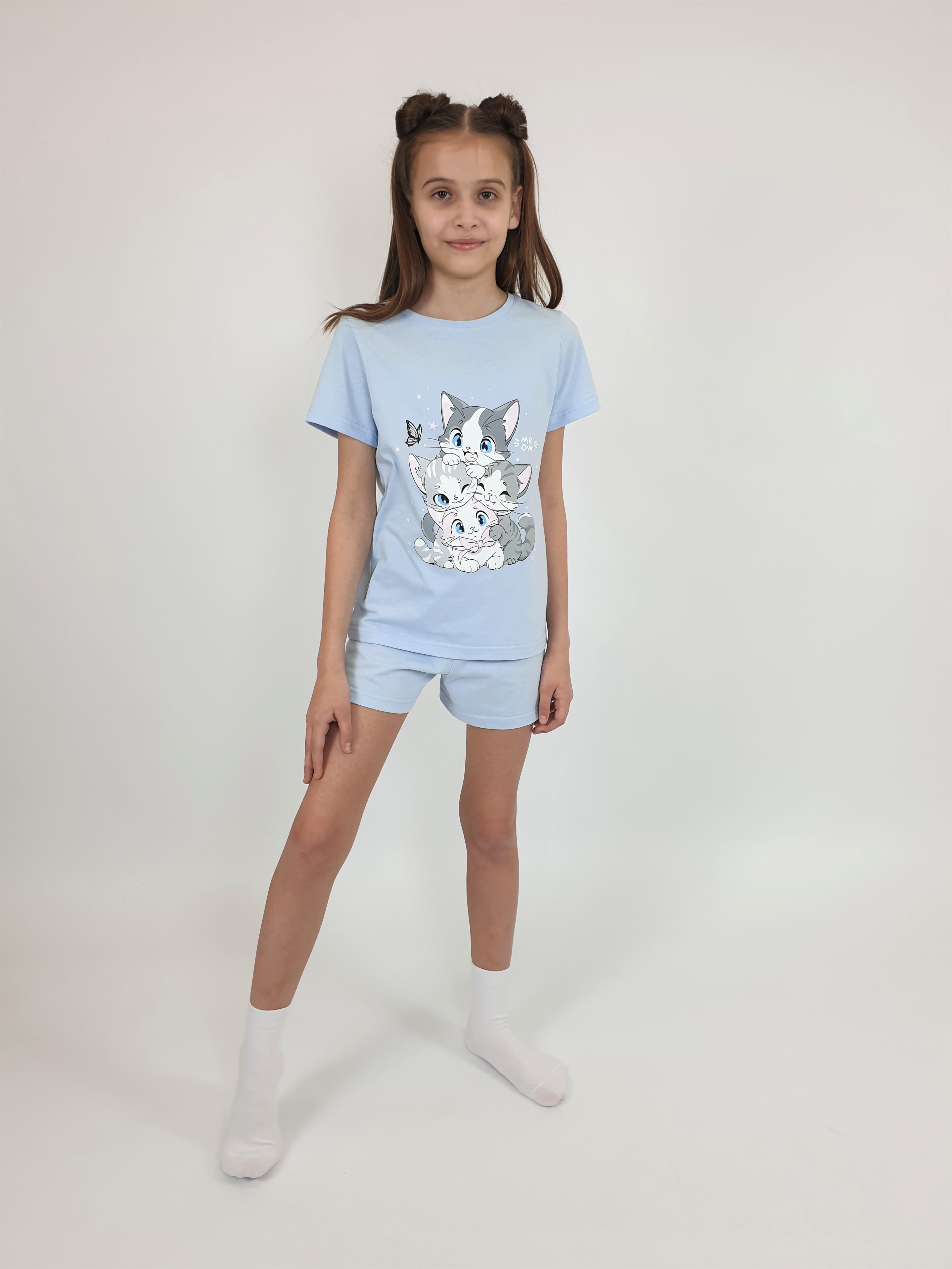 Кулирное полотно:100% х/б. Фуфайка-прямая,рукав втачной,короткий.Горловина обработана планкой.Печать на переде. Шорты-короткие на резинке,низ подшит.