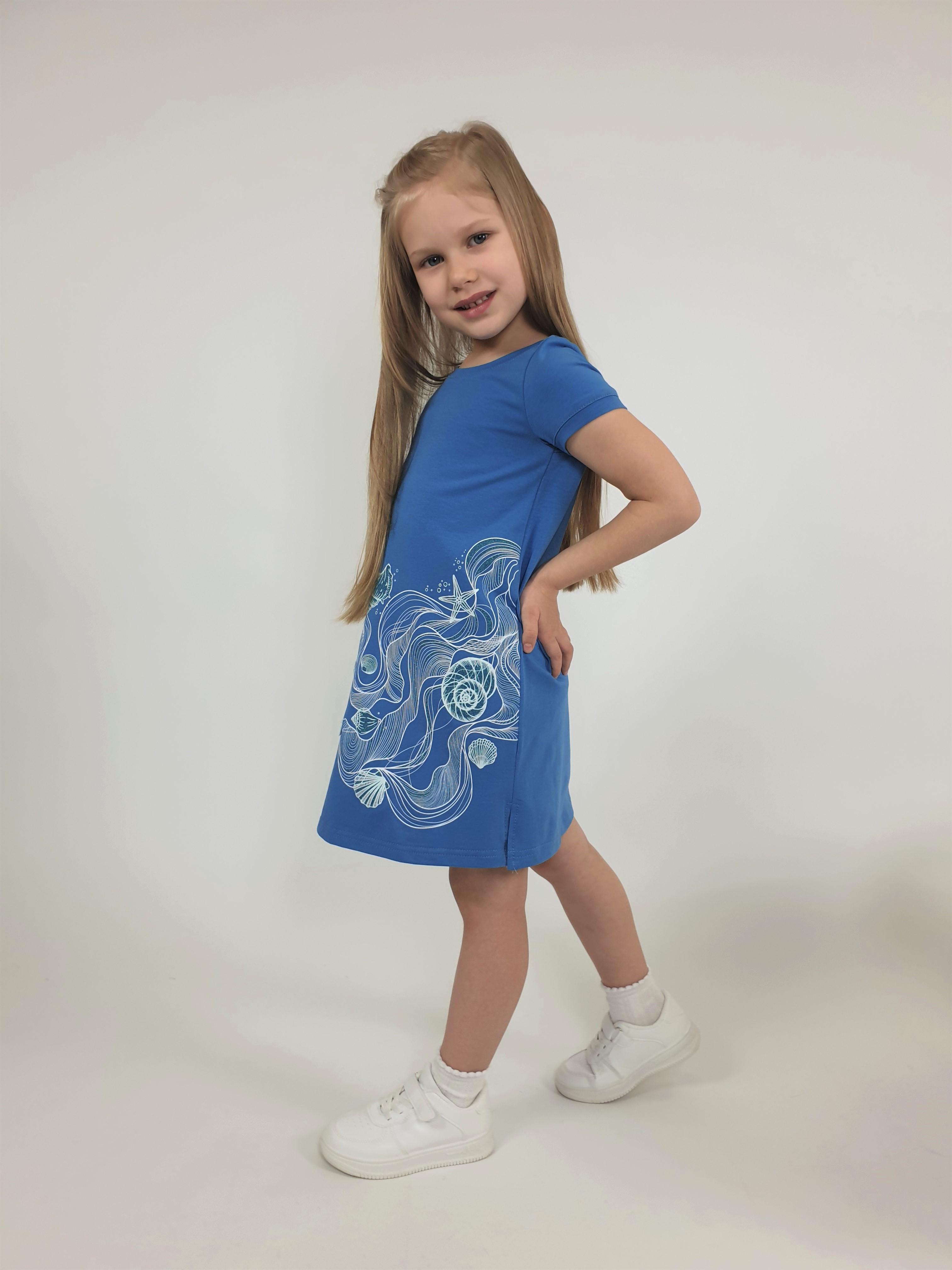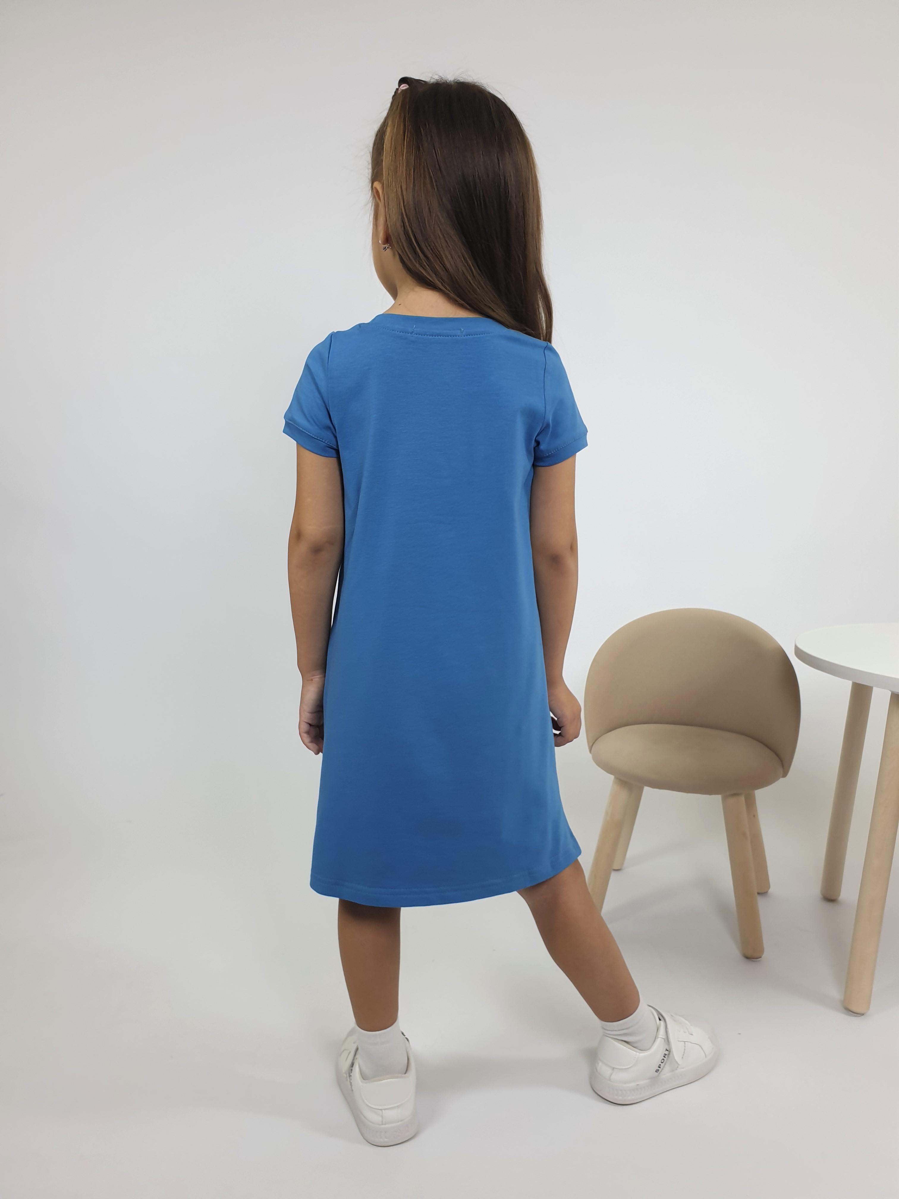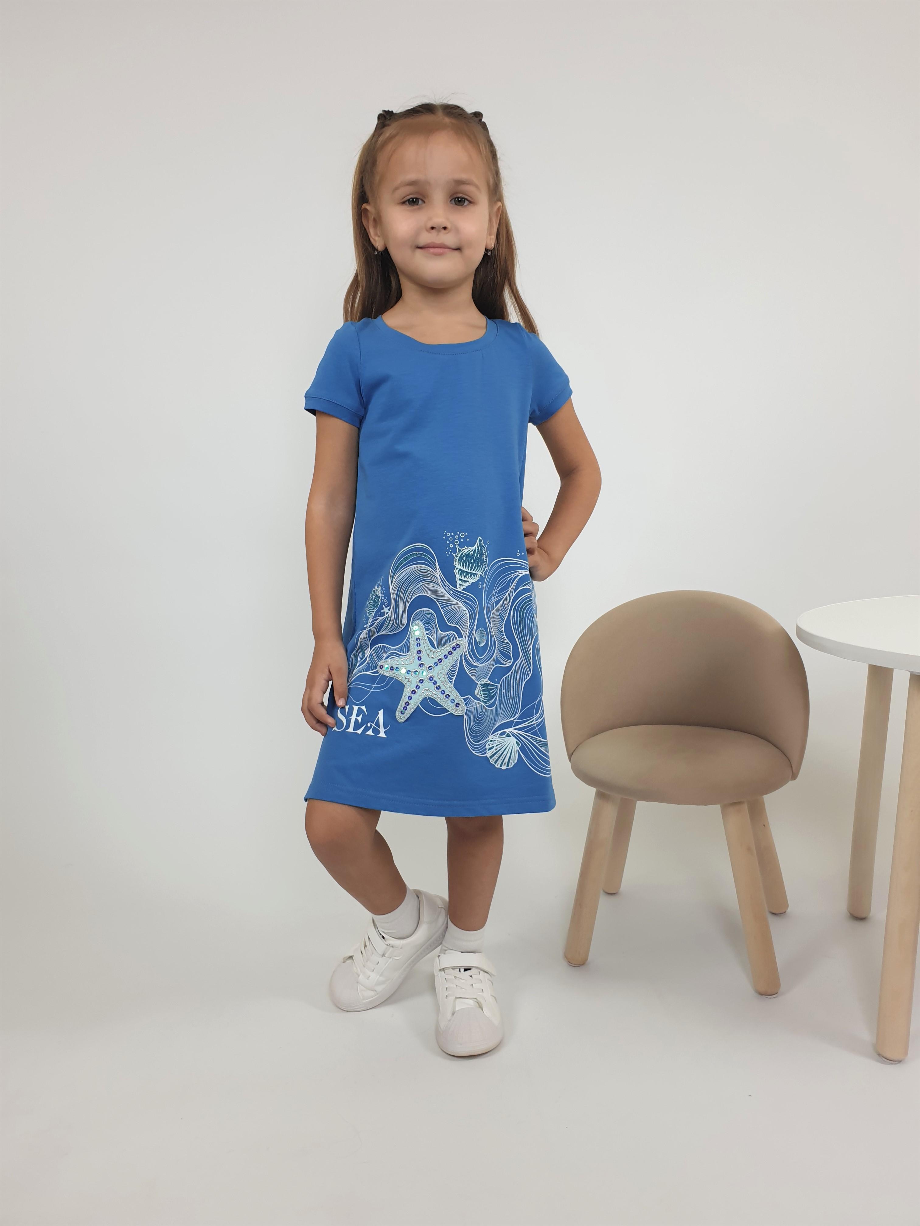 Кулирное полотно:95% х/б.,5% лайкра. Платье-силуэт трапеция,короткий втачной рукав на манжете.Перед с печатью и вышивкой-пайетки,сбоку разрезы,отделочный элемент "звездочка".Горловина обработана планкой.
