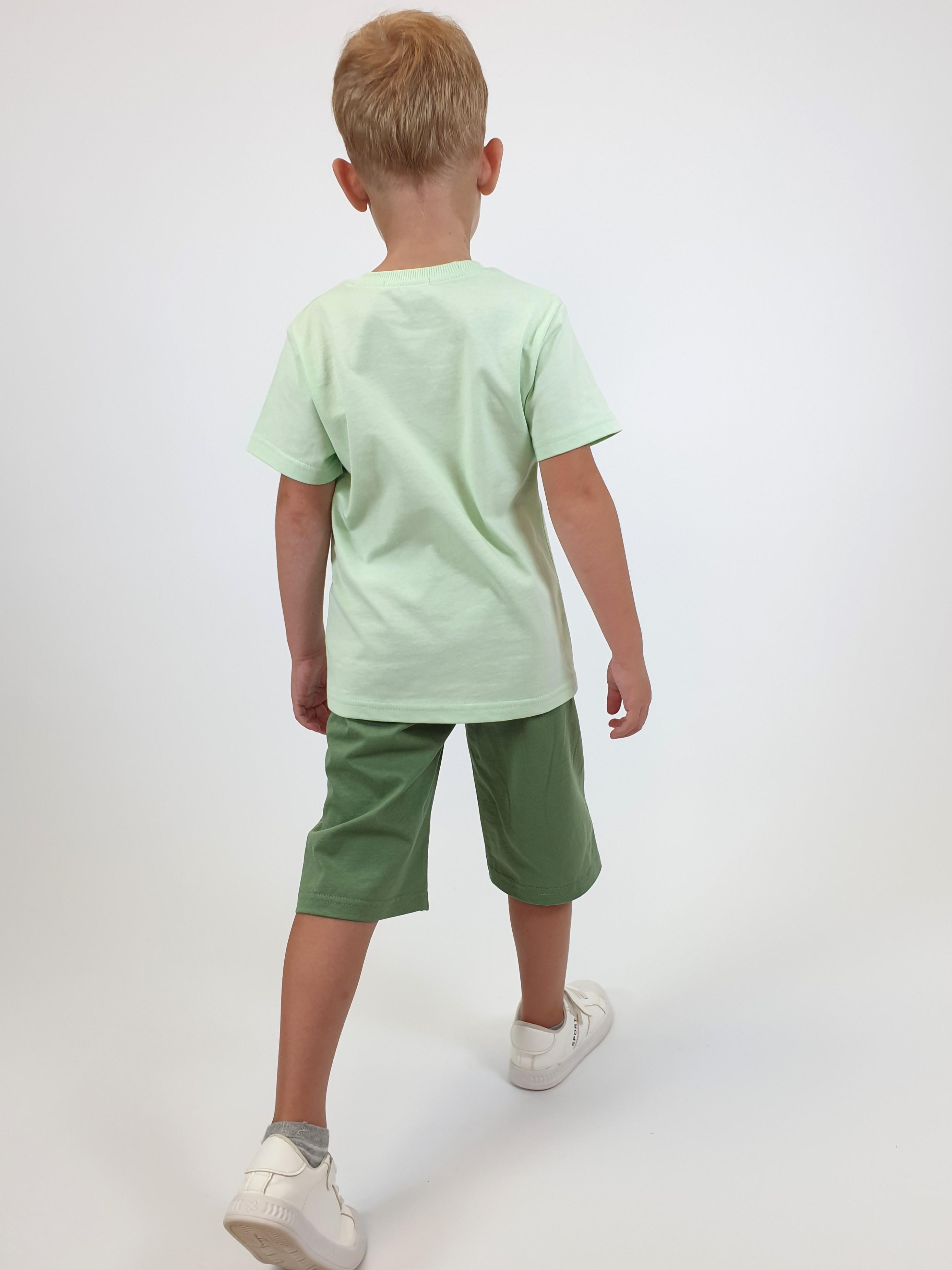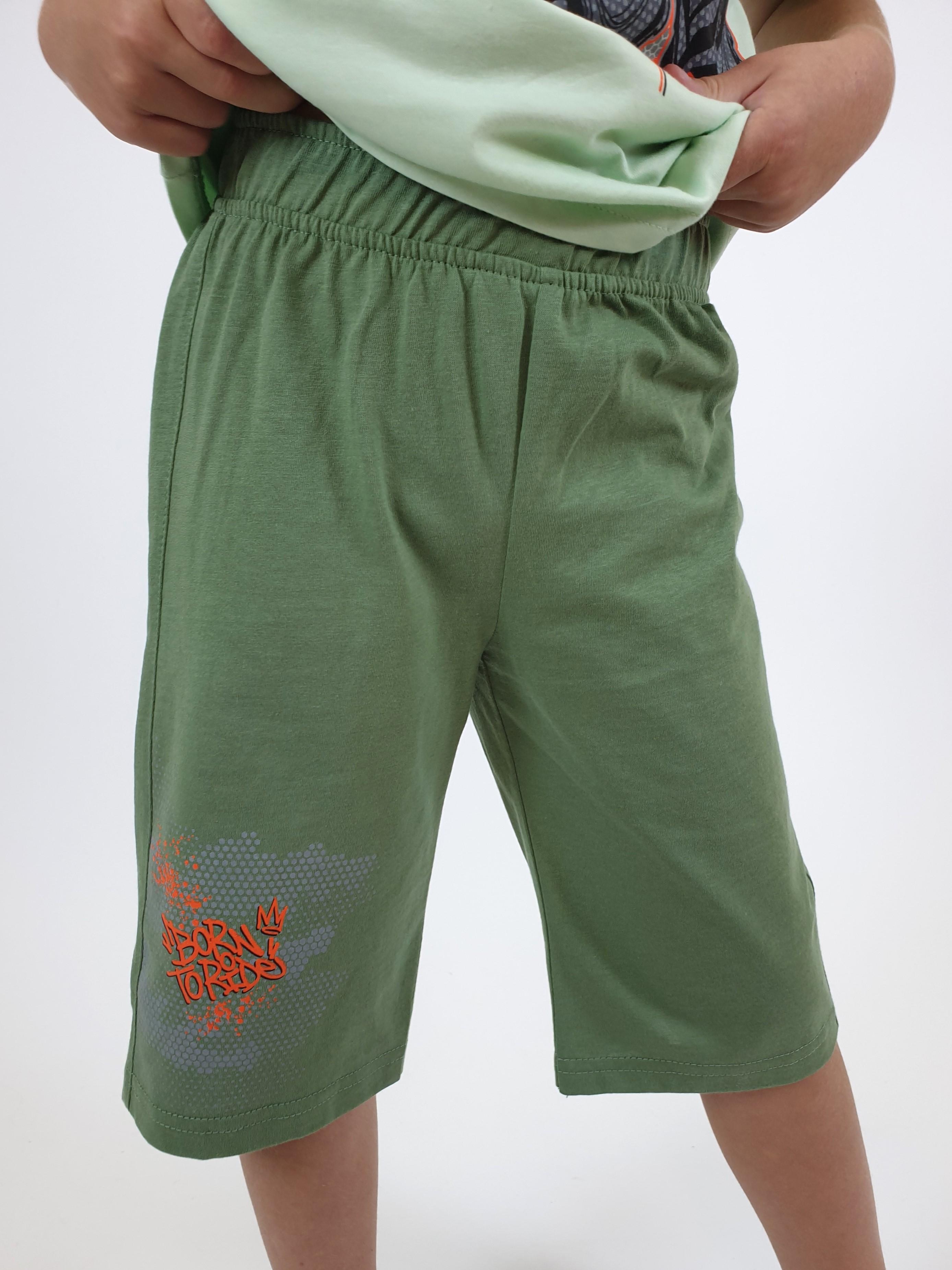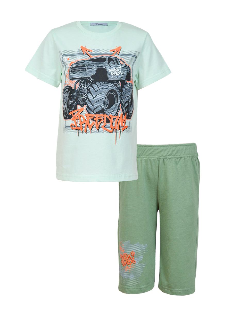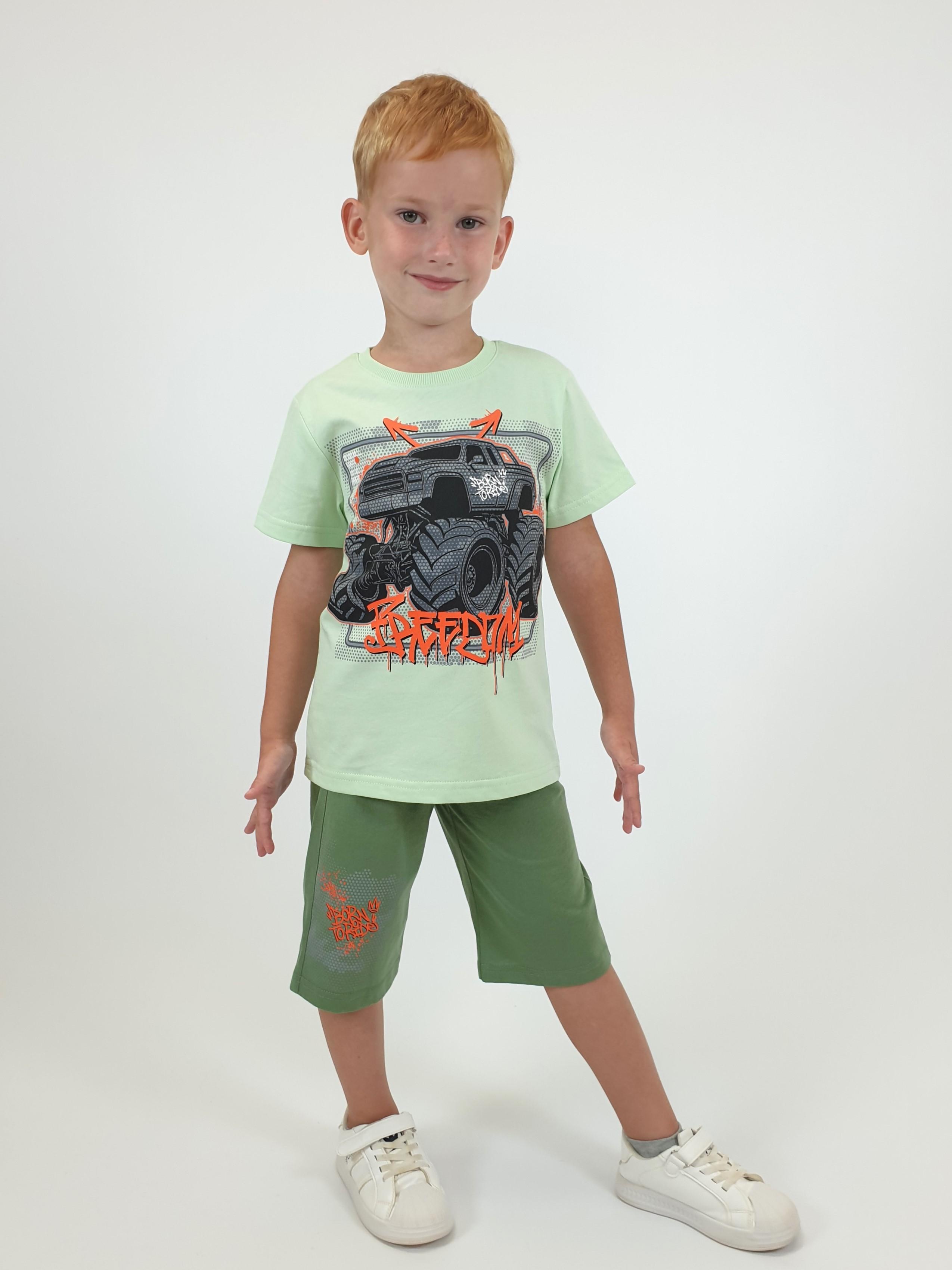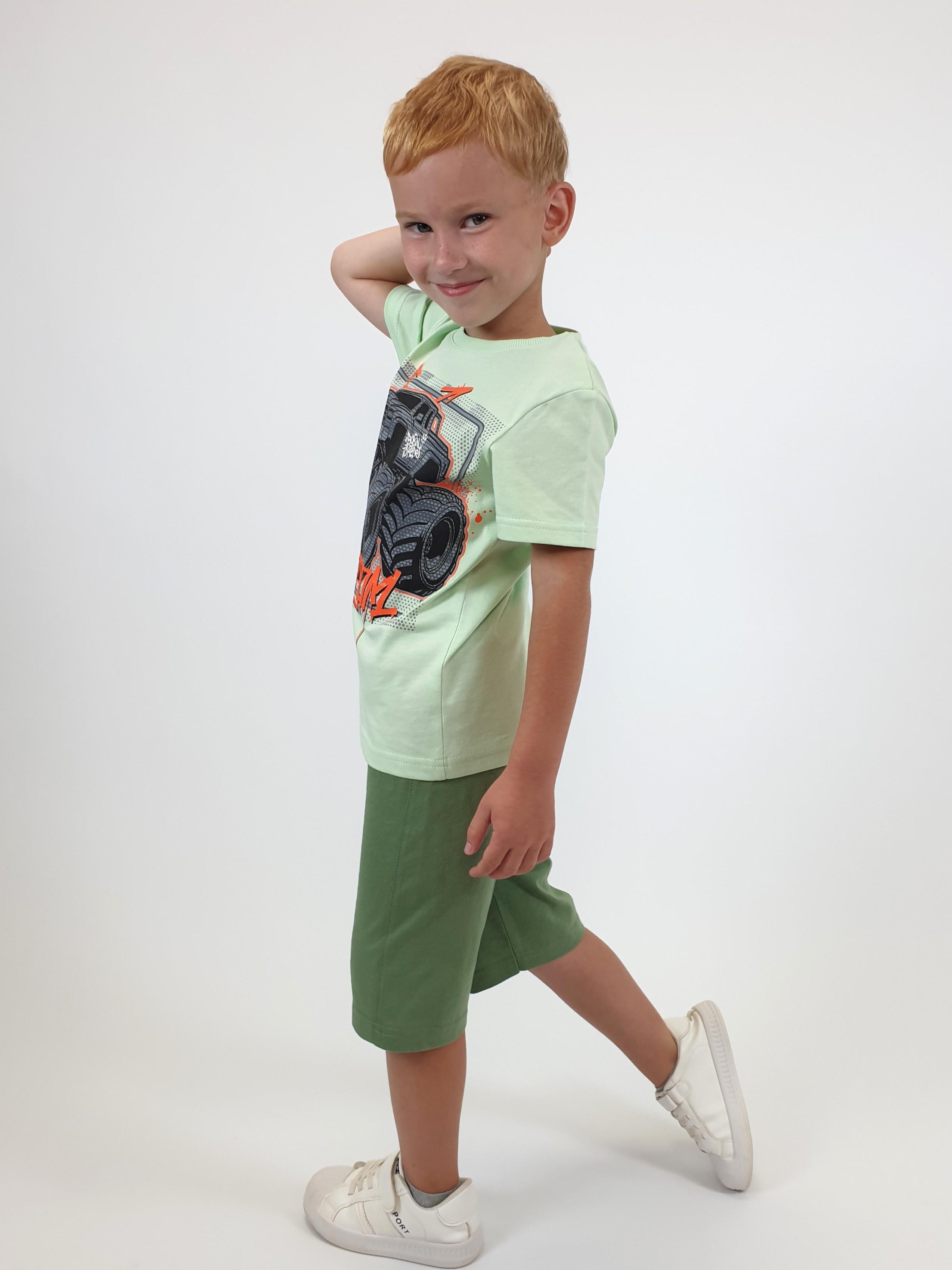 Кулирное полотно: 100% х/б. Джемпер-прямой,короткий втачной рукав,перед с печатью.Горловина обработана ластиком. Шорты-удлиненные с притачным поясом и резинкой,печать на передней правой половинке.