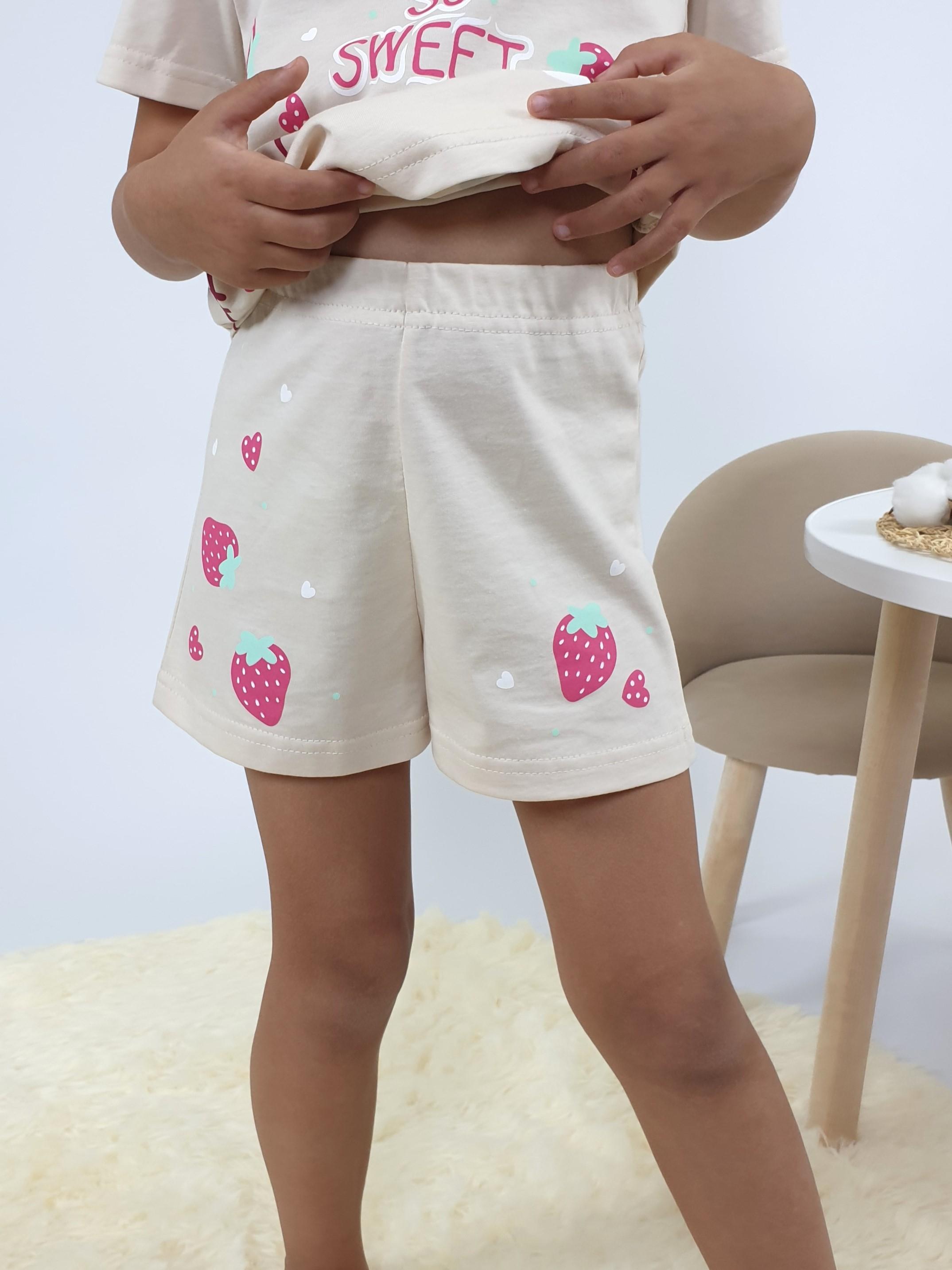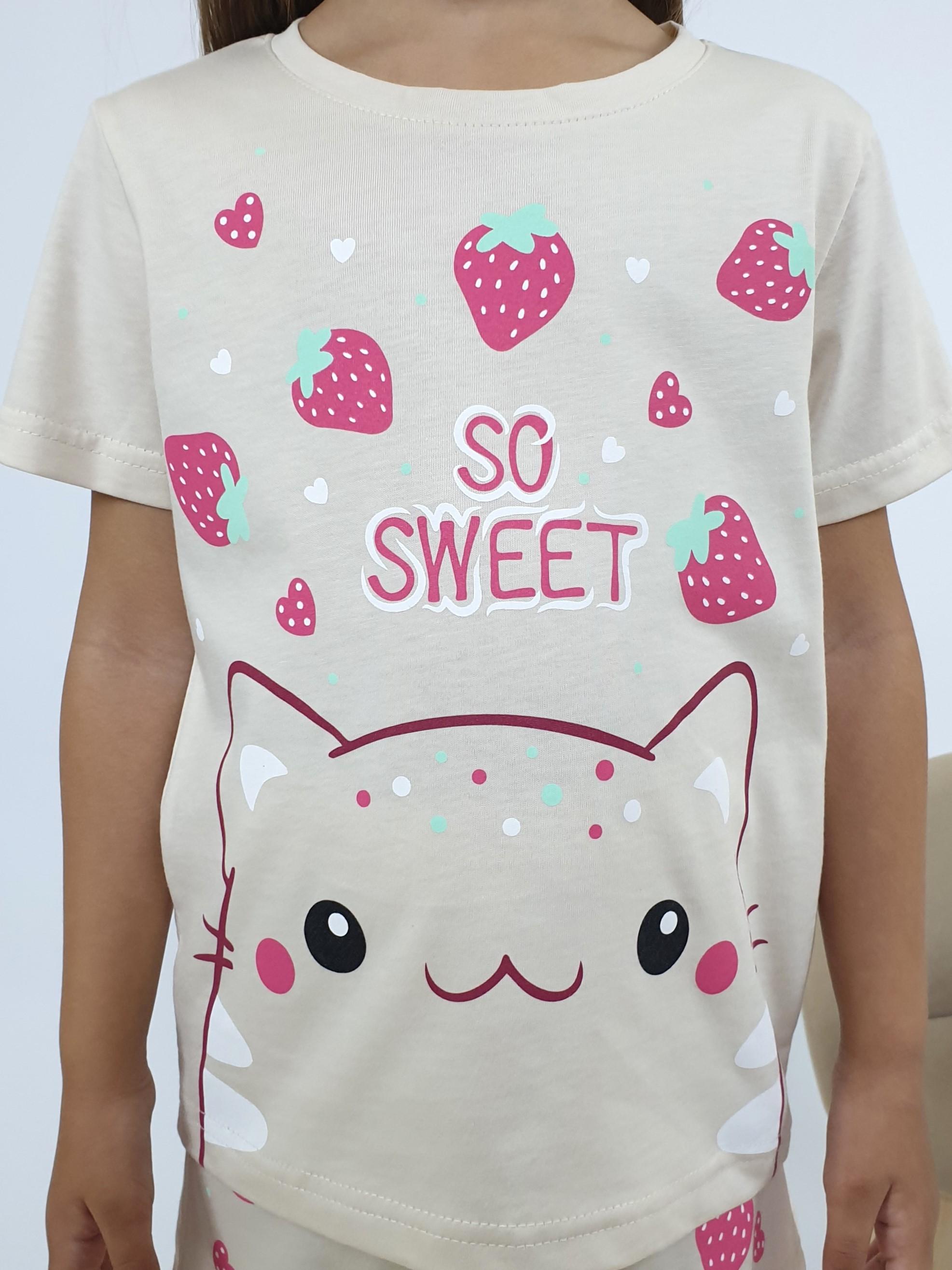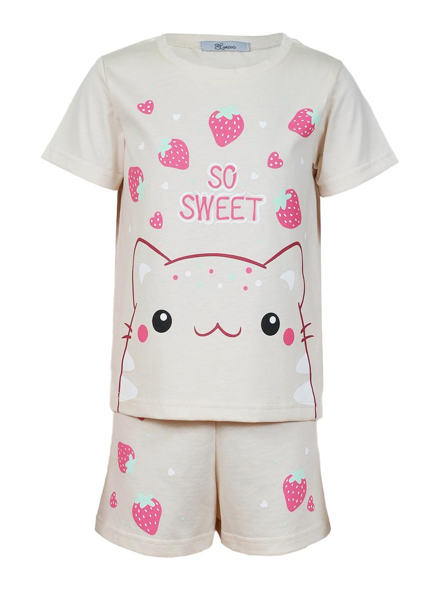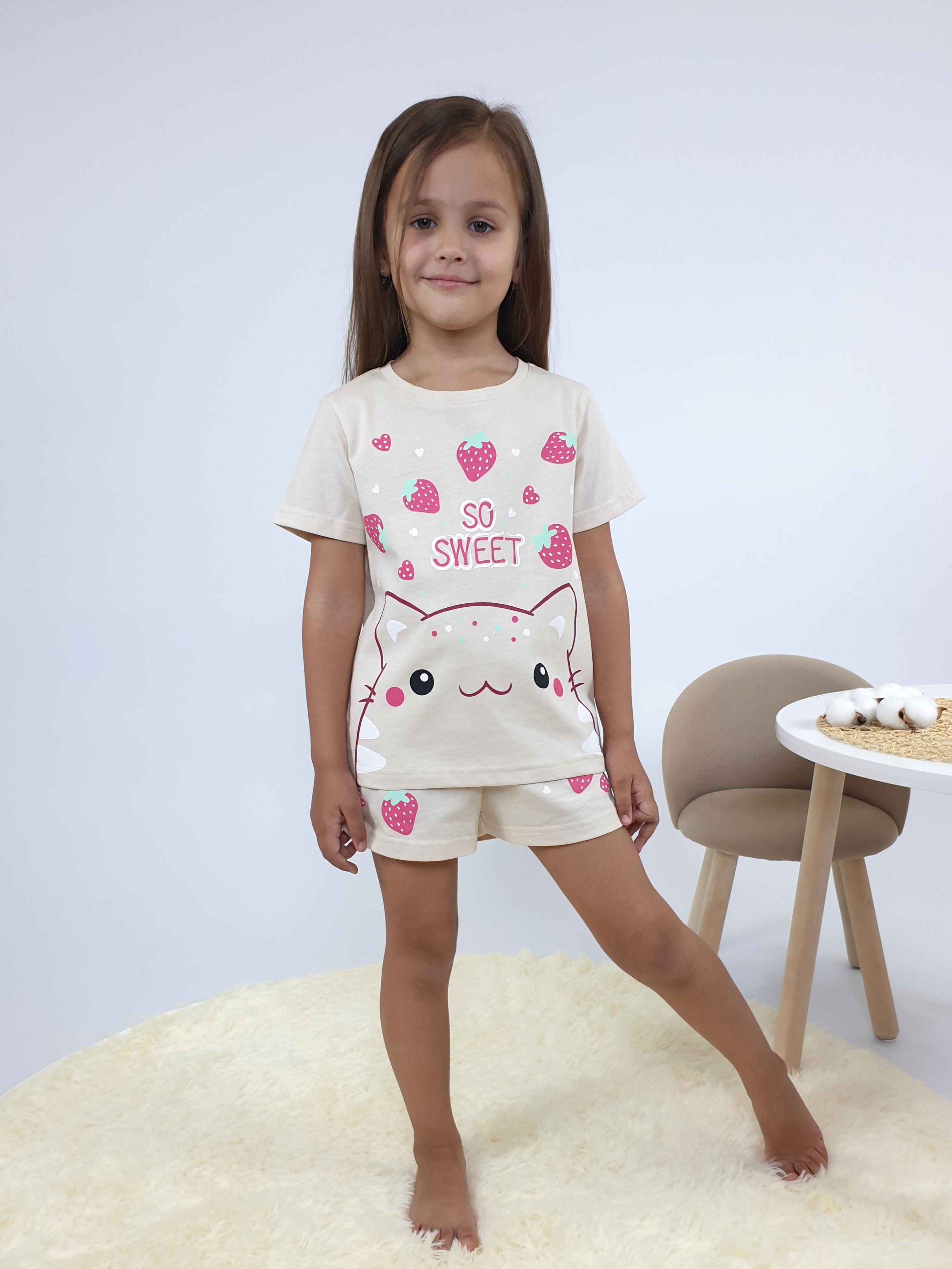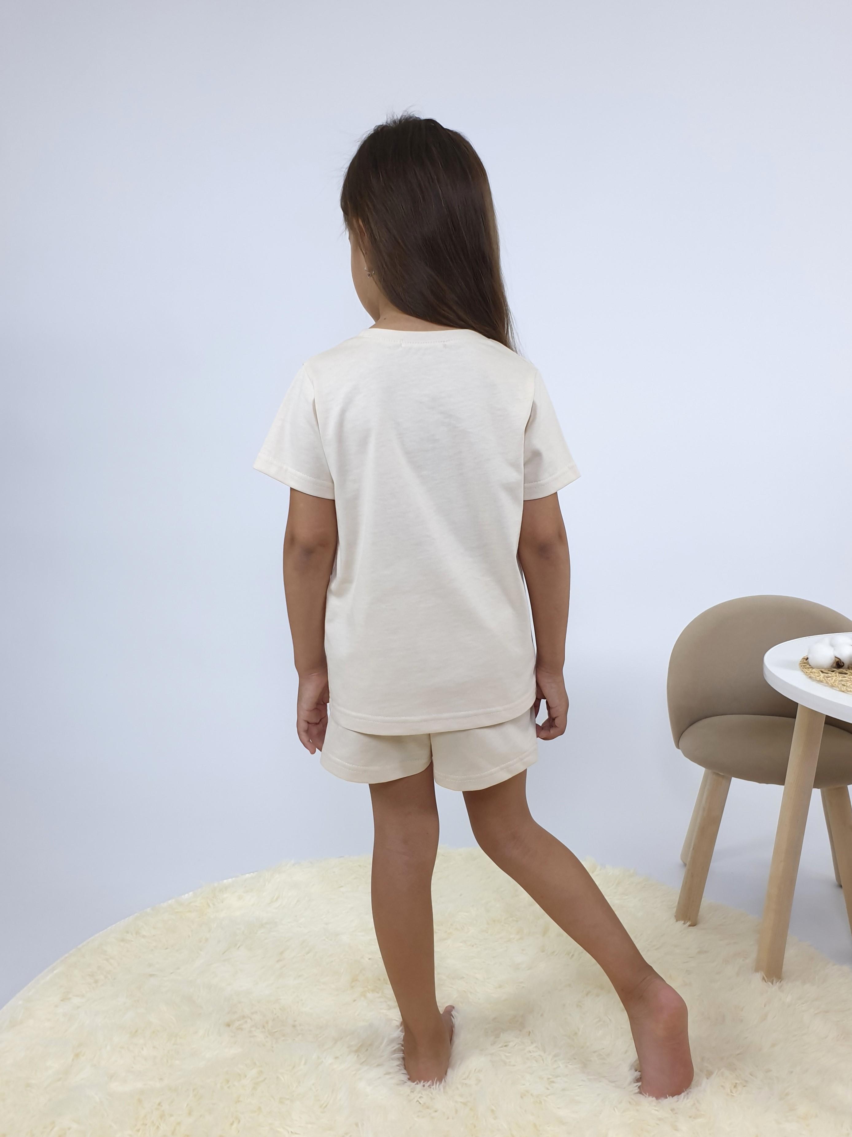 Кулирное полотно:100% х/б. Фуфайка(пижамная)-прямая,рукав втачной,короткий.Горловина обработана планкой.Печать на переде. Шорты(пижамные)-короткие на резинке,низ подшит.Печать на передних половинках.